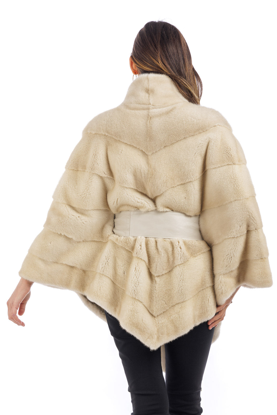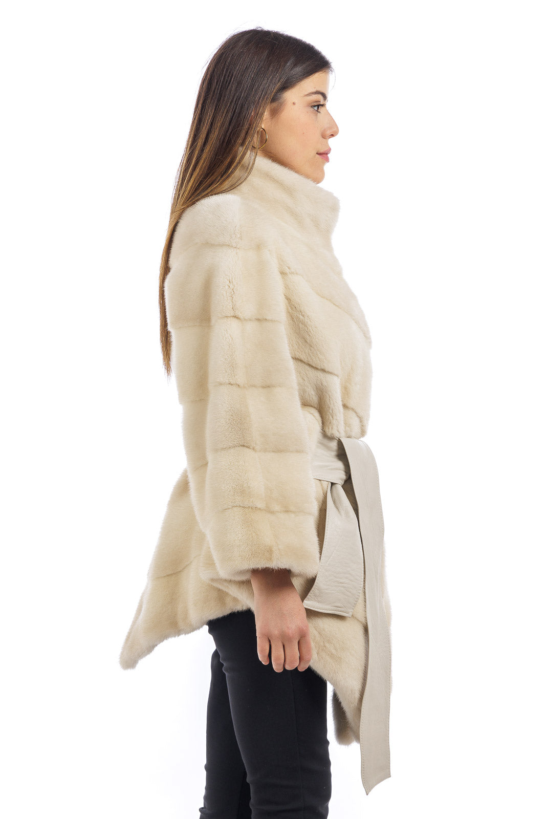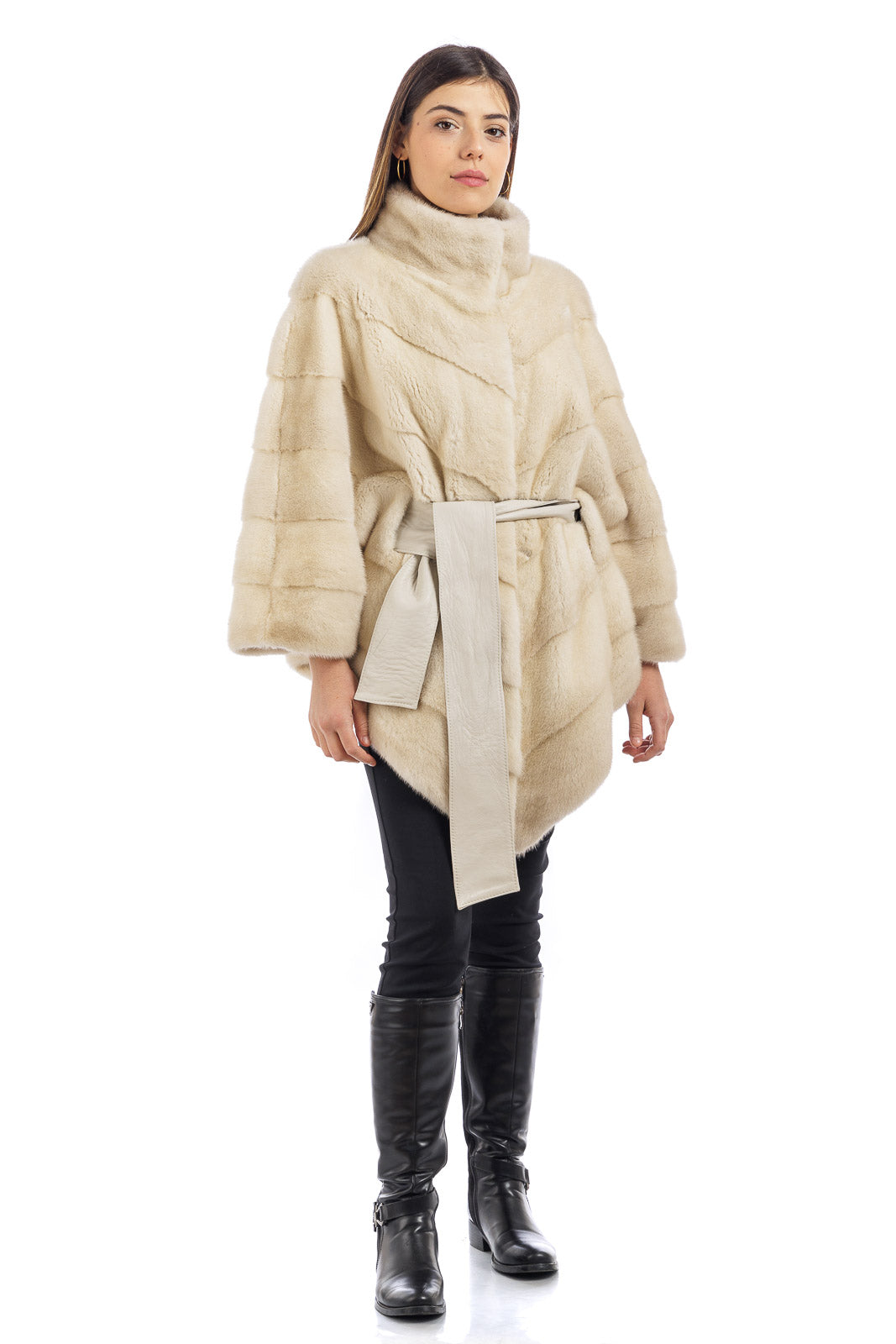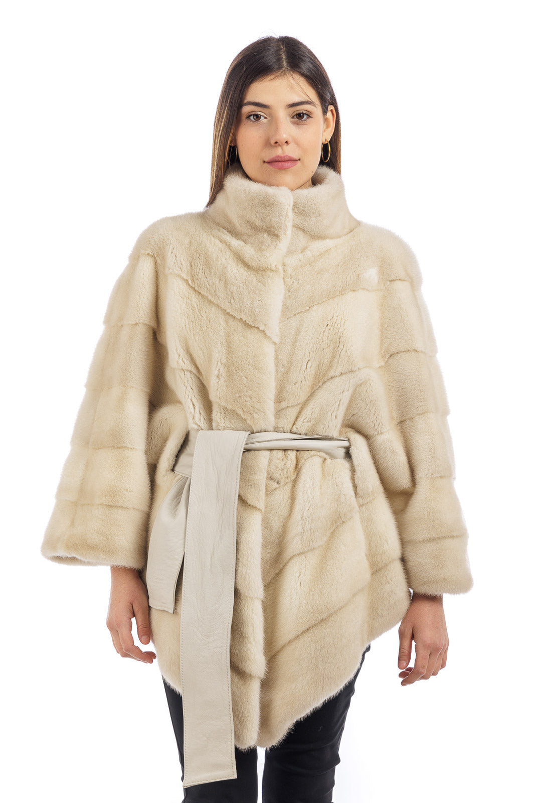 Mantella in pelliccia di Visone perla con cintura annodata in pelle