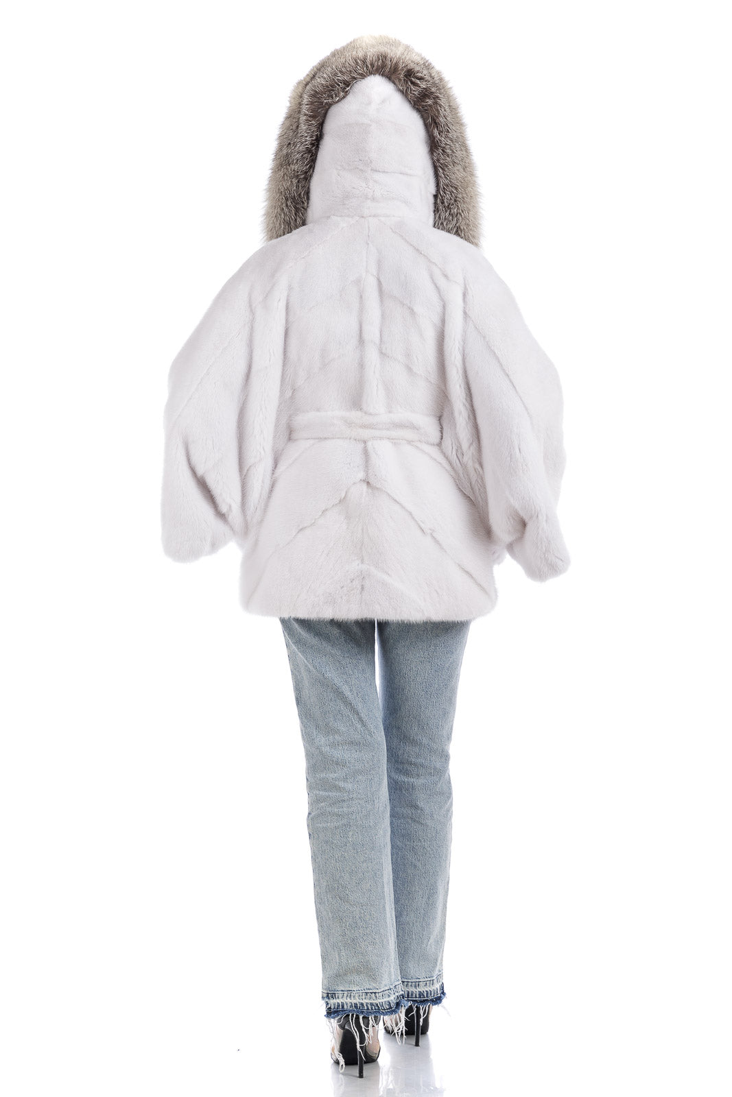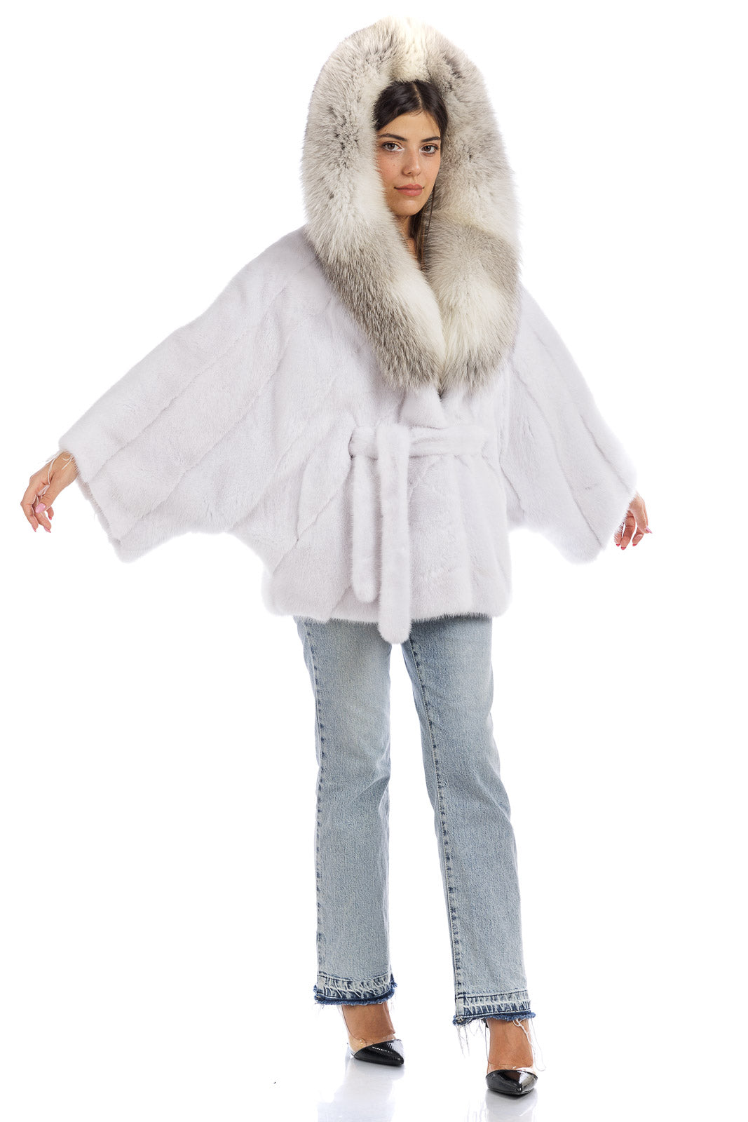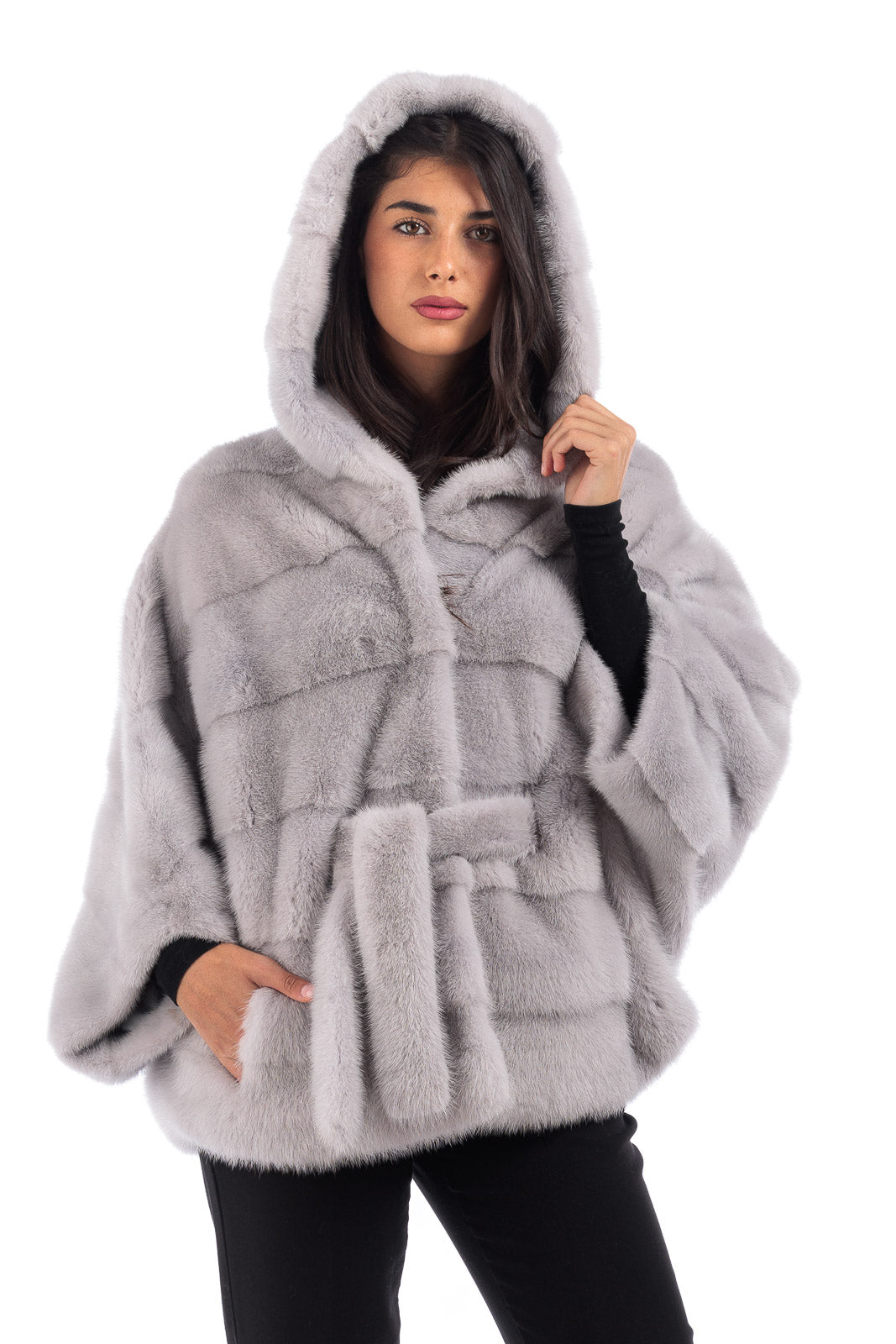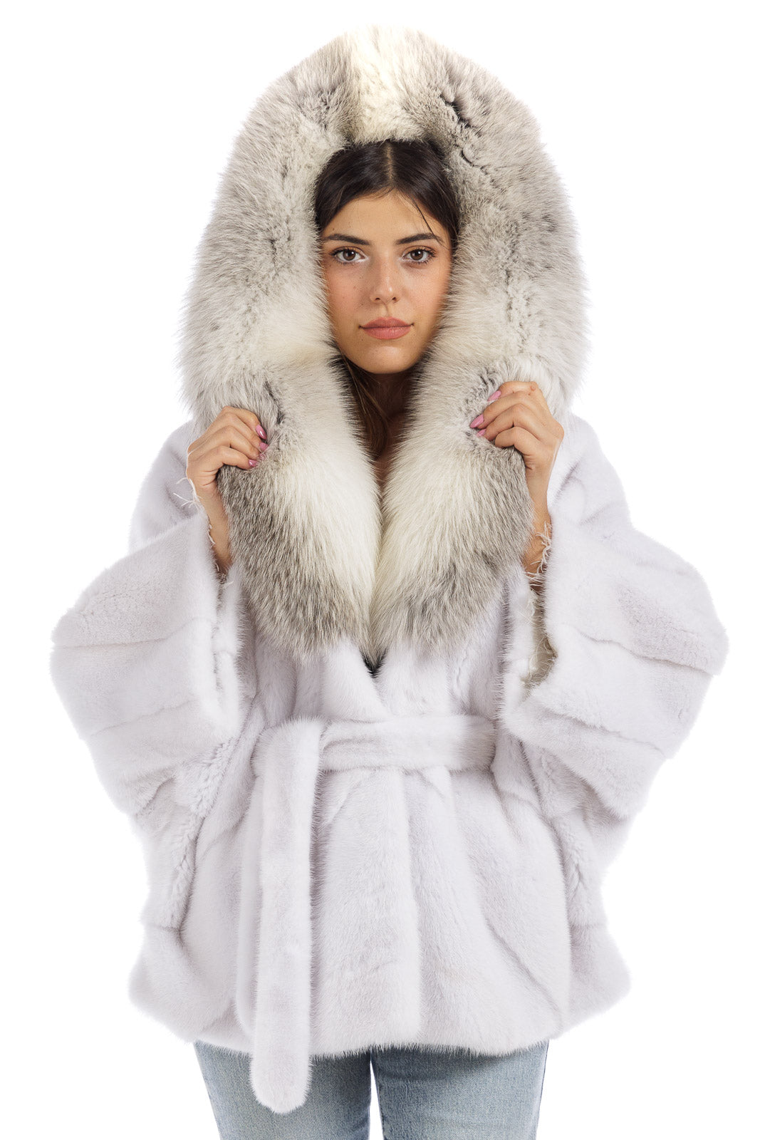Mantella in pelliccia di Visone ghiaccio con cappuccio e cintura in visone