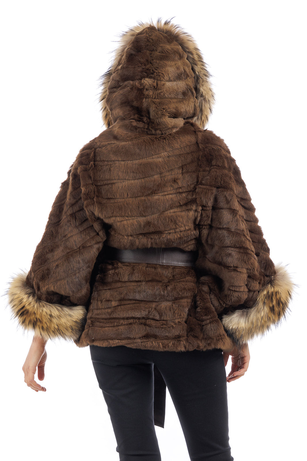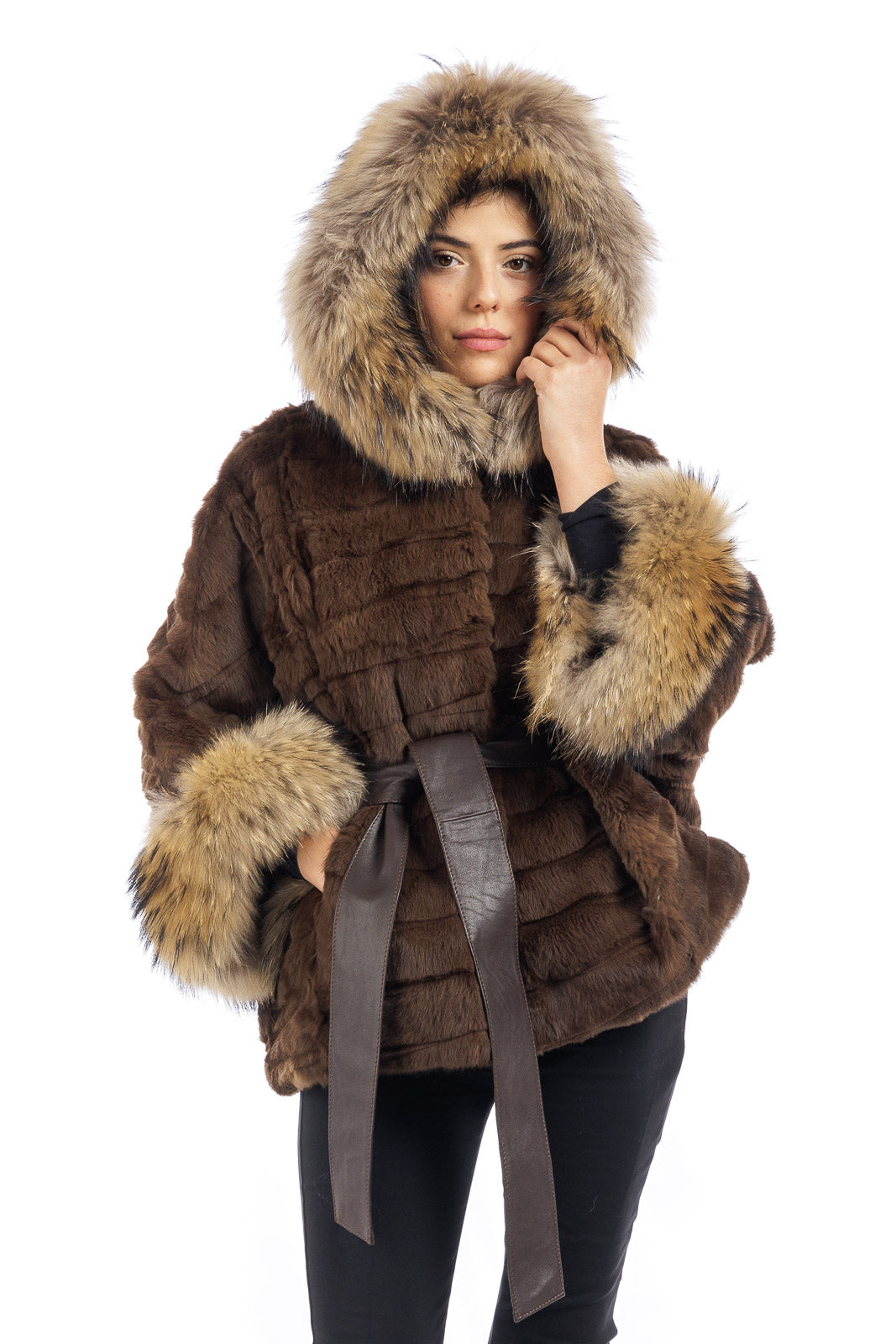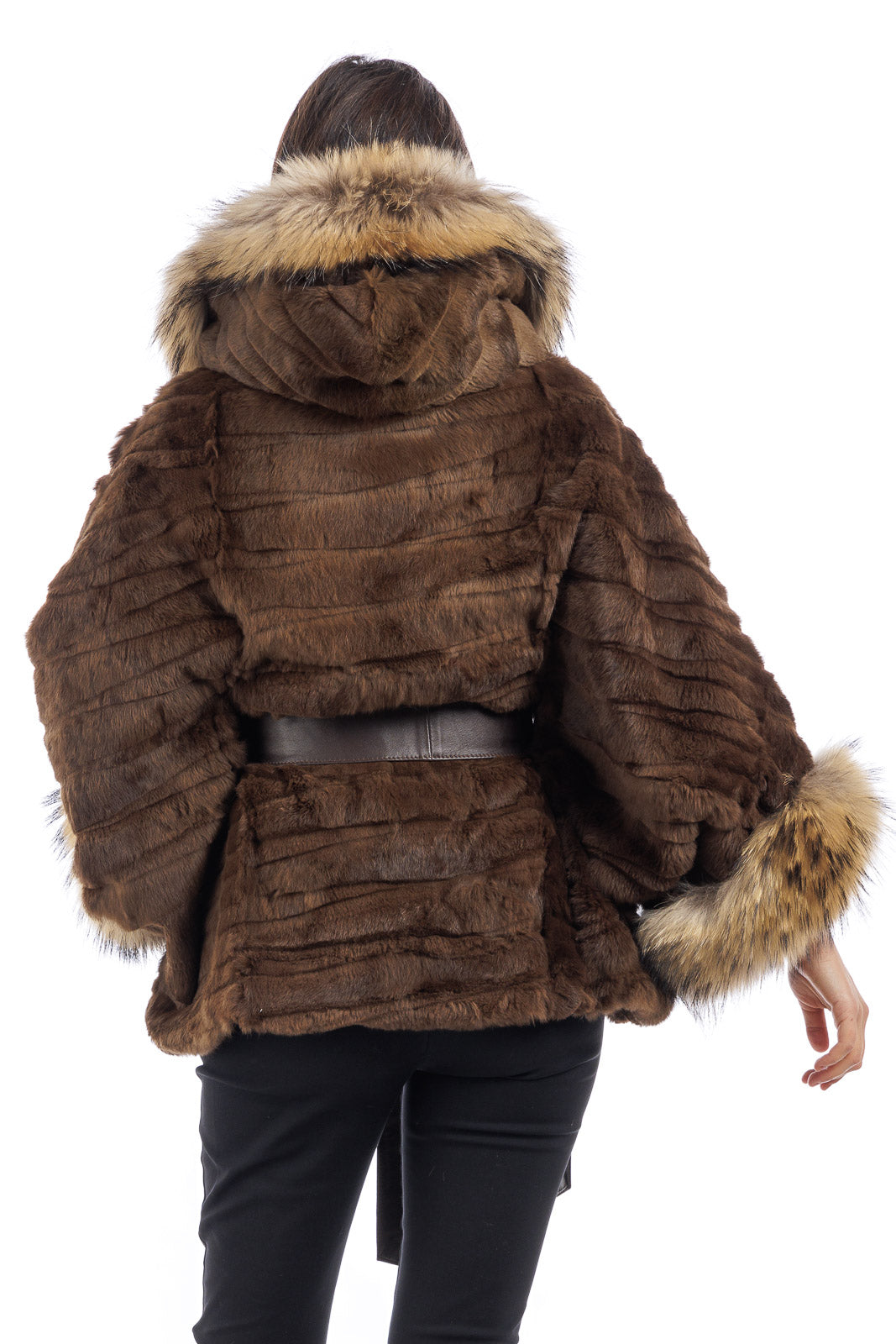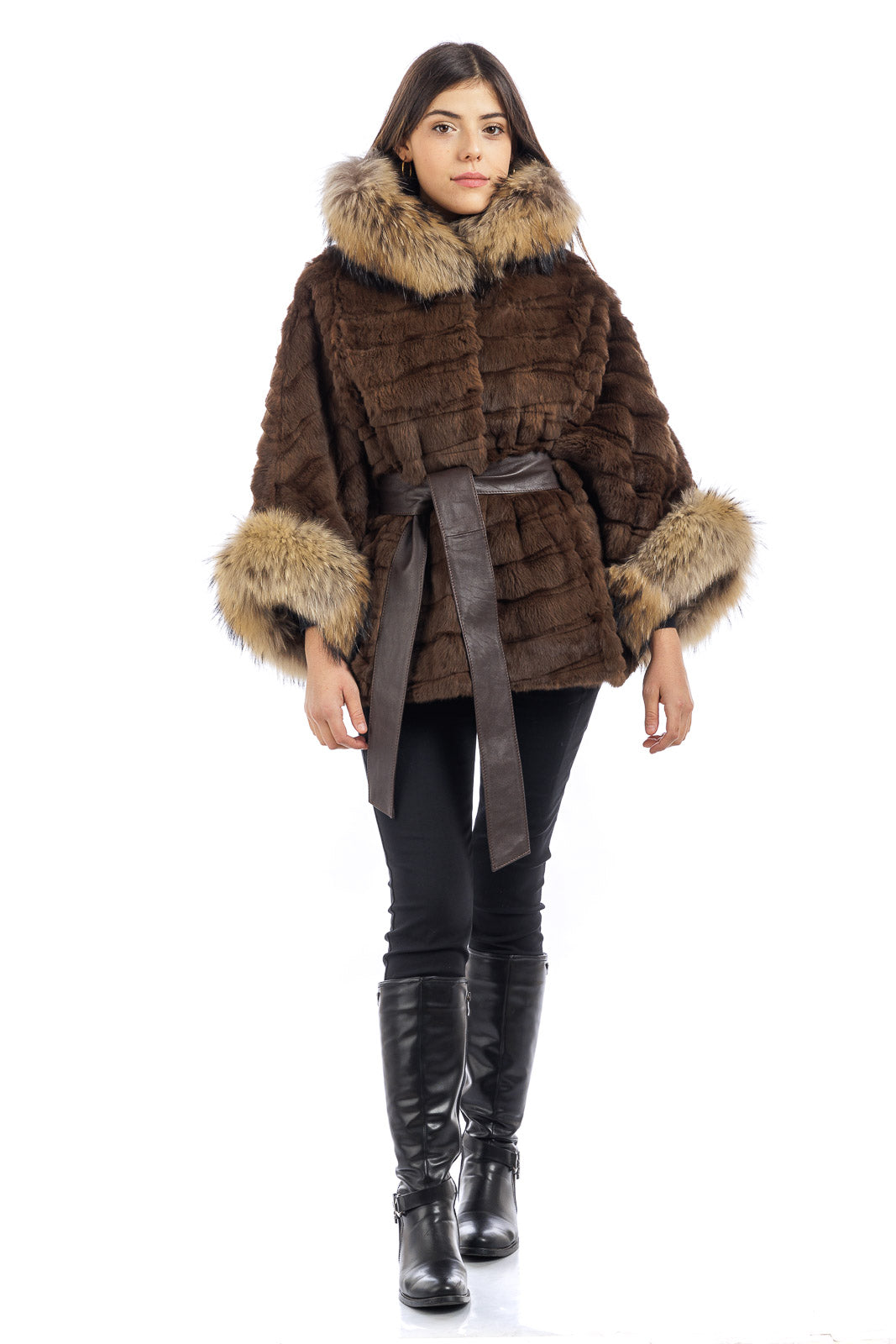 Mantella in pelliccia di Visone perla con cappuccio e cintura in visone