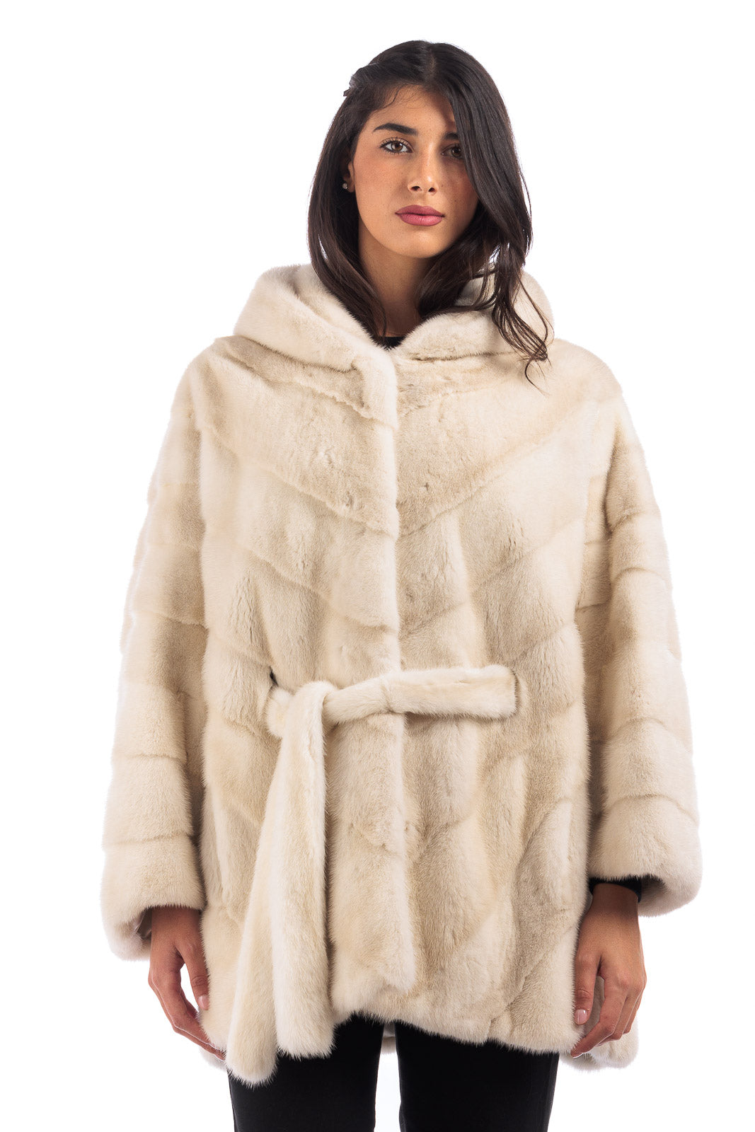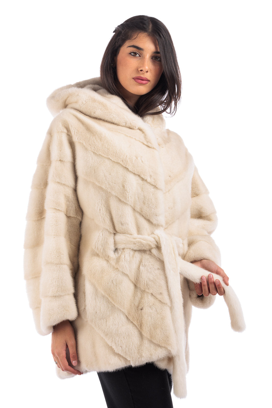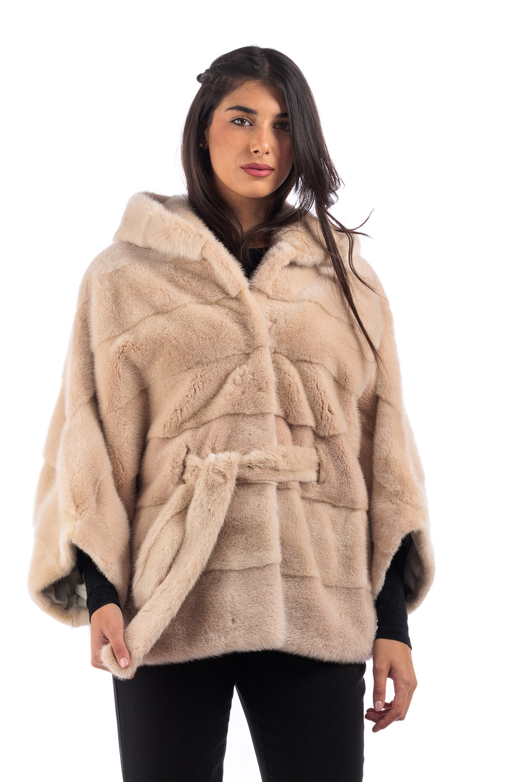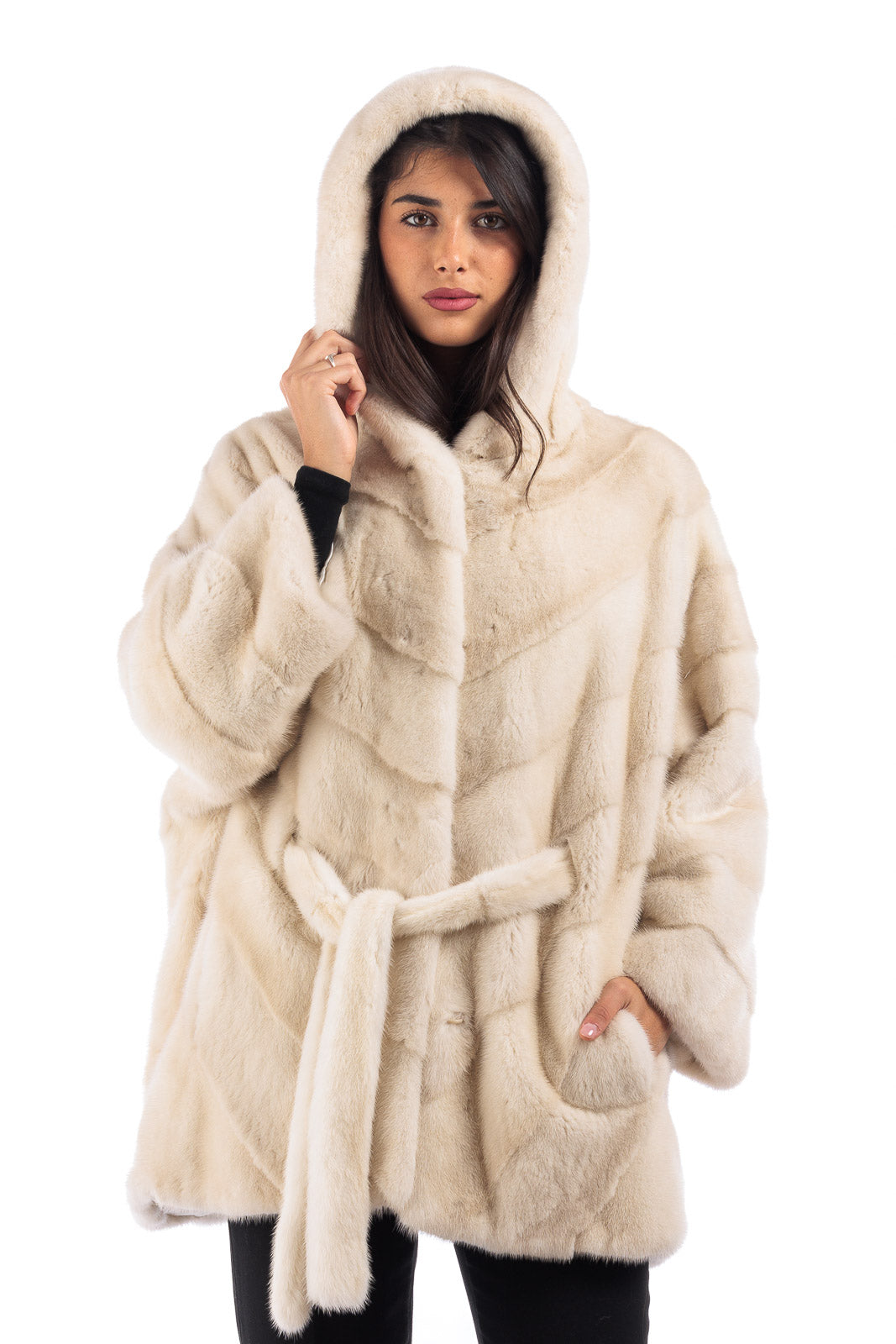 Mantella in pelliccia di Visone perla light con cappuccio e cintura in visone