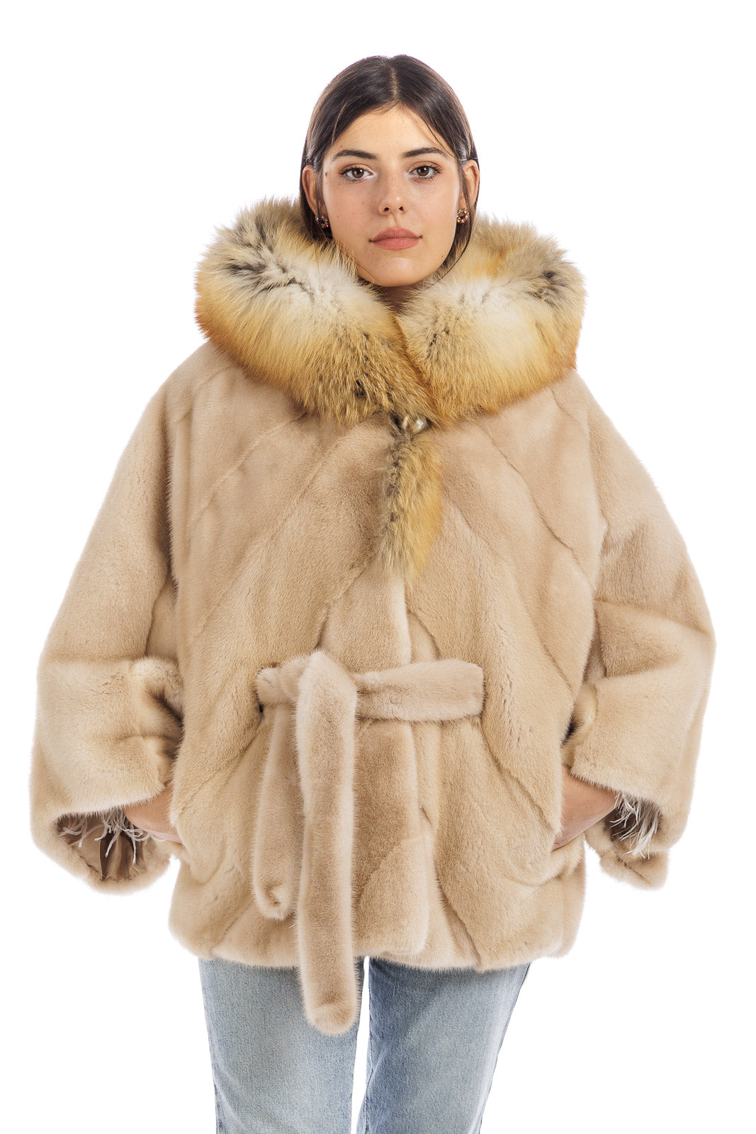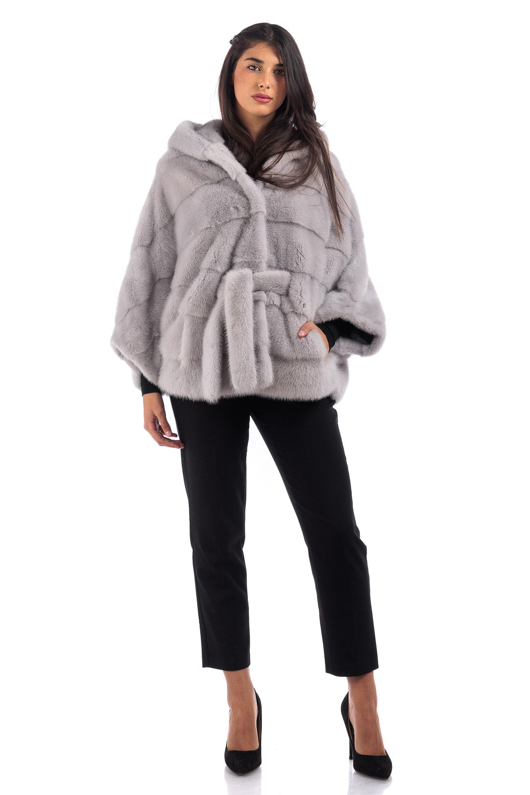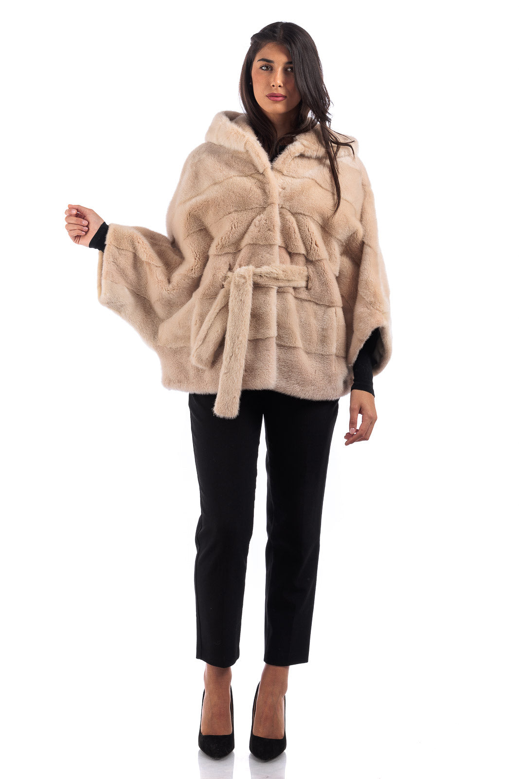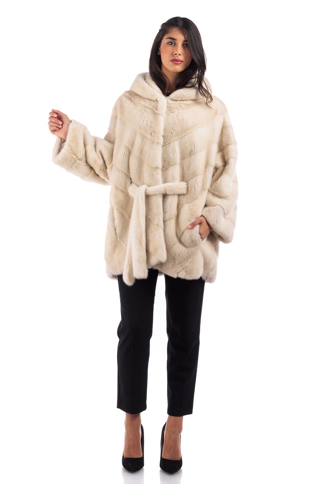 Mantella in pelliccia di Visone perla light con cappuccio e cintura in visone