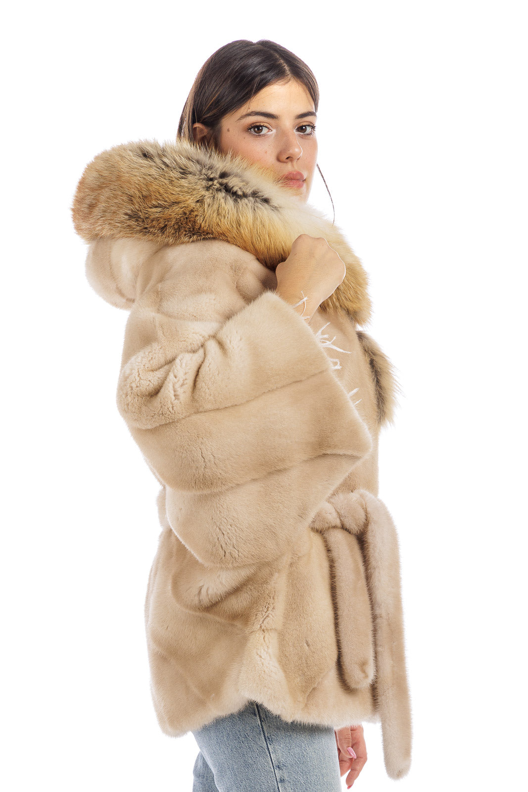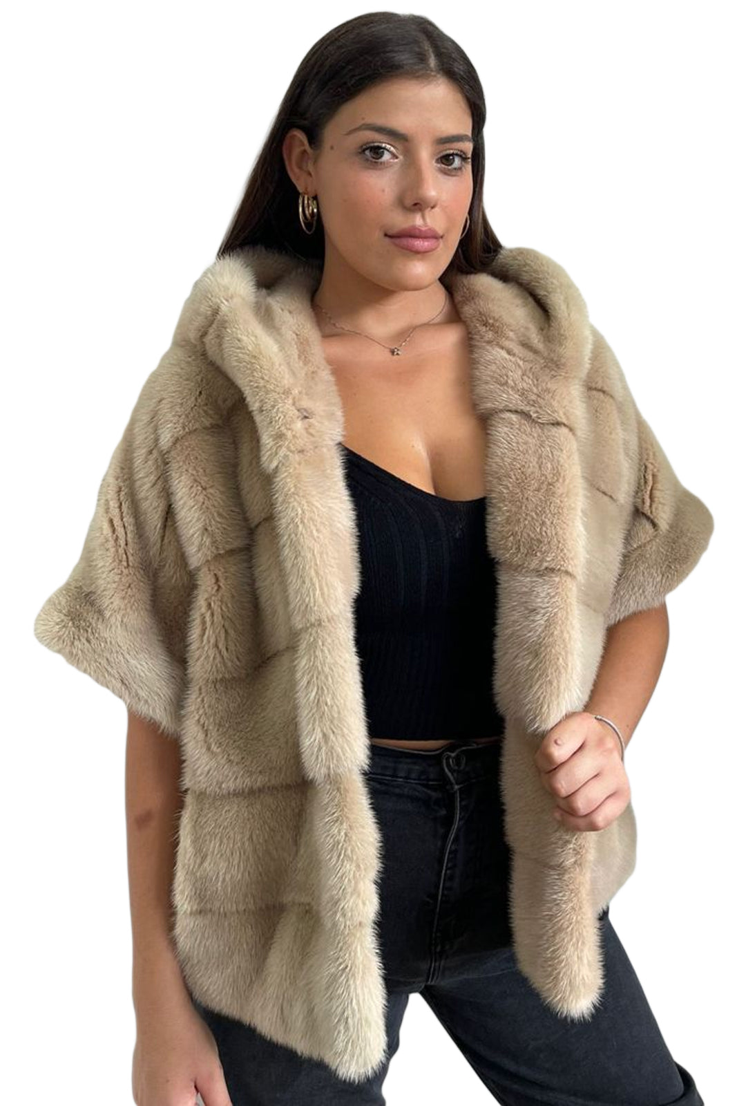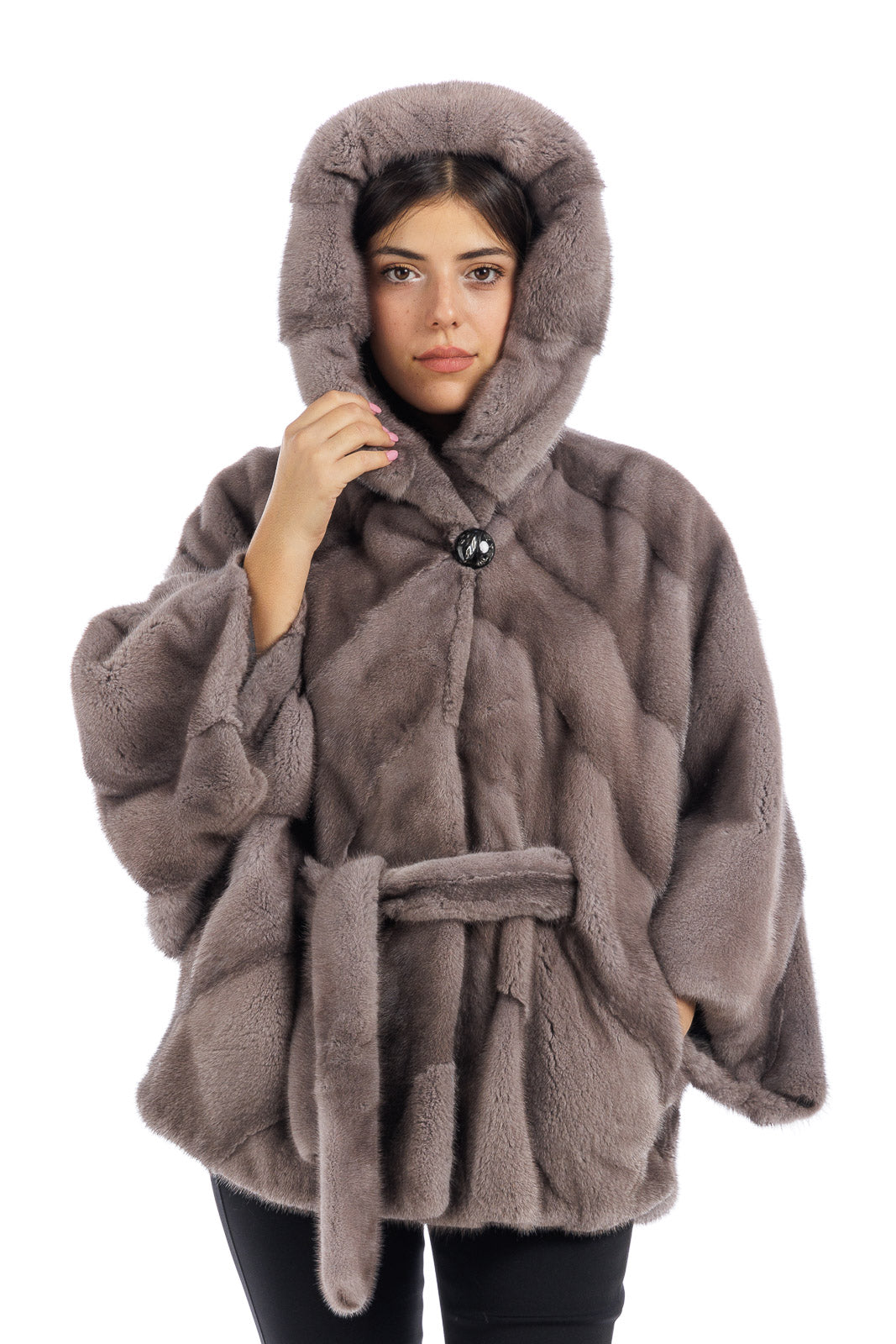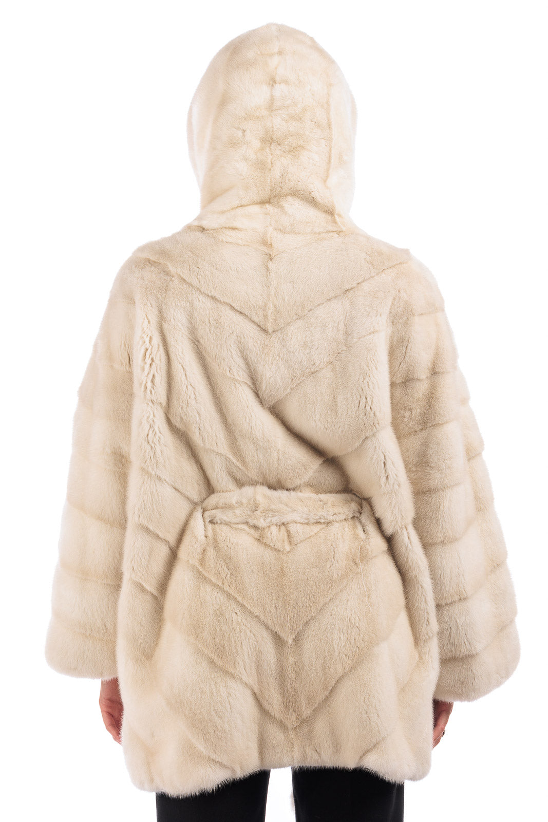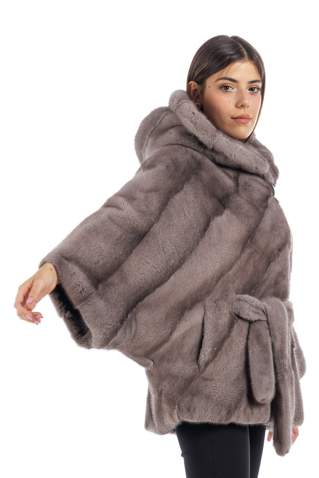 Mantella in pelliccia di Visone perla light con cappuccio e cintura in visone