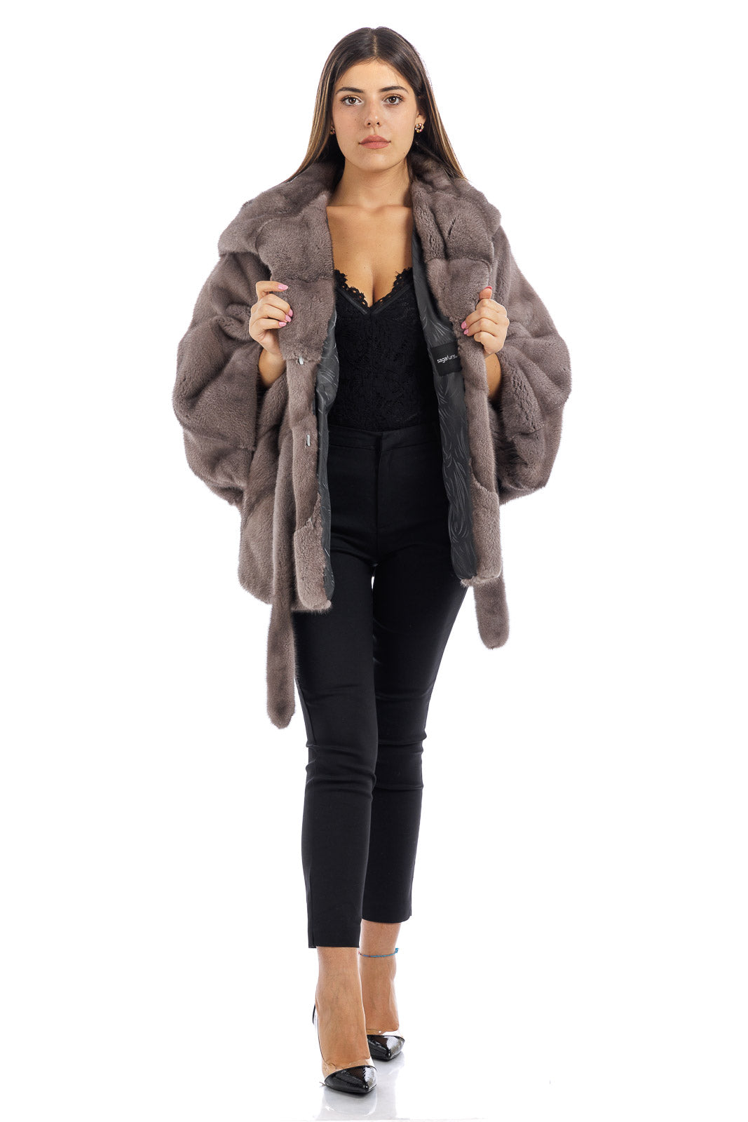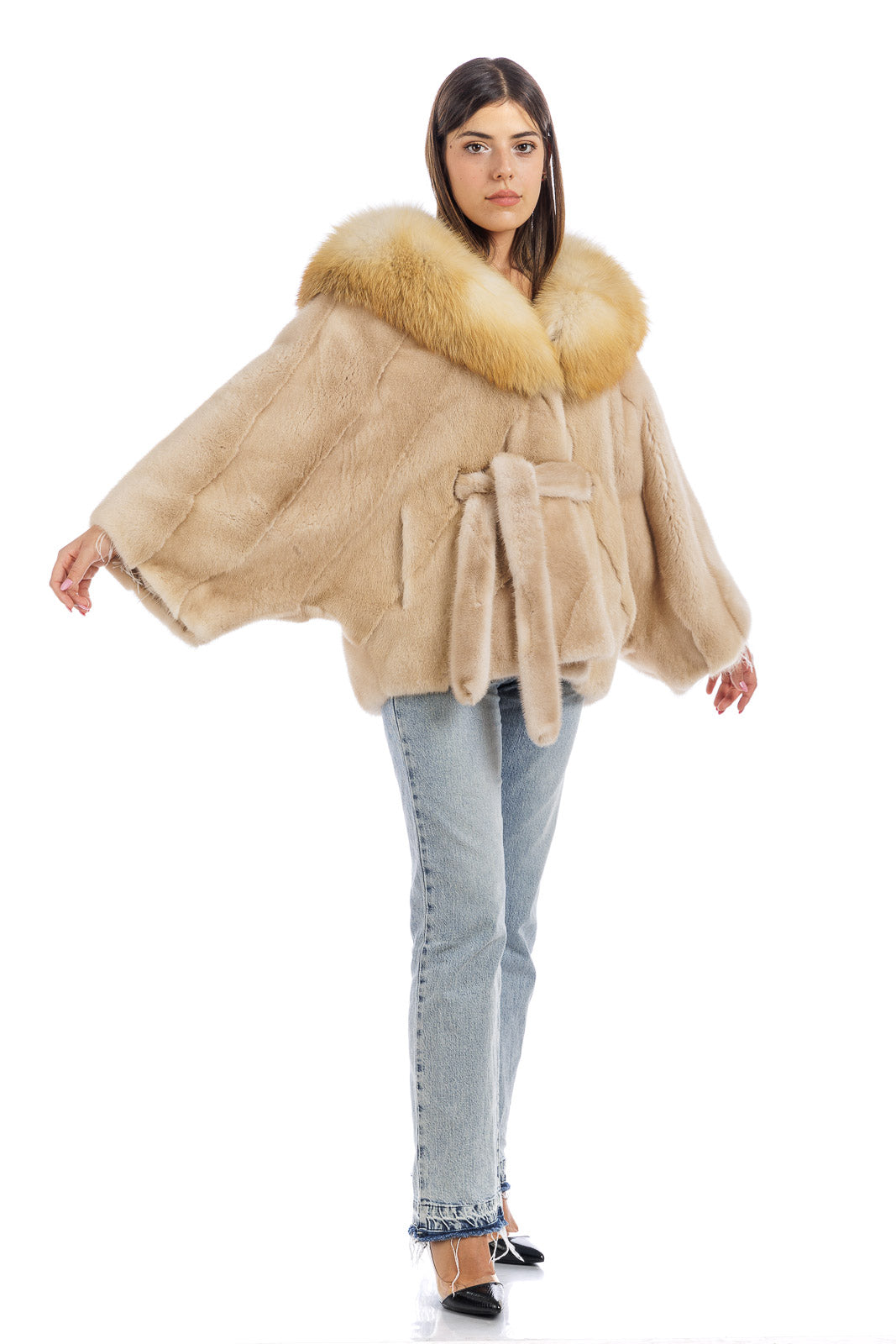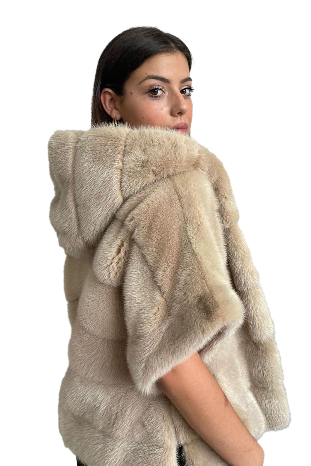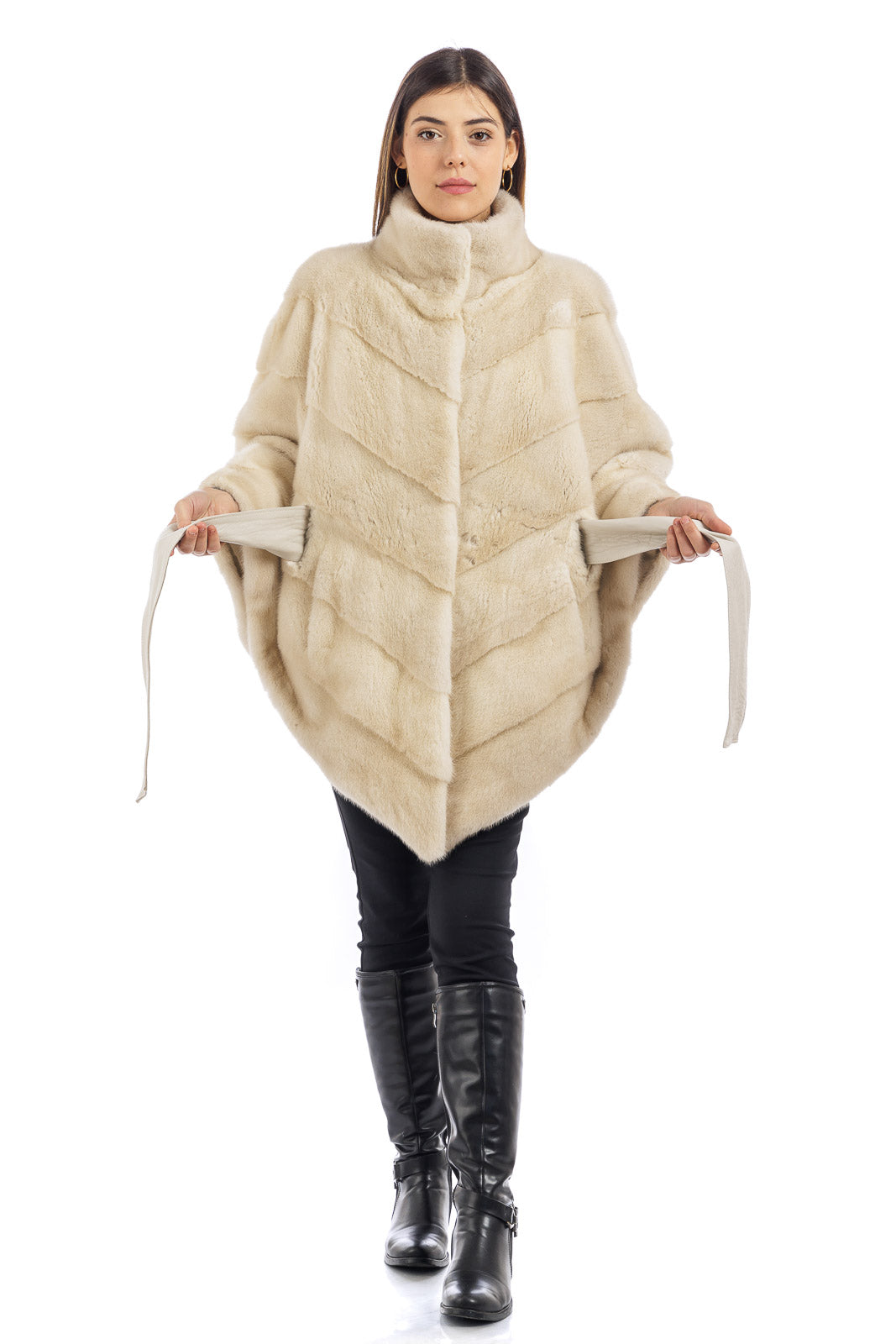 Mantella in pelliccia di Visone perla light con cappuccio e cintura in visone
