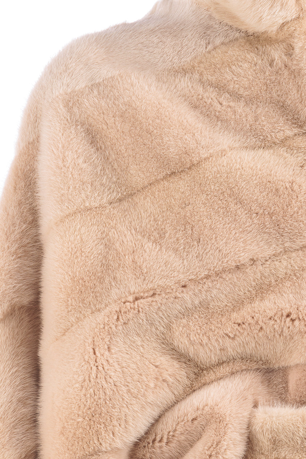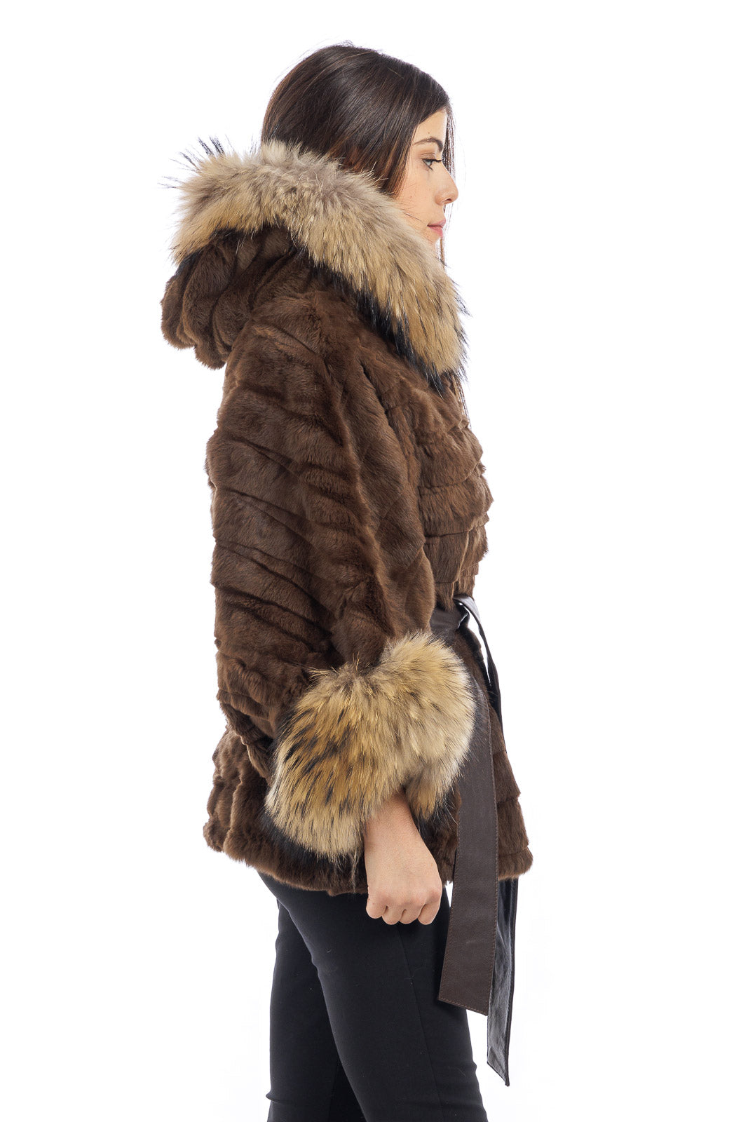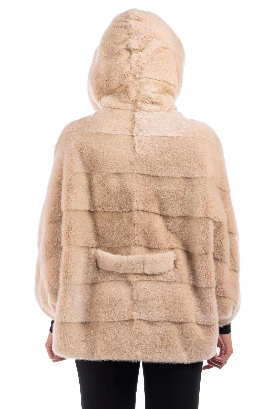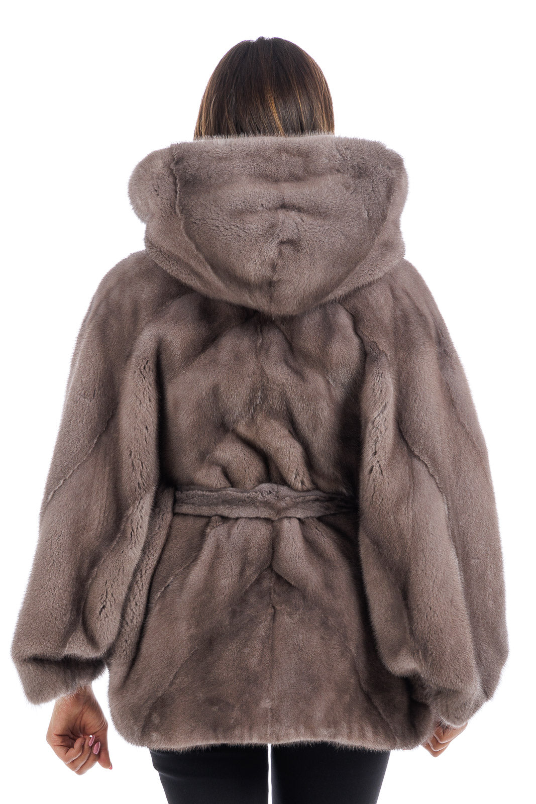 Mantella in pelliccia di Visone perla light con cappuccio e cintura in visone