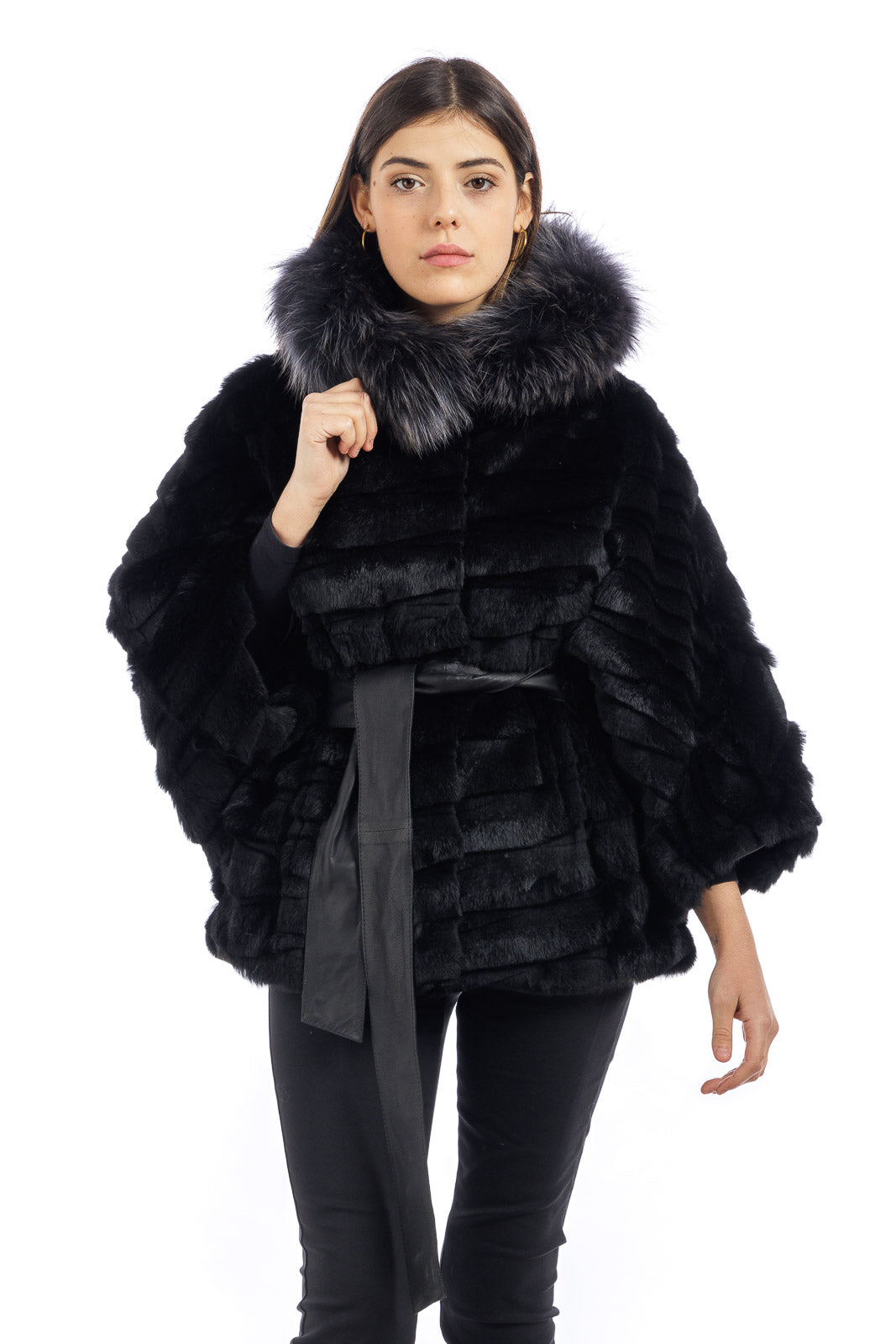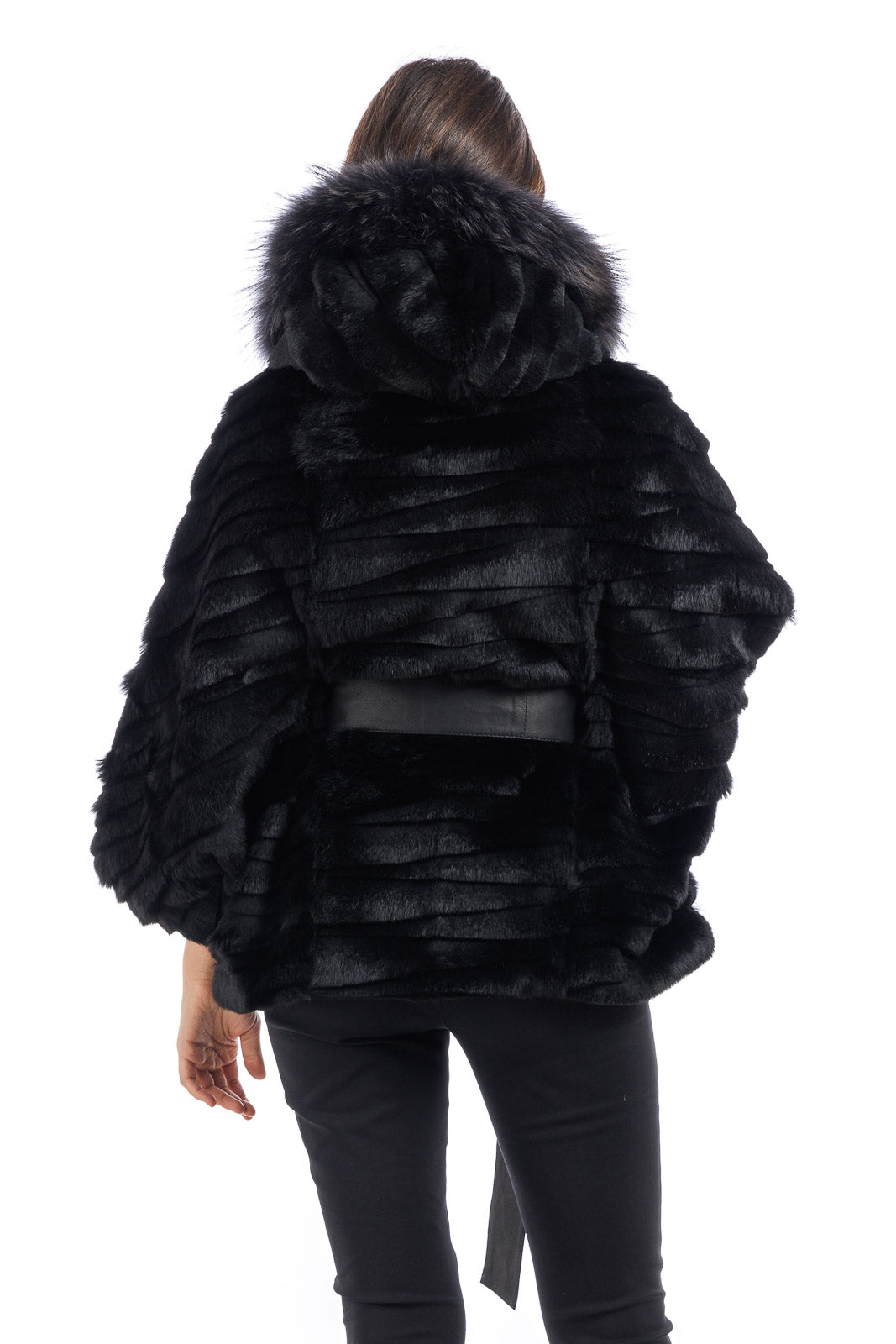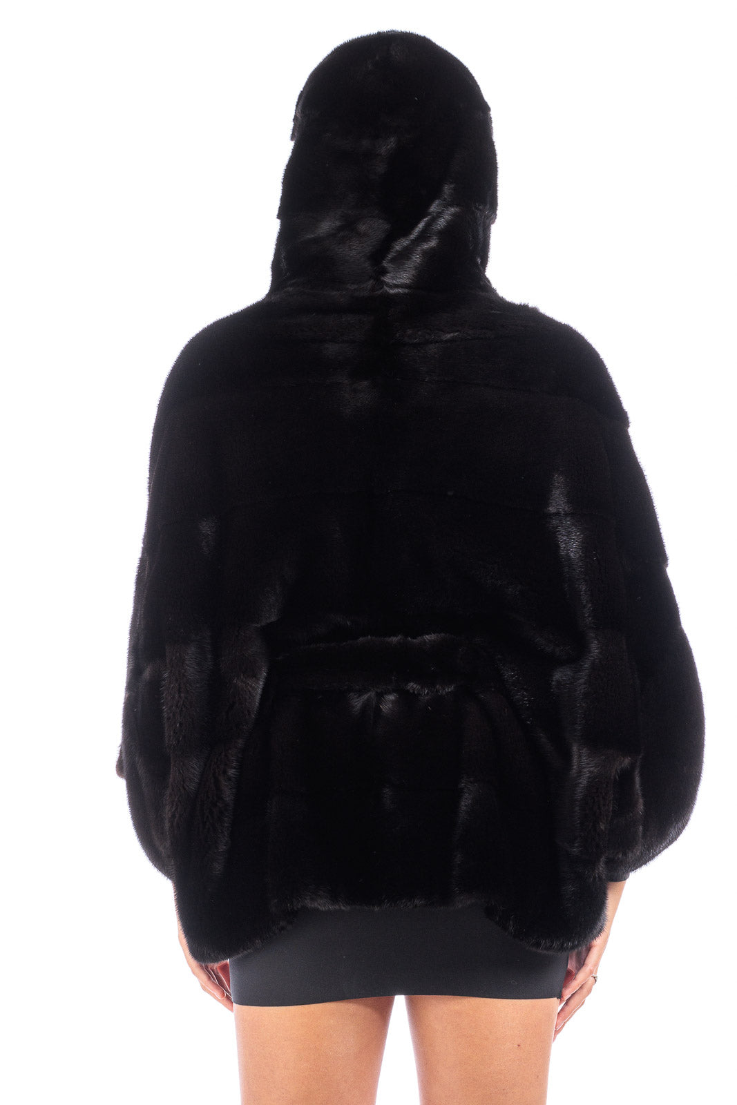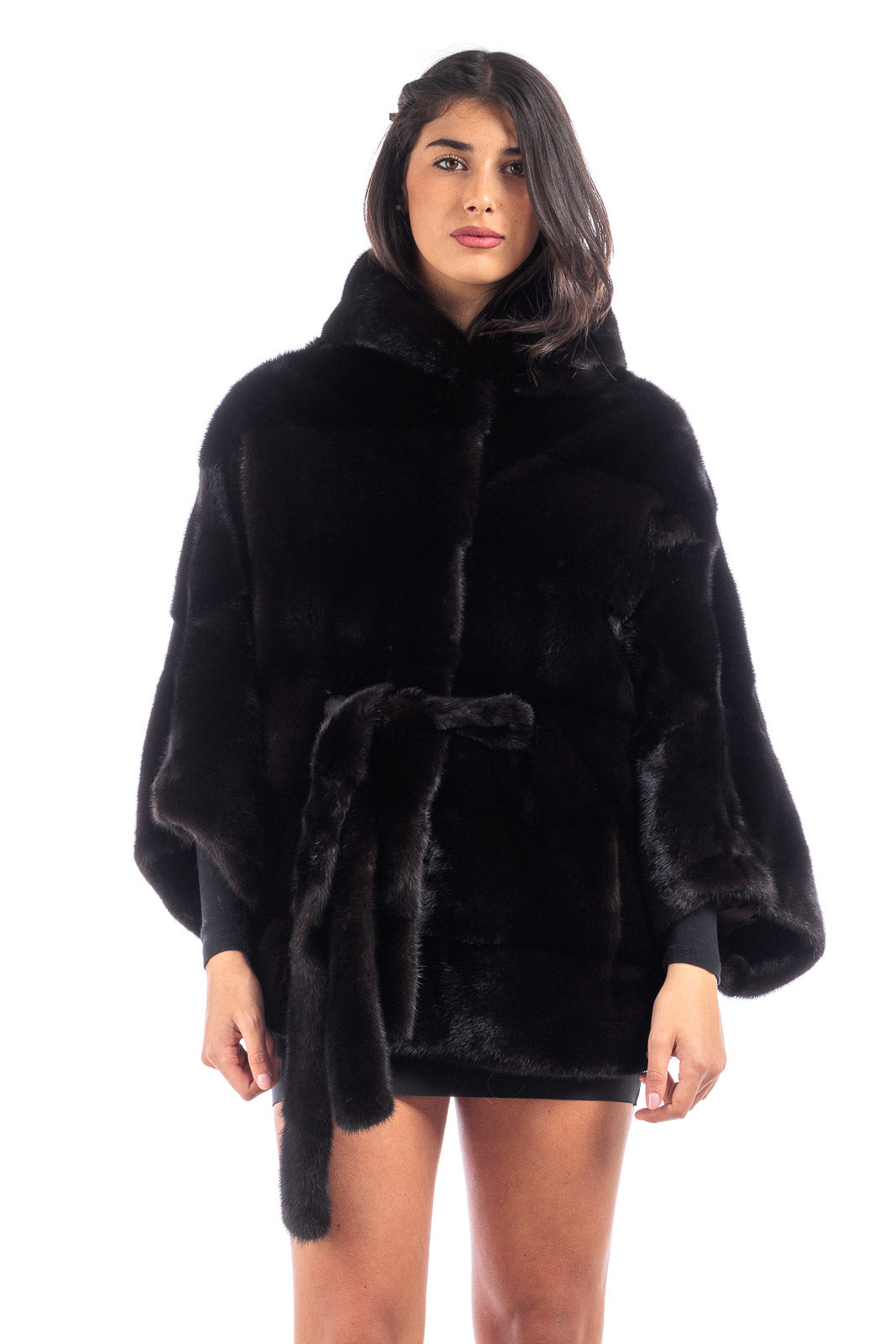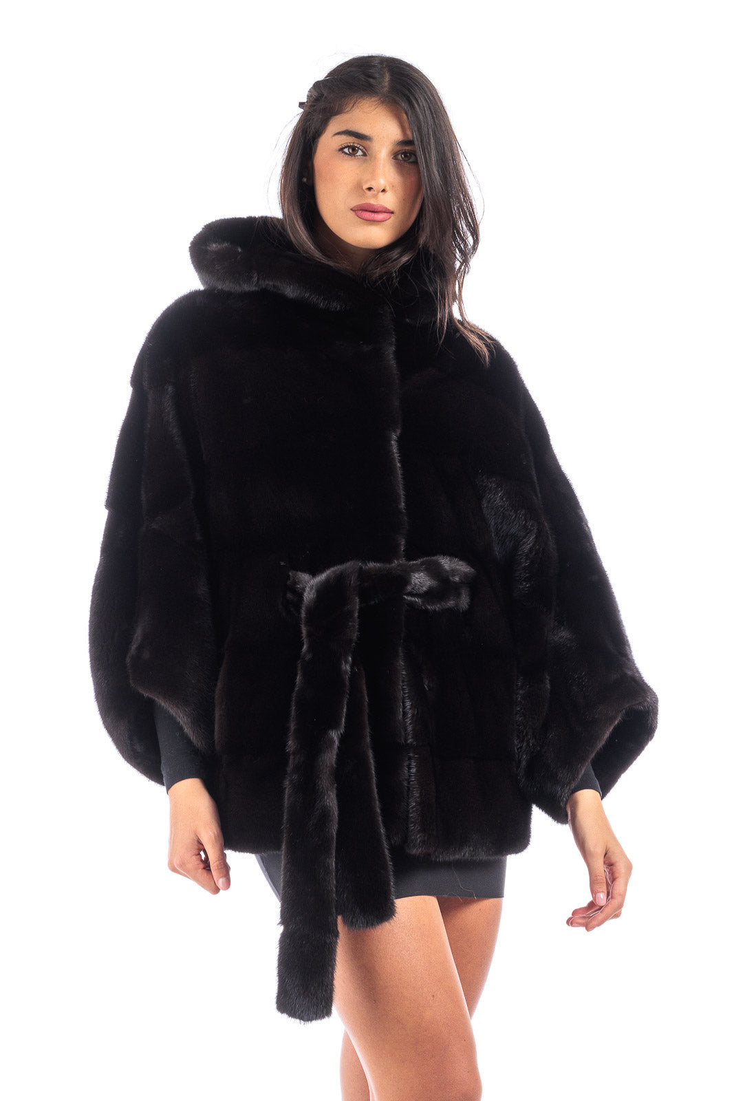 Mantella in pelliccia di Visone blackglama con cappuccio e cintura in visone