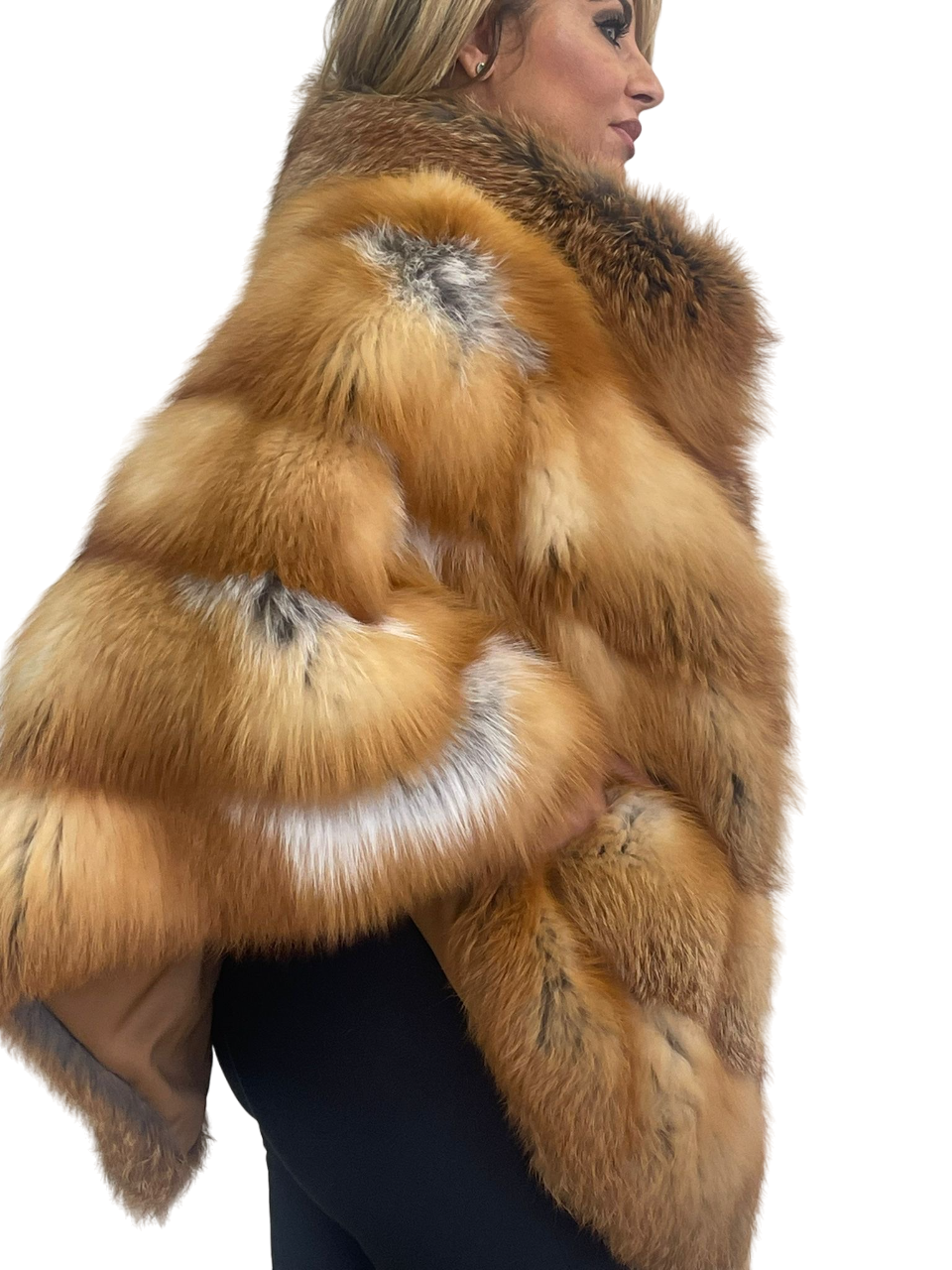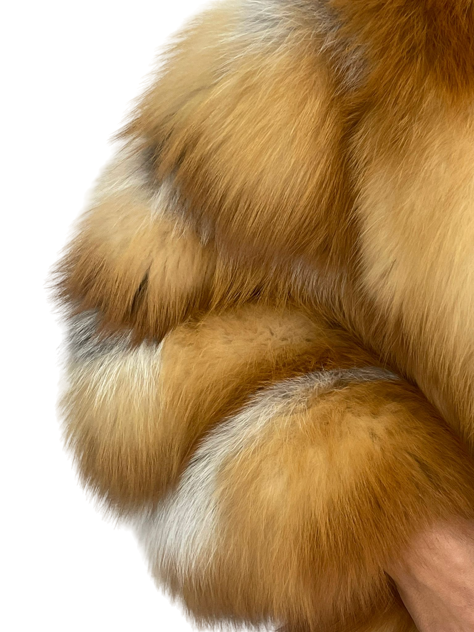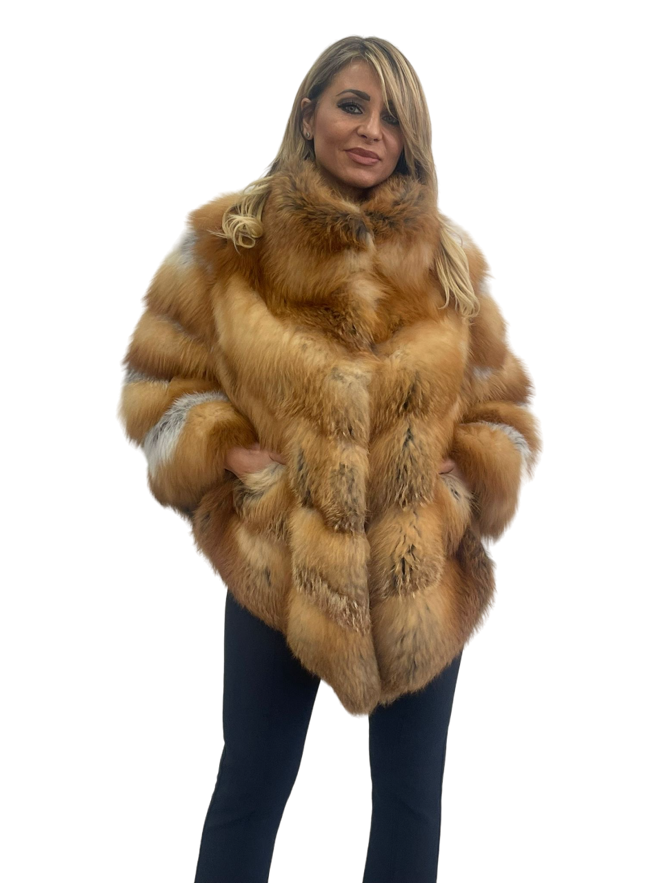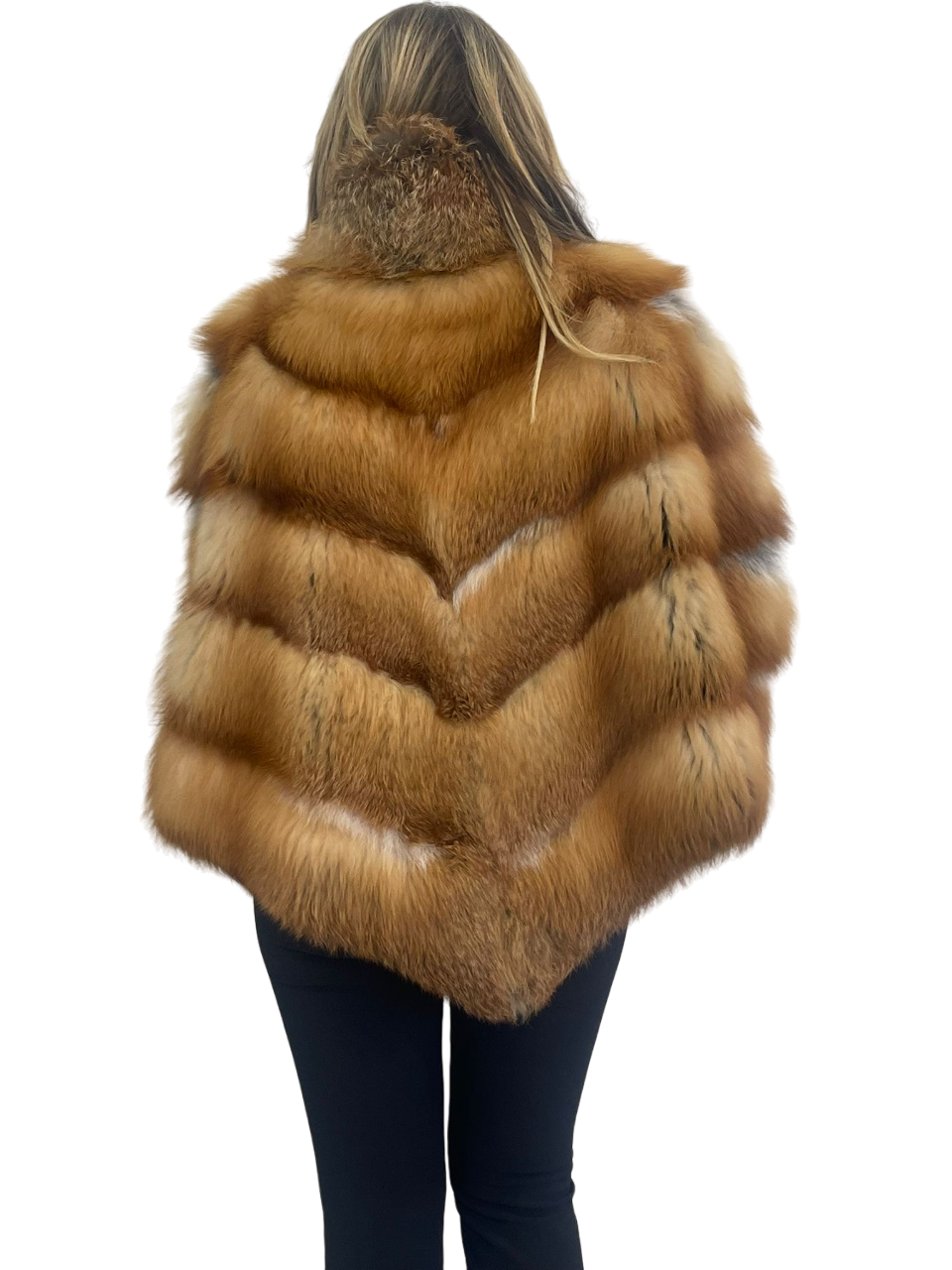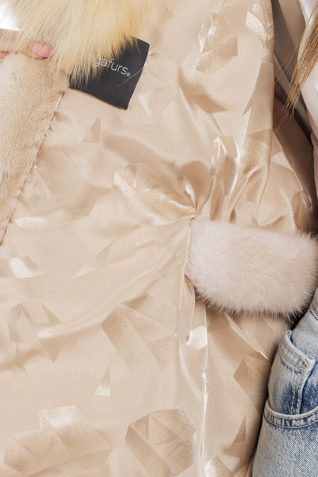 Mantella in pelliccia di Visone perla con cappuccio bordato in volpe rossa