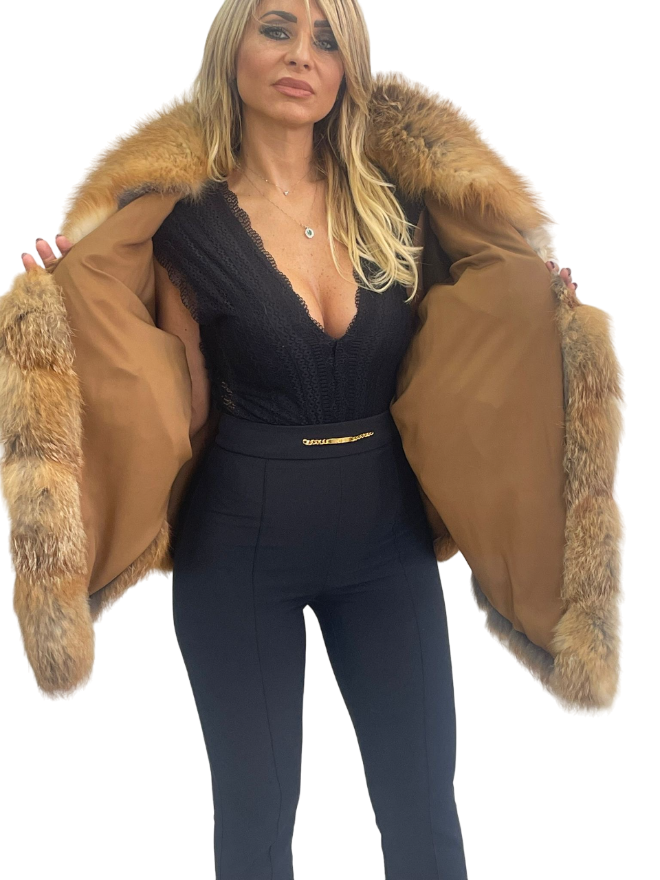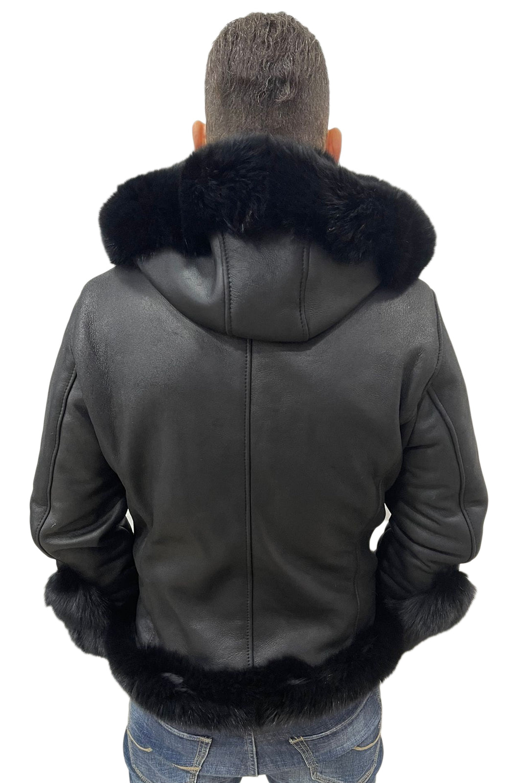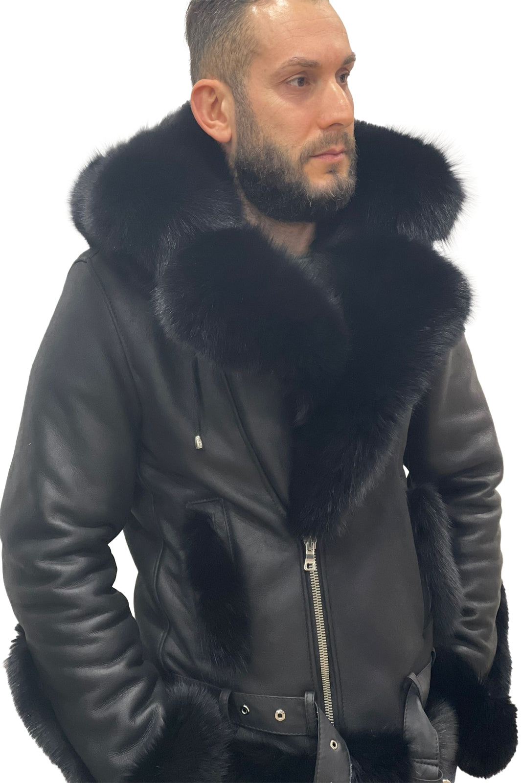Montone merinos uomo con zip e cintura bordato in pelliccia di volpe