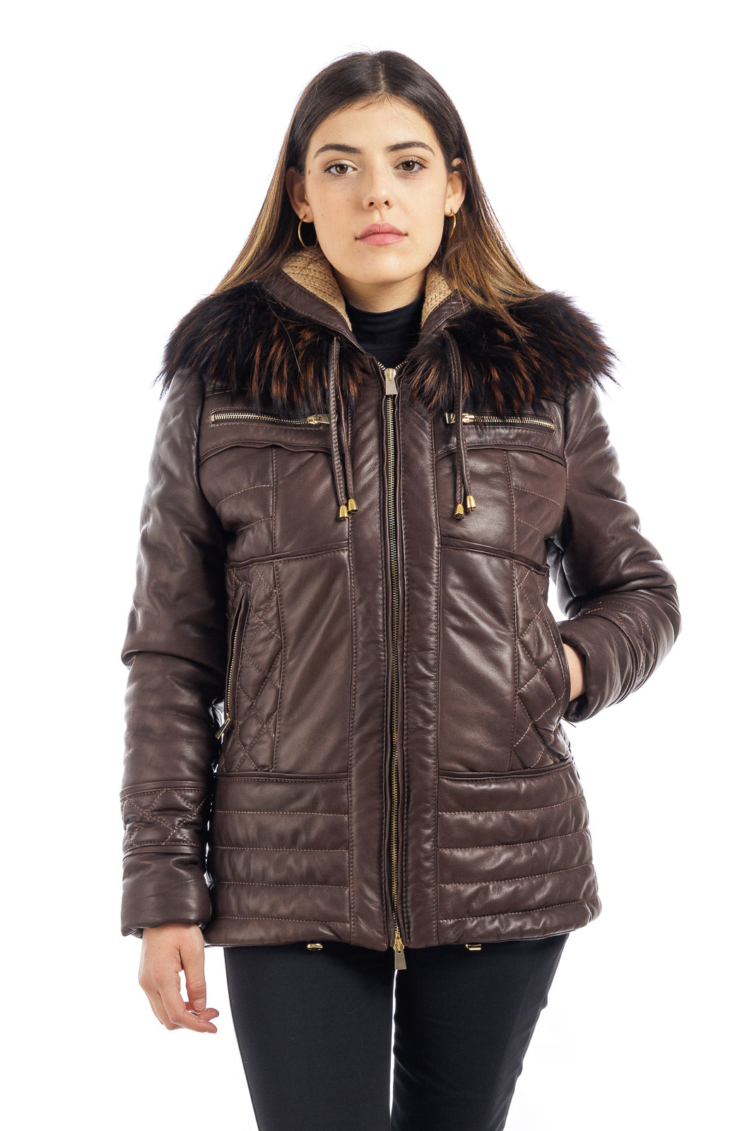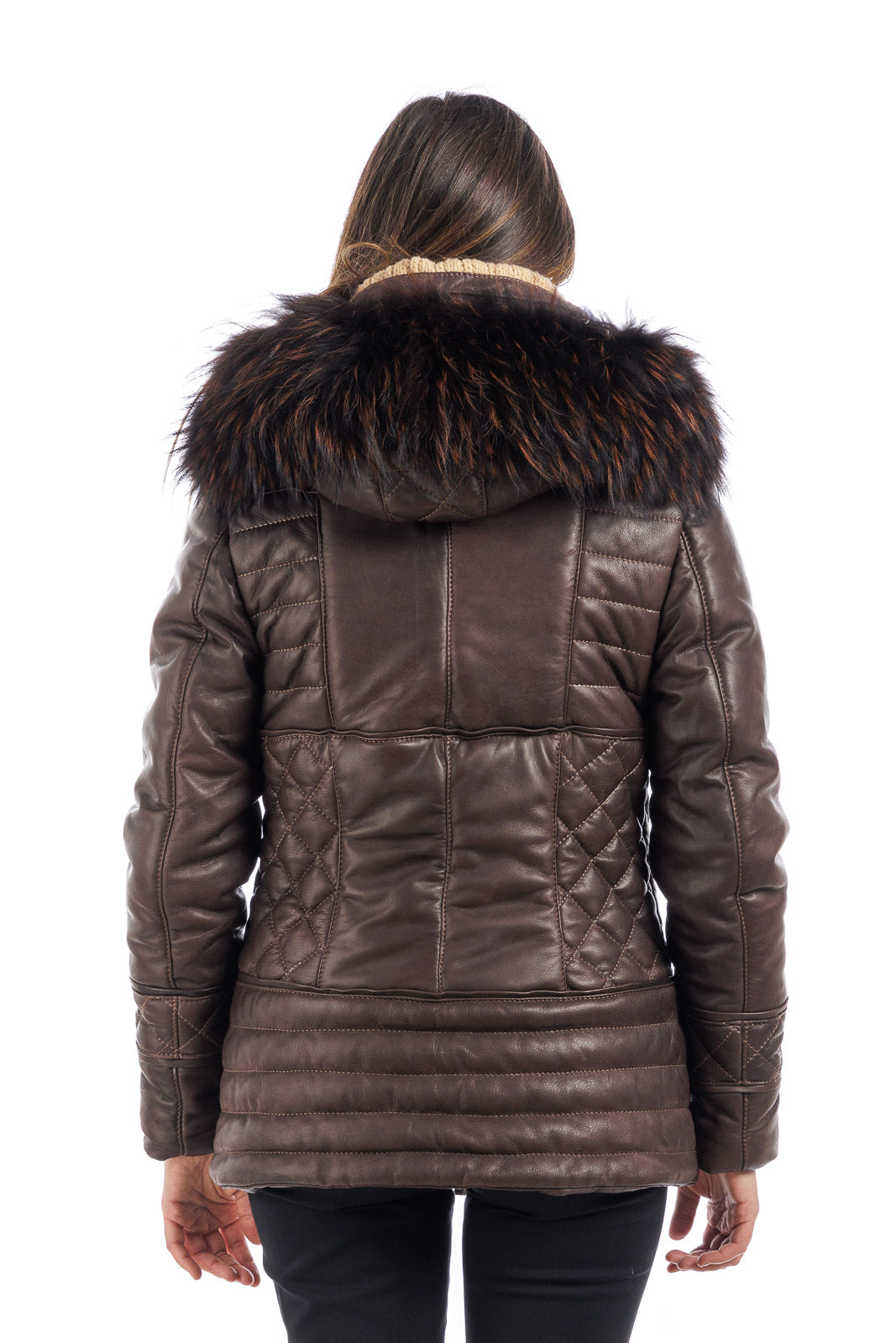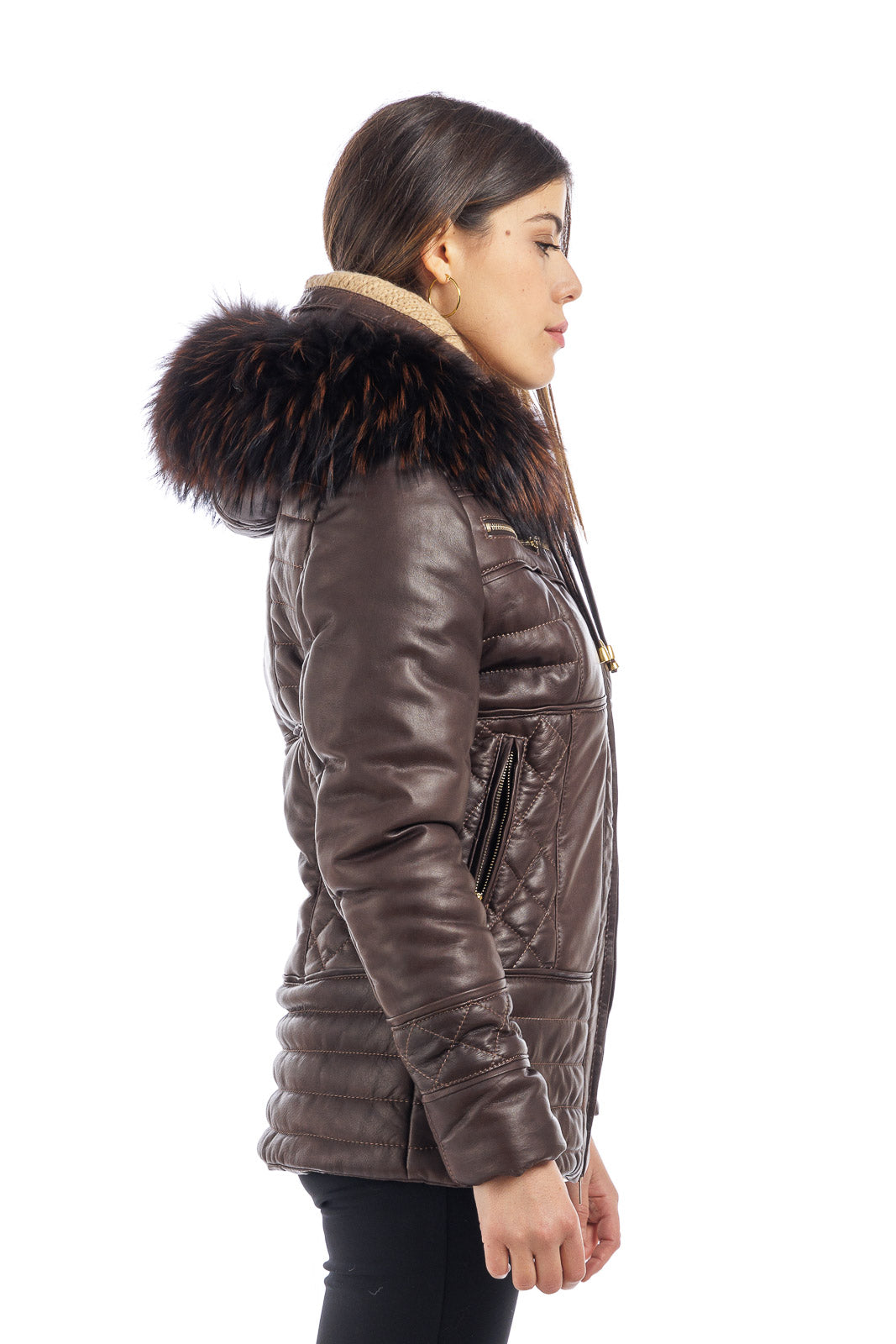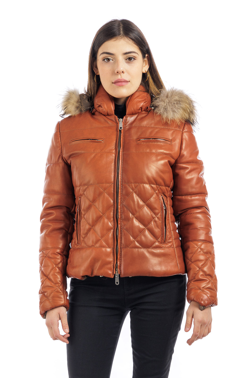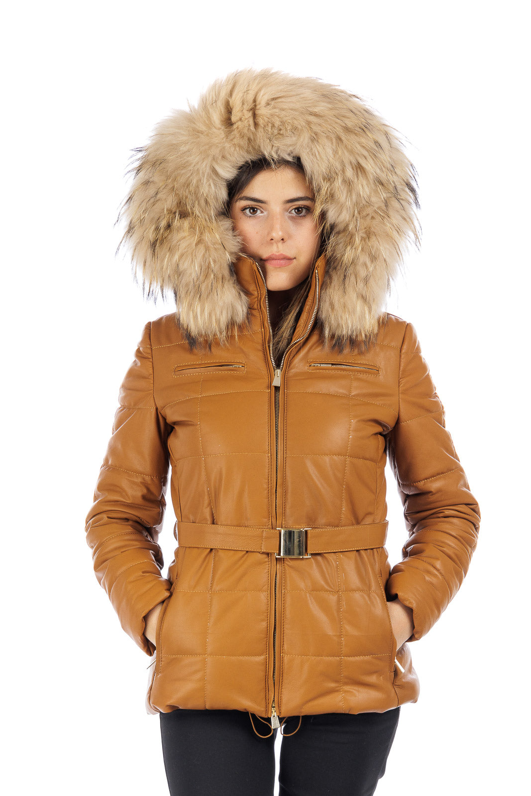 Piumino miele in pelle con cappuccio bordato in murmasky