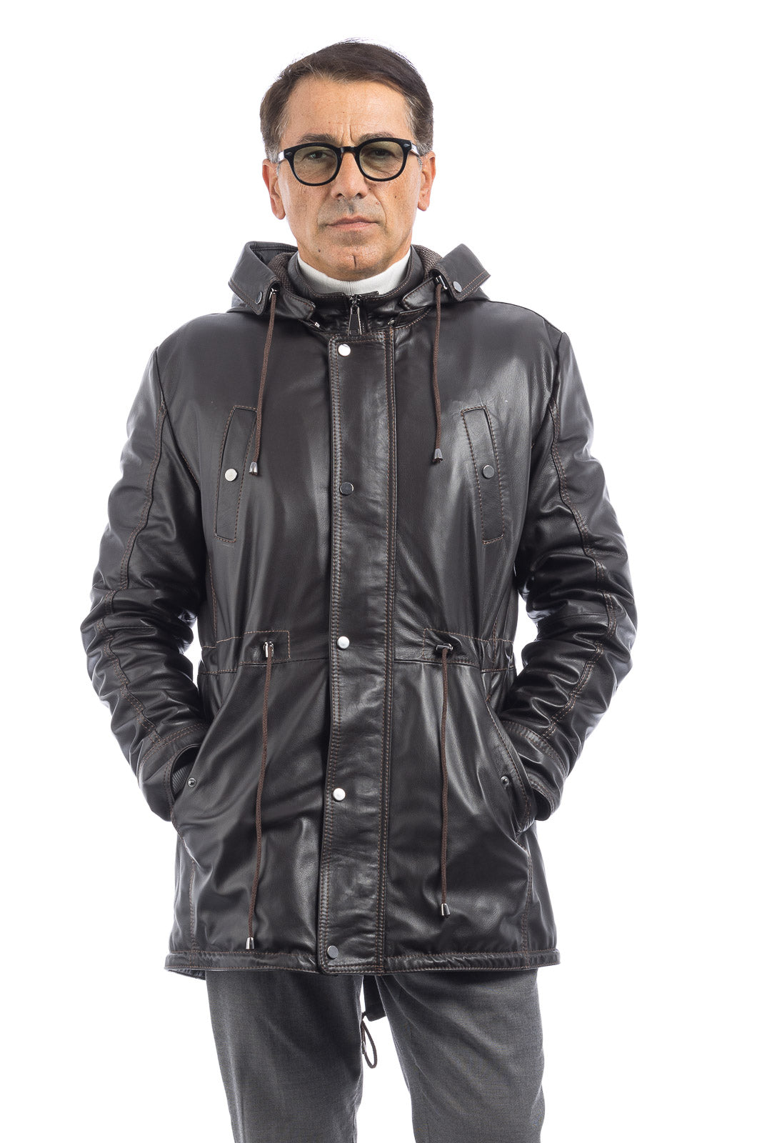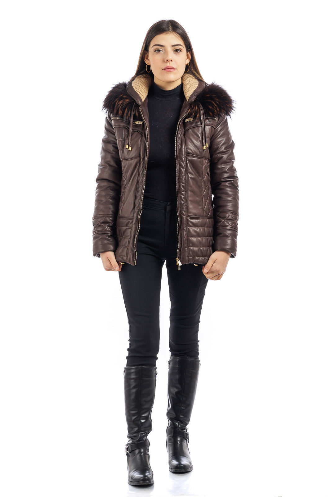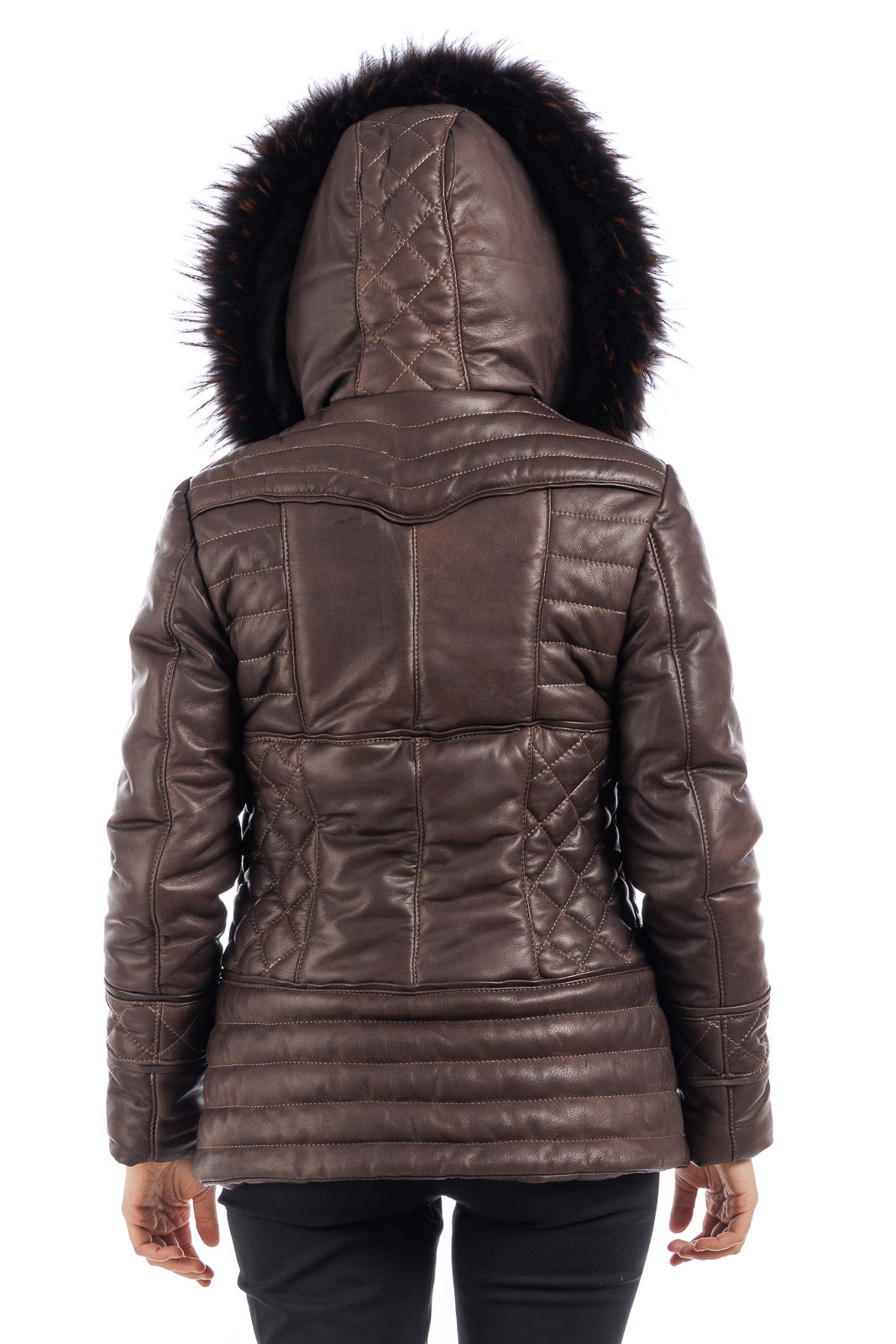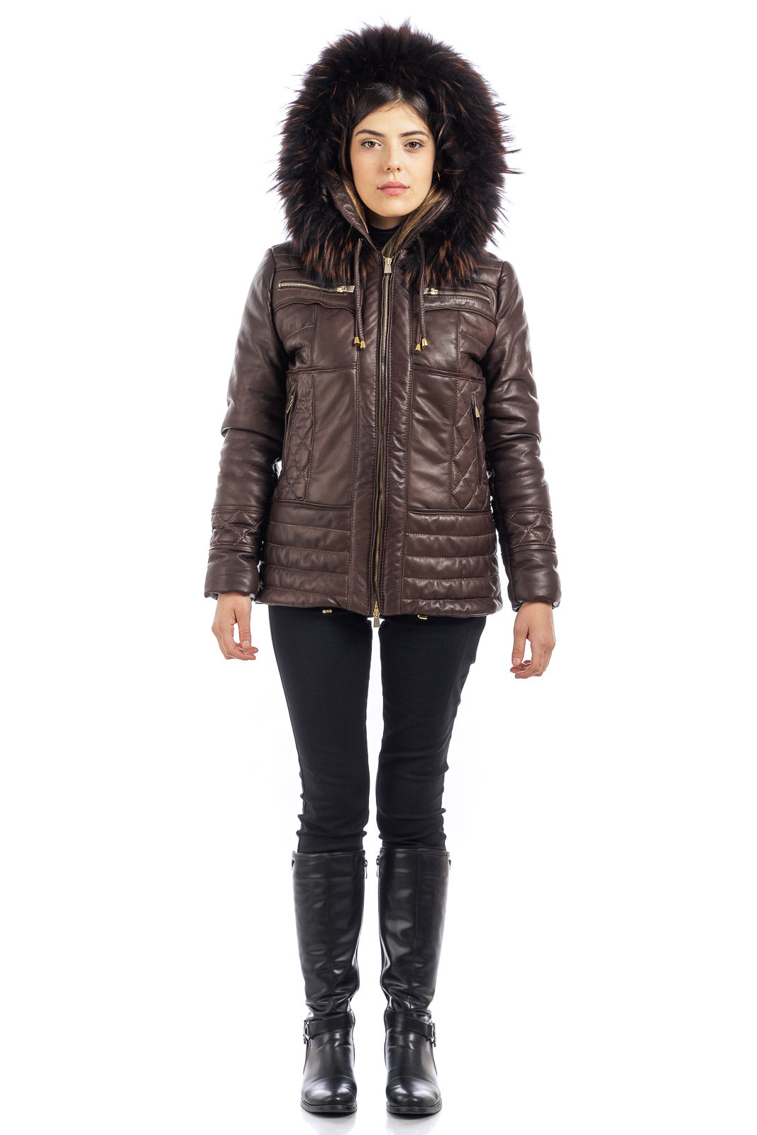 Piumino miele in pelle con cappuccio bordato in murmasky