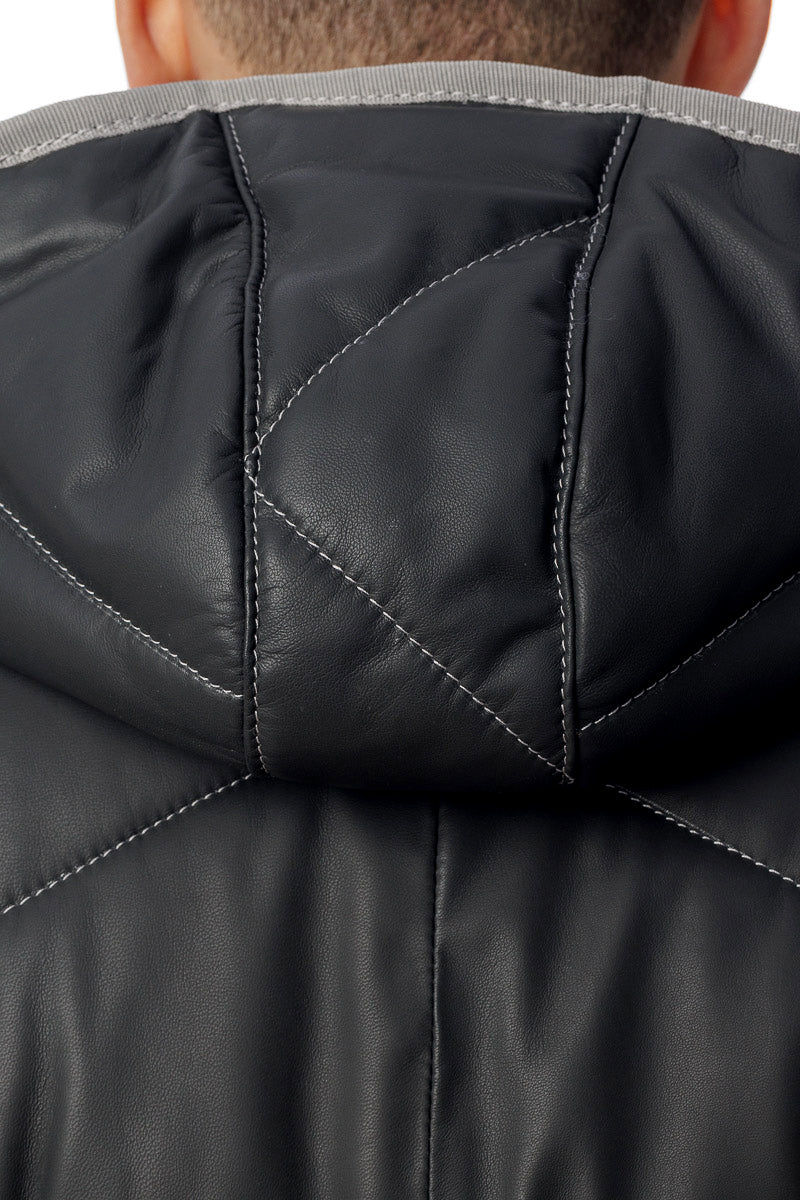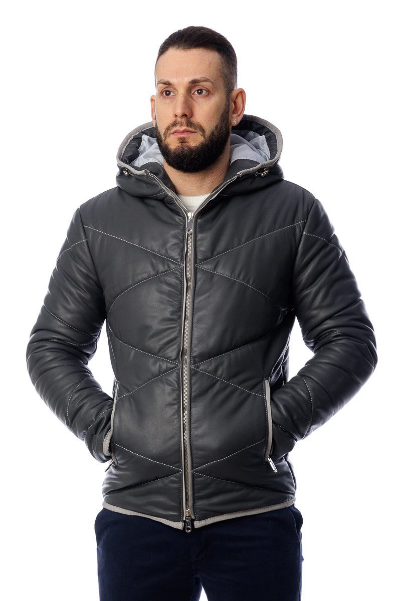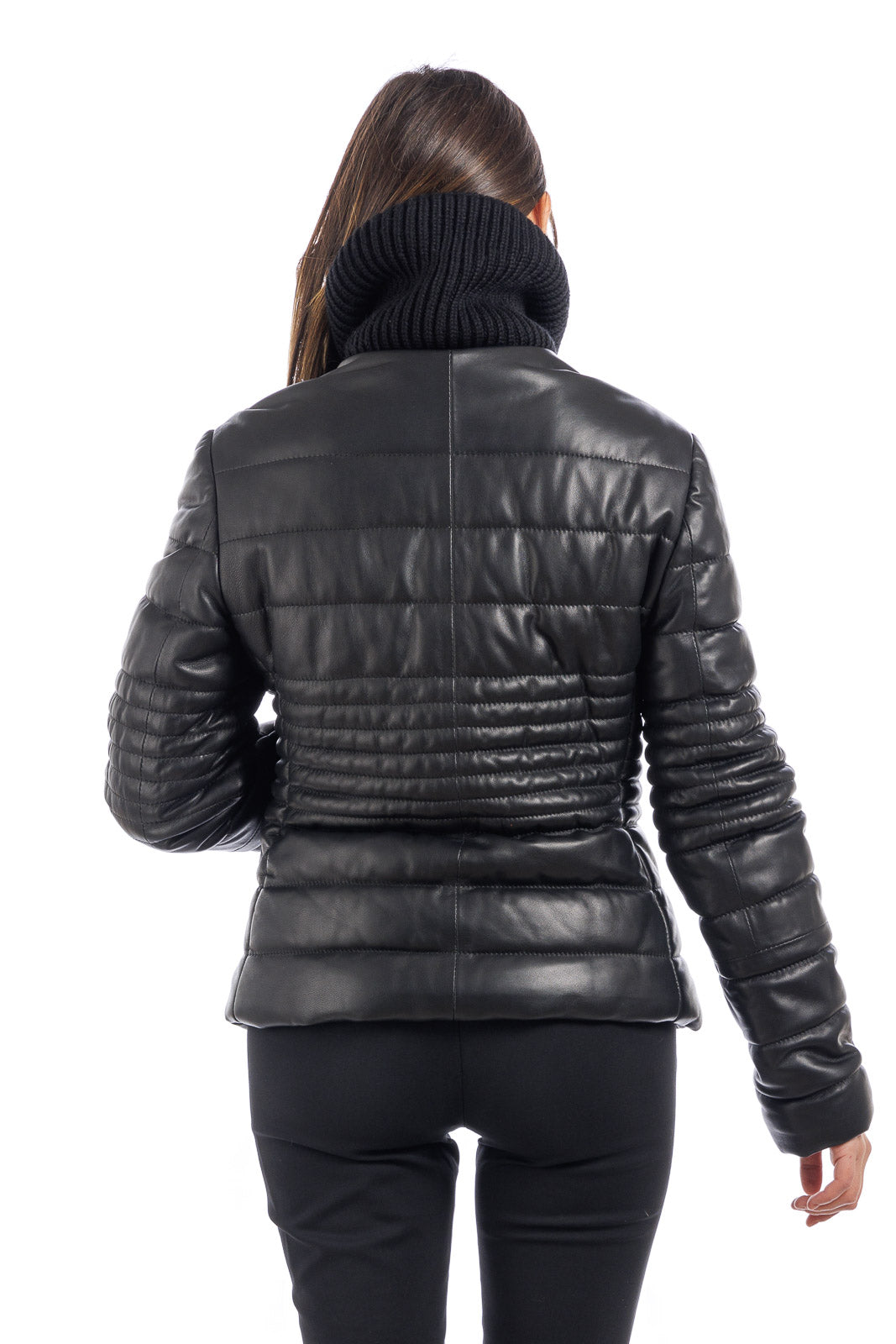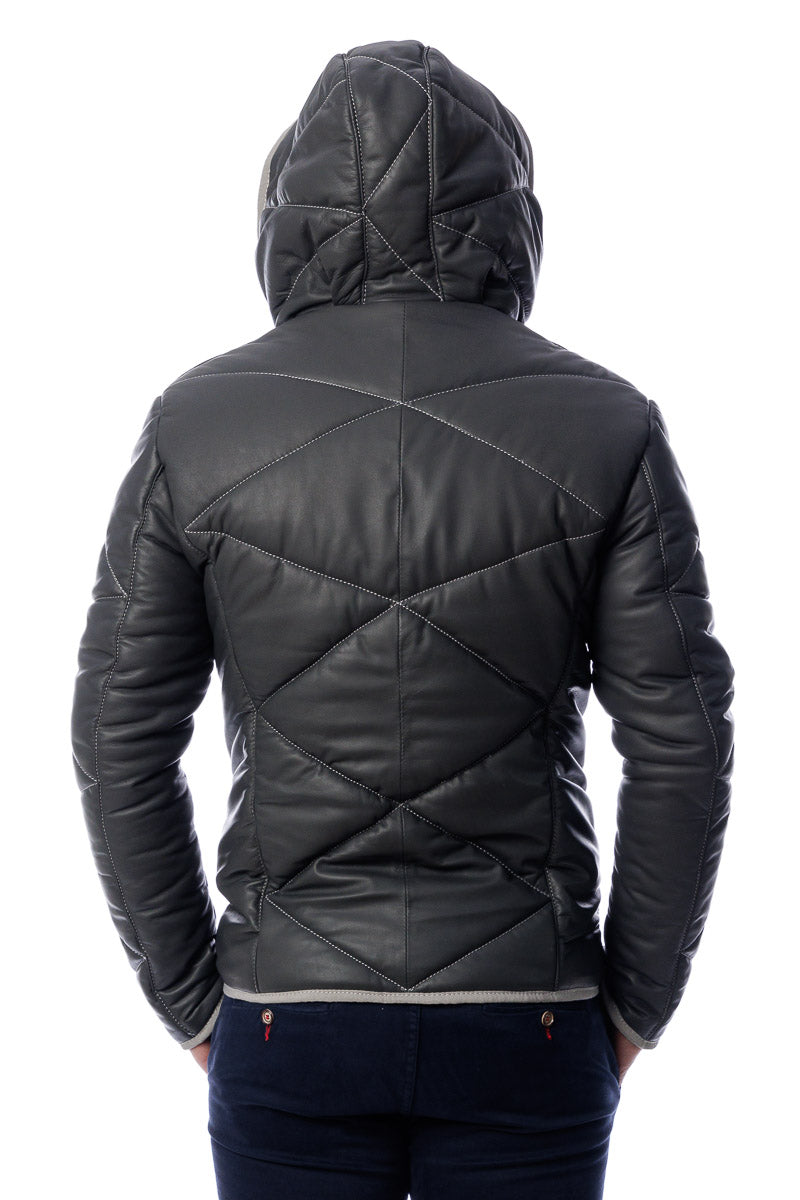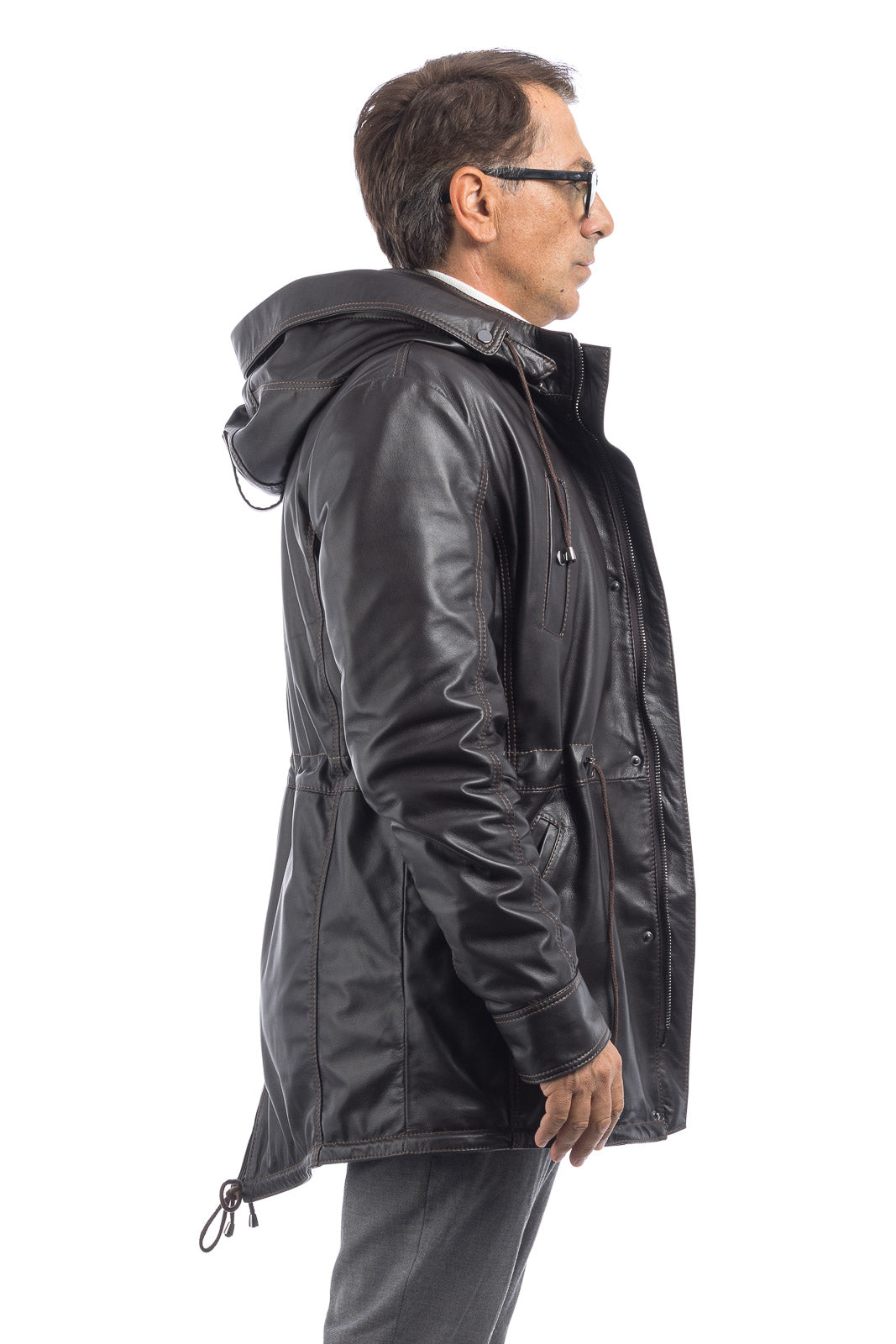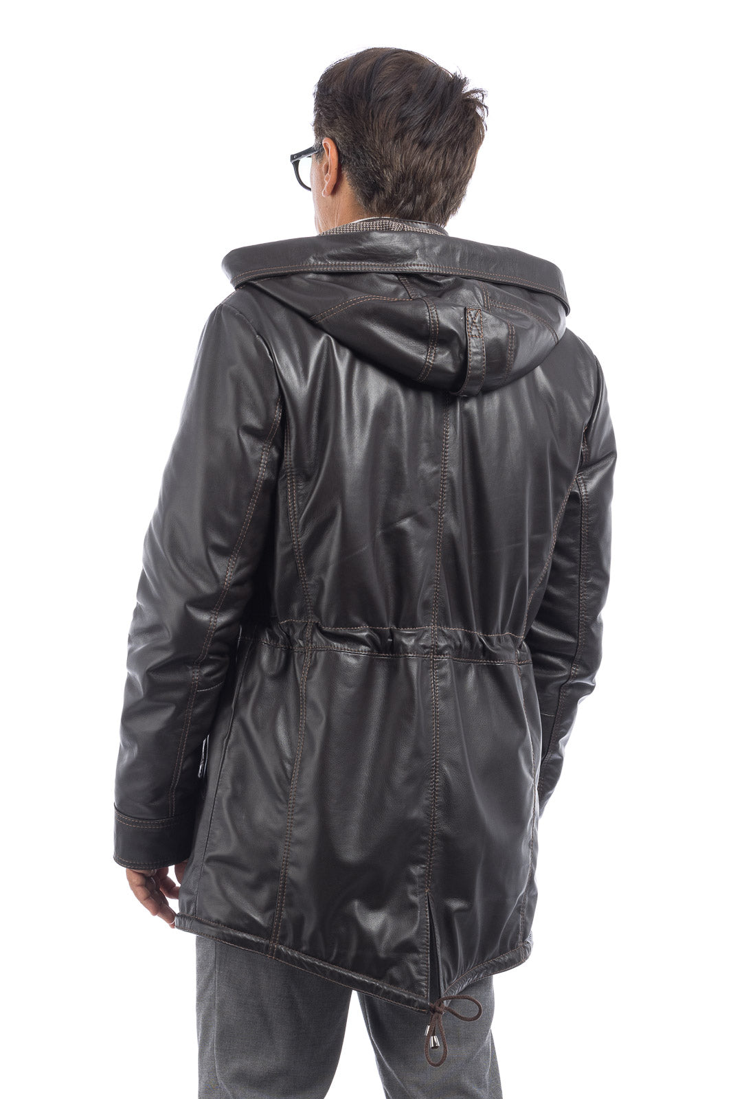 Piumino miele in pelle con cappuccio bordato in murmasky