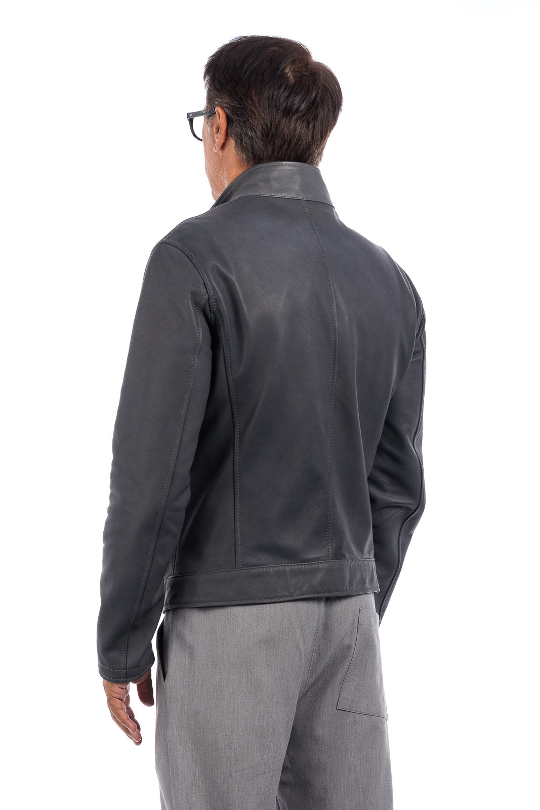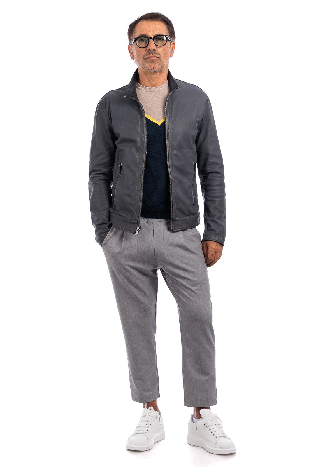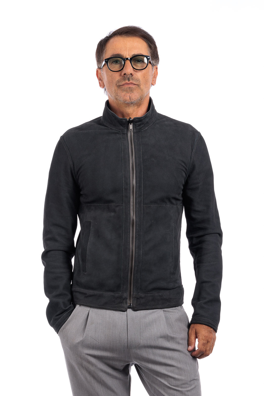 Giacca biker double face in pelle e camoscio uomo grigio