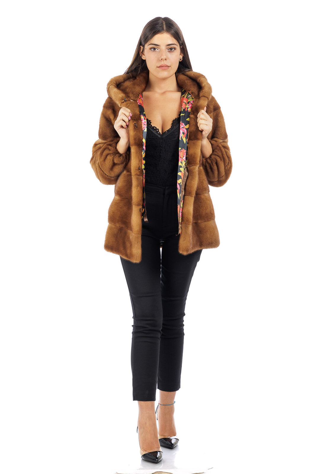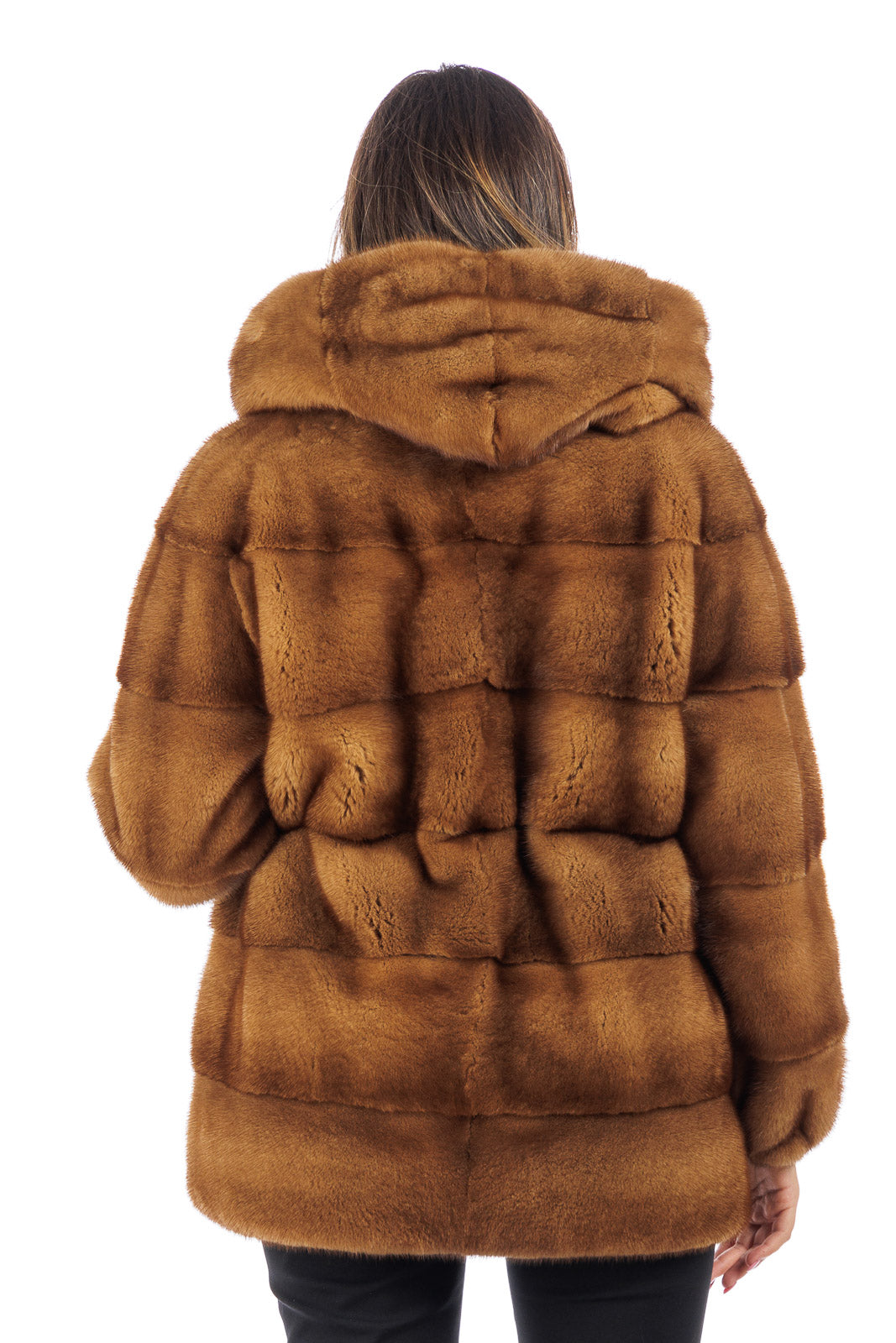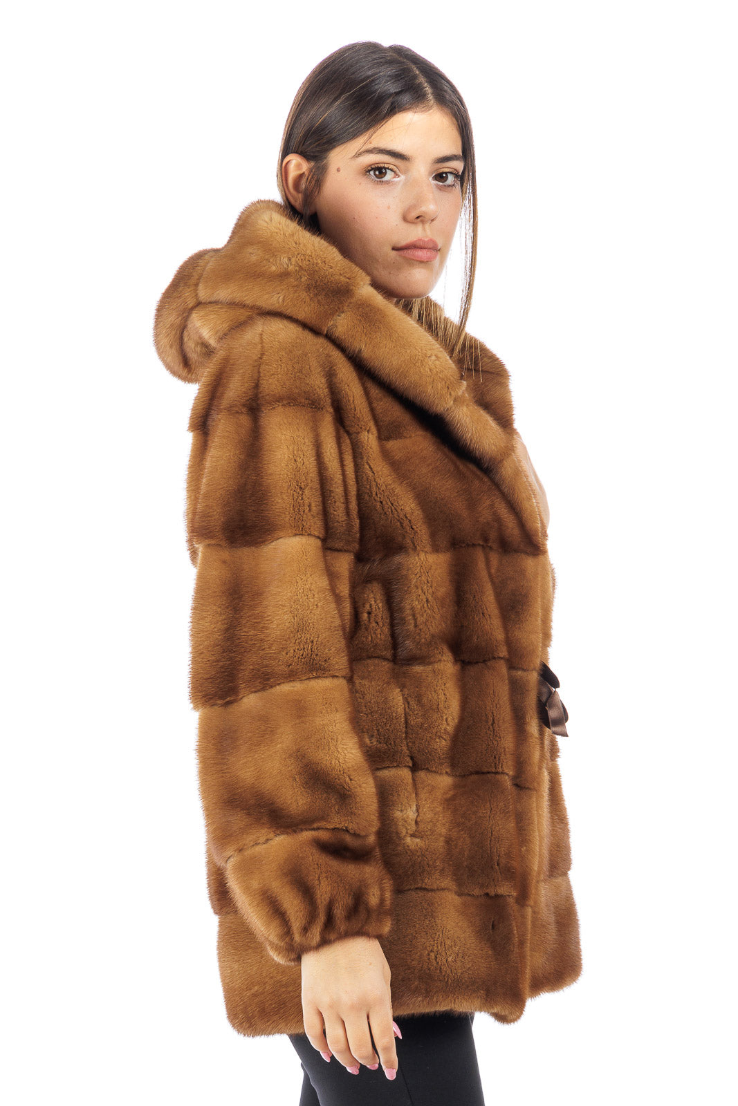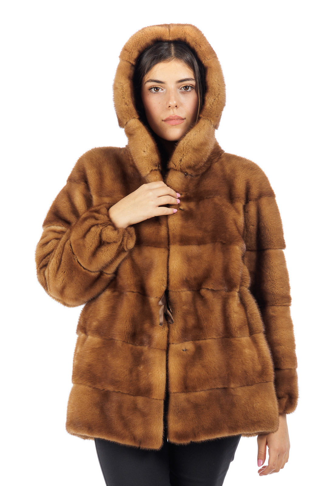 Giacca lunga di pelliccia di visone miele con cappuccio