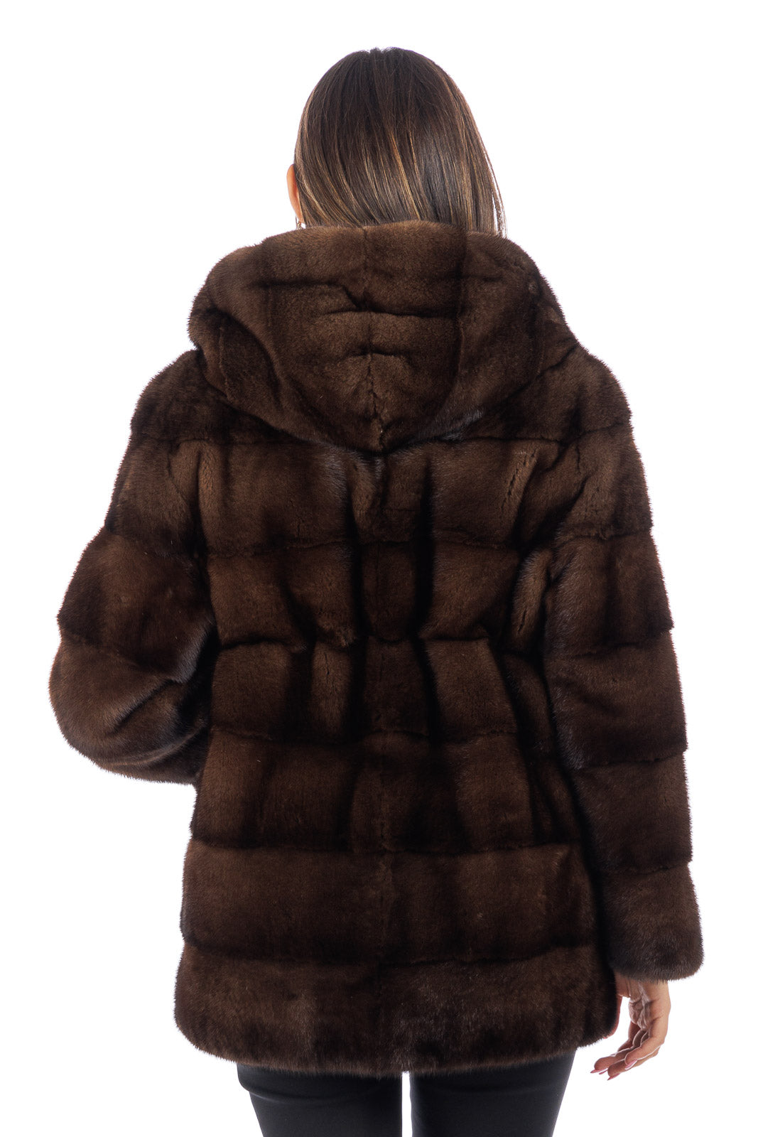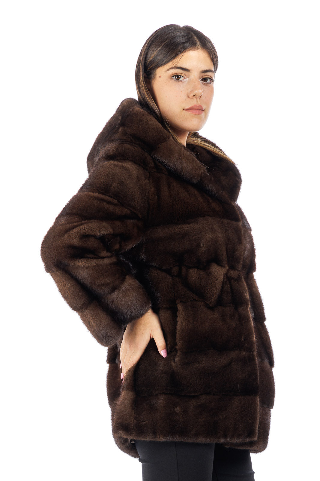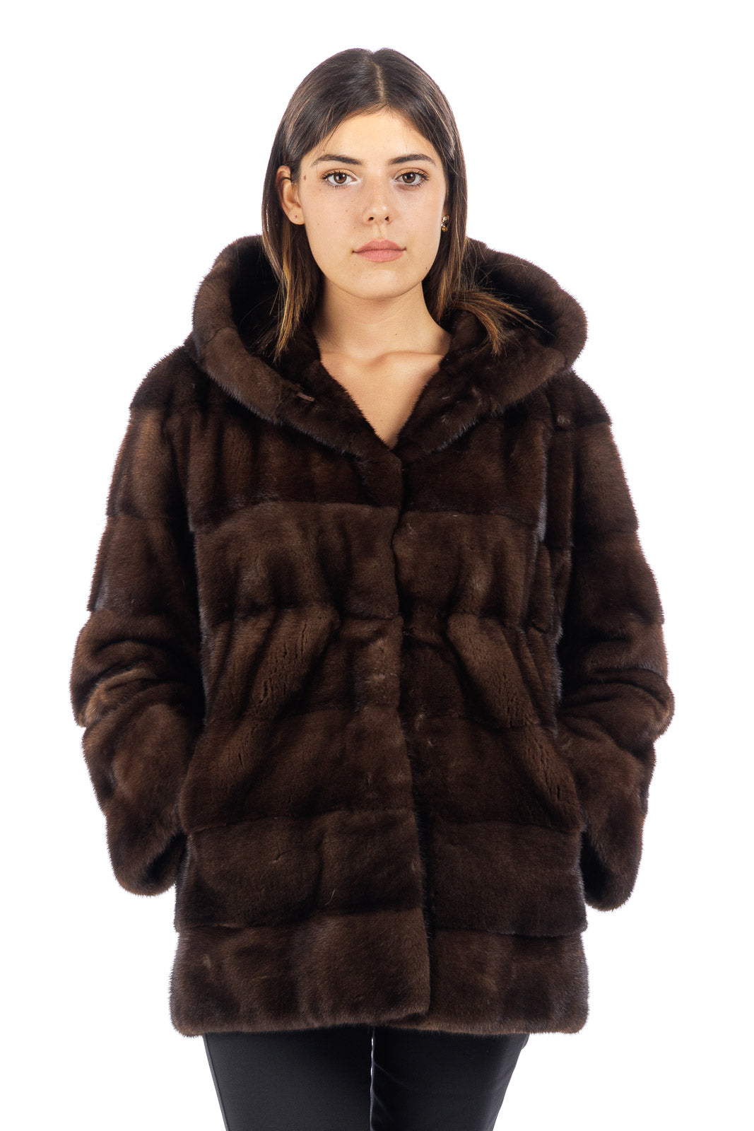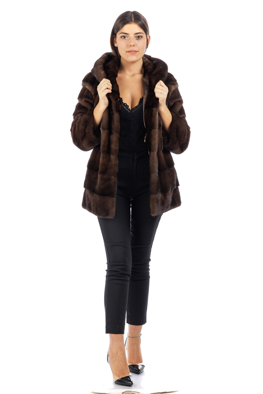 Giacca lunga in pelliccia donna Visone demy buff con Cappuccio