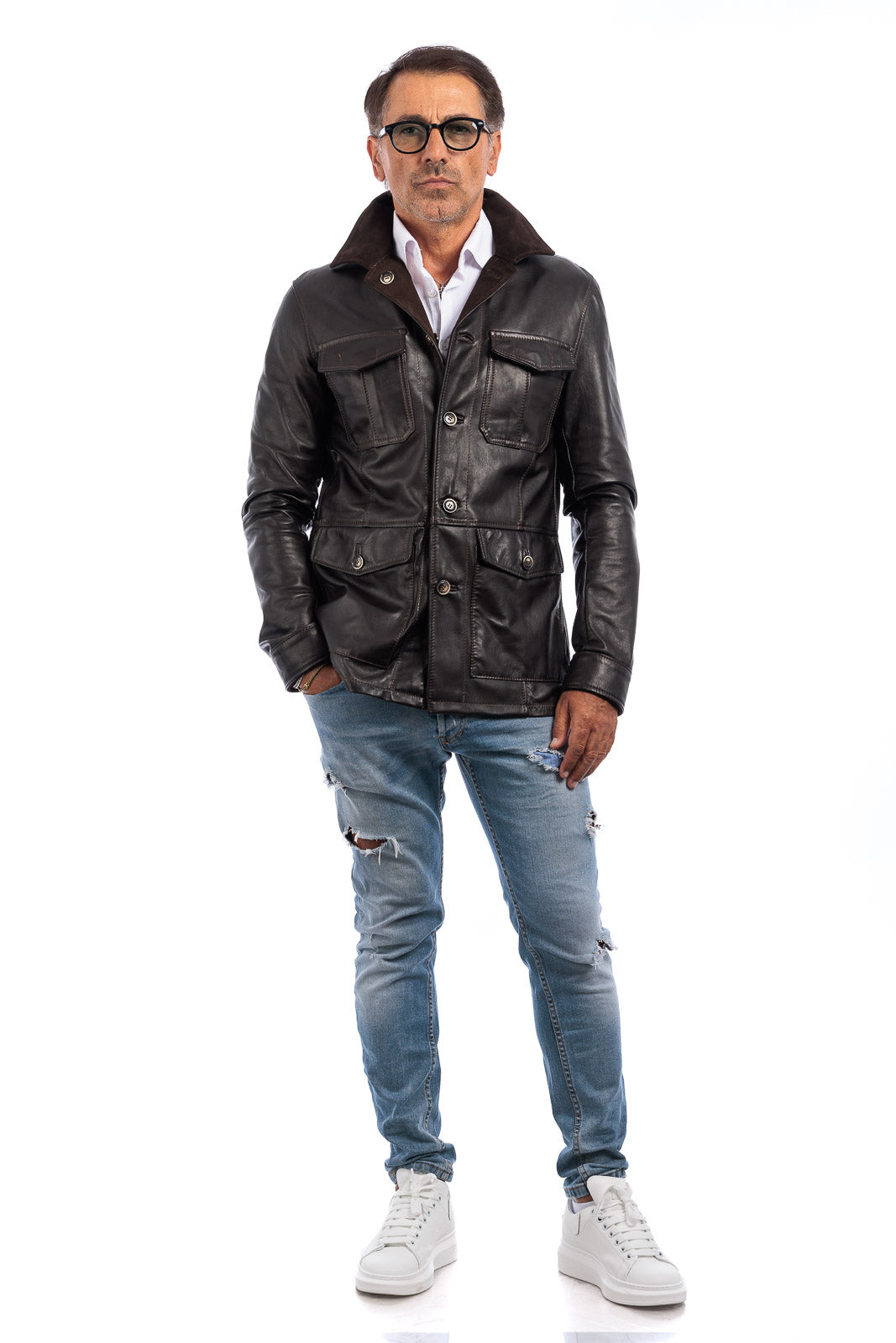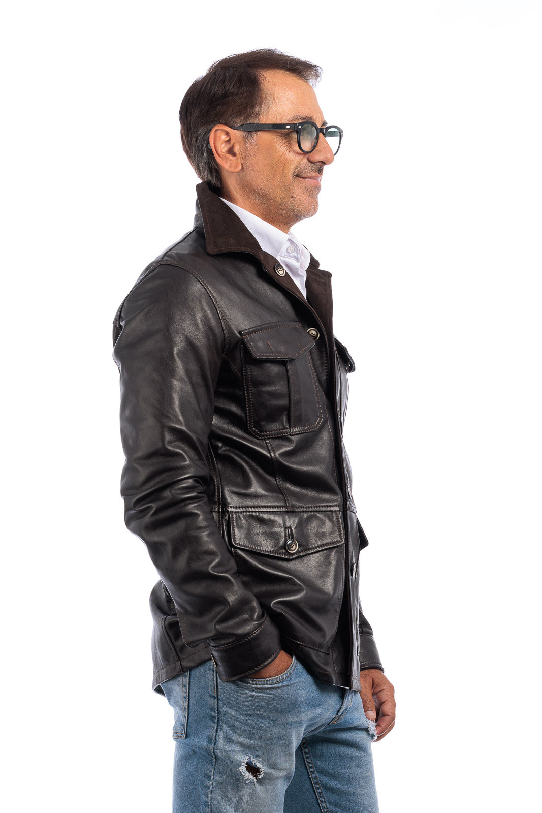 Giacca sahariana double face in pelle e camoscio idrorepellente uomo testa di moro