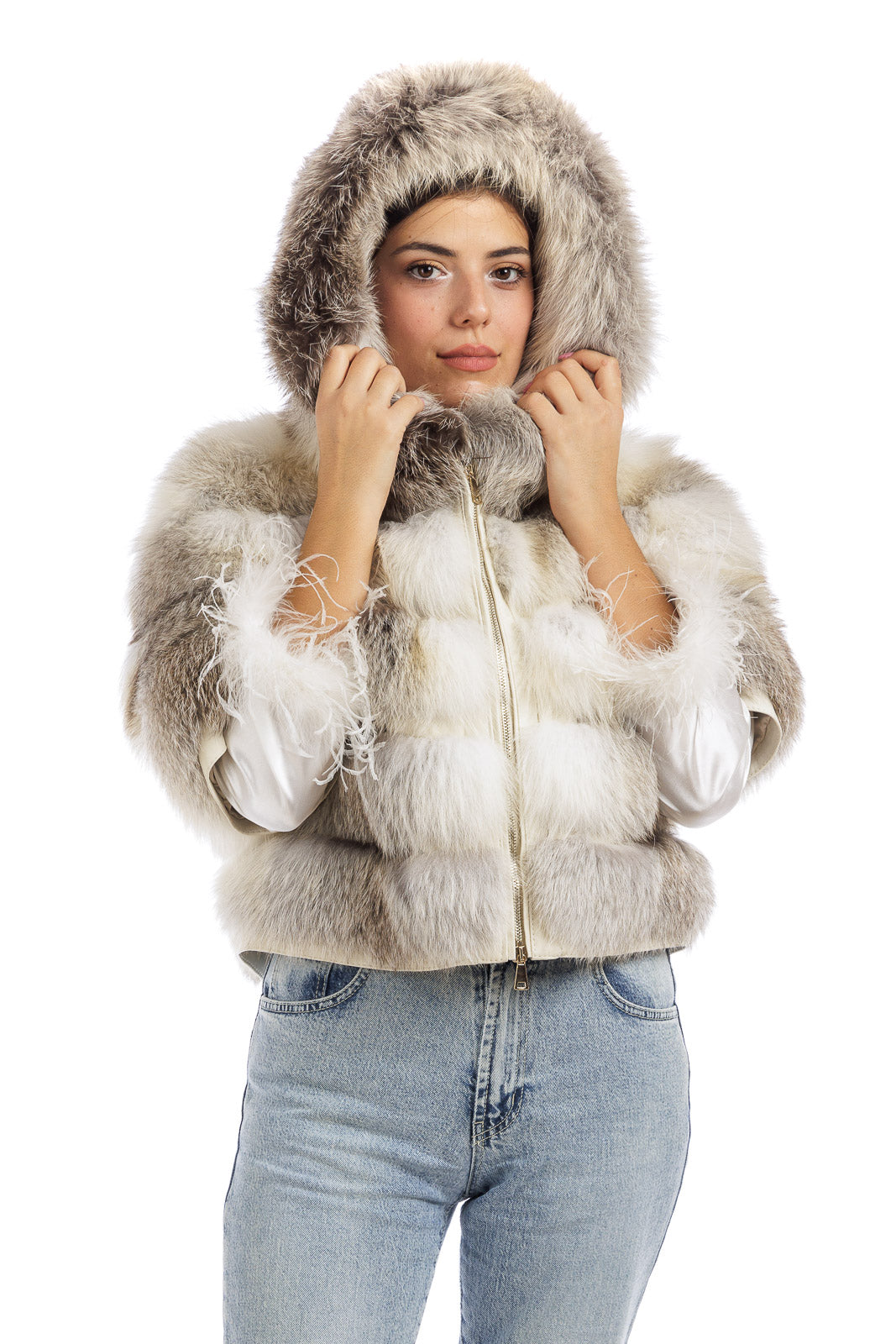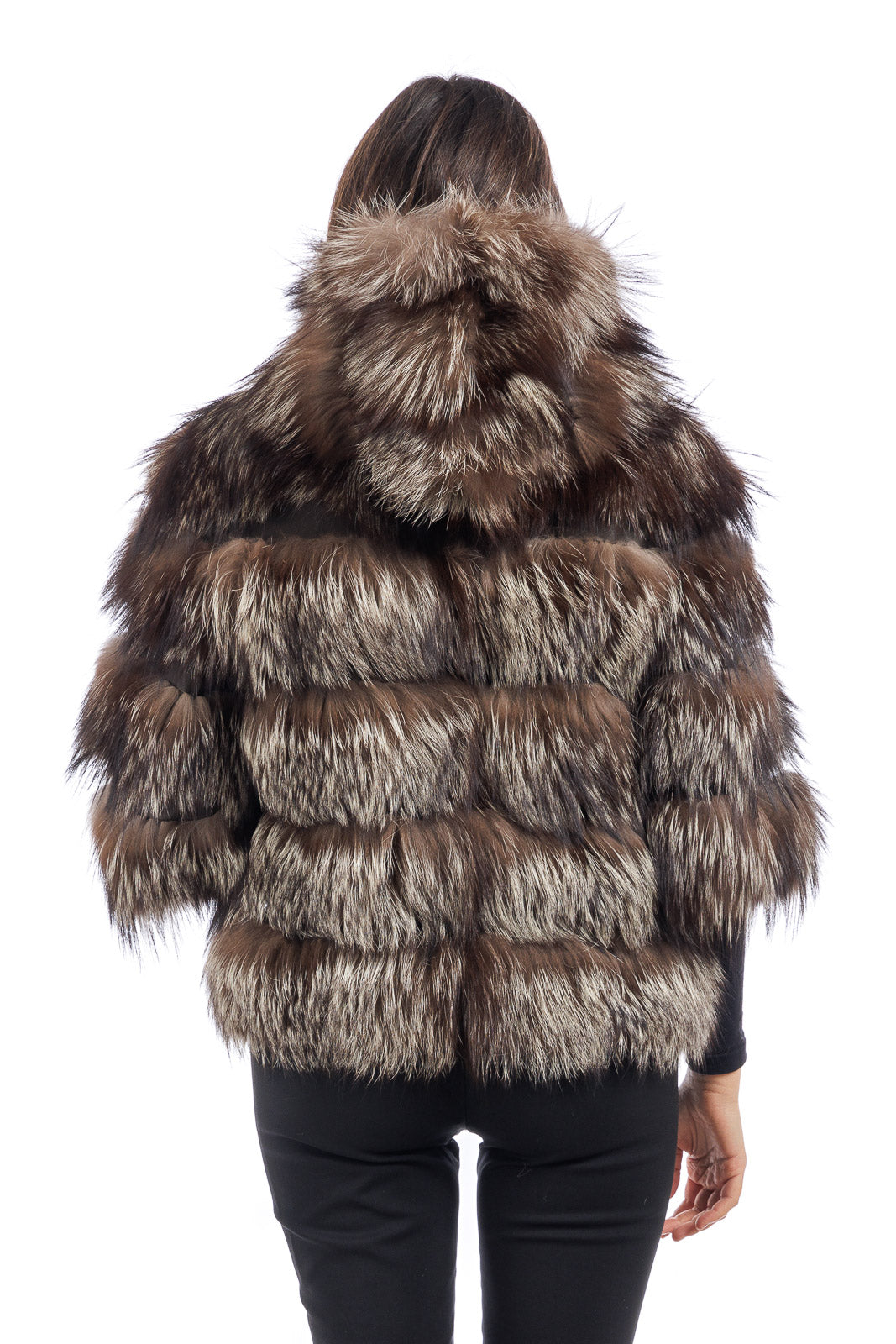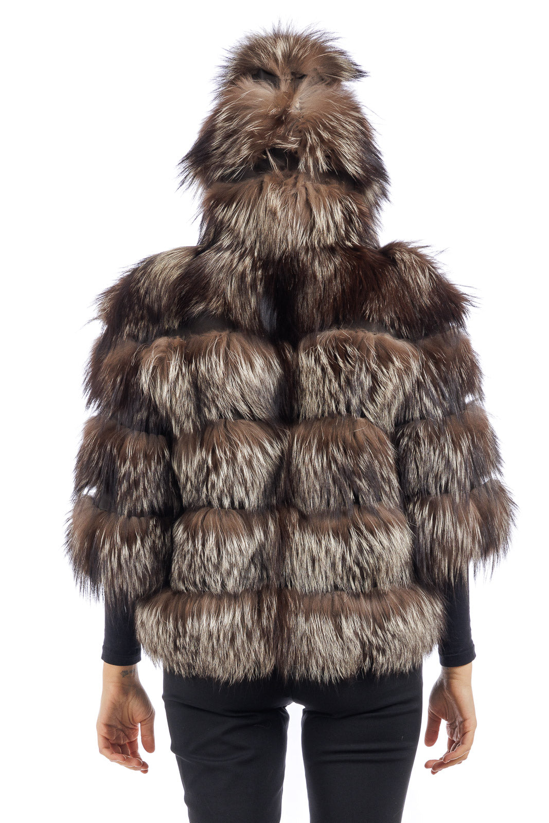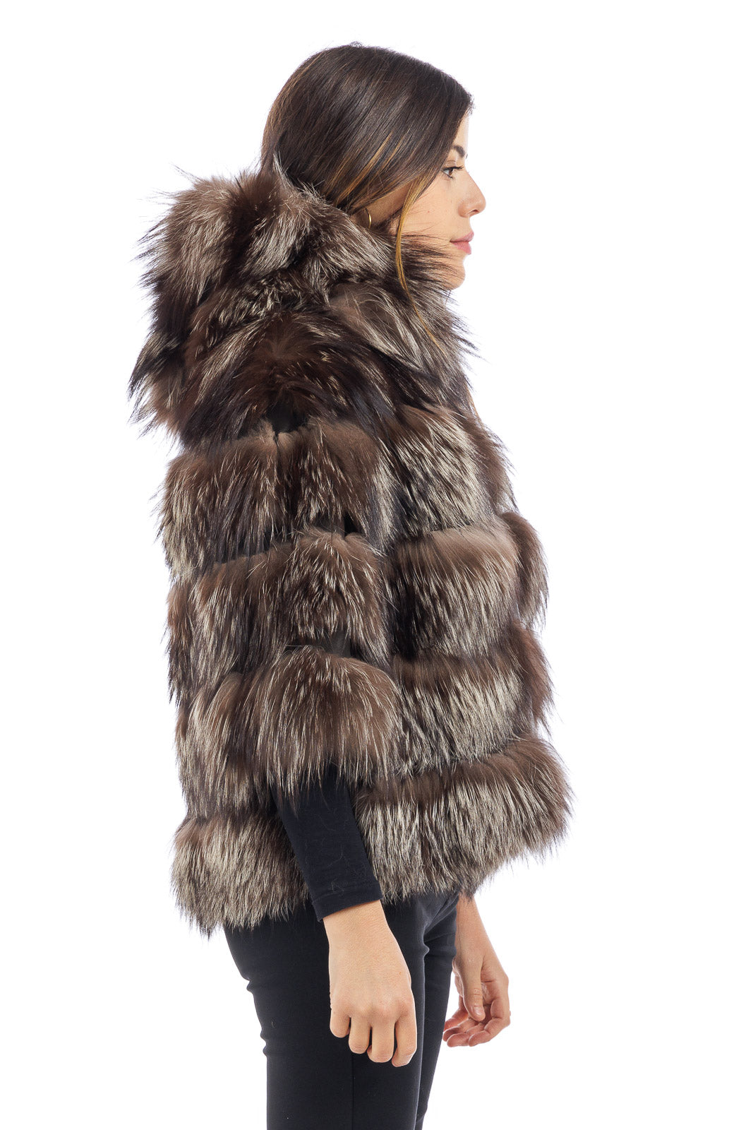 Giubbotto in pelliccia di volpe argentata con cappuccio e manica tre quarti