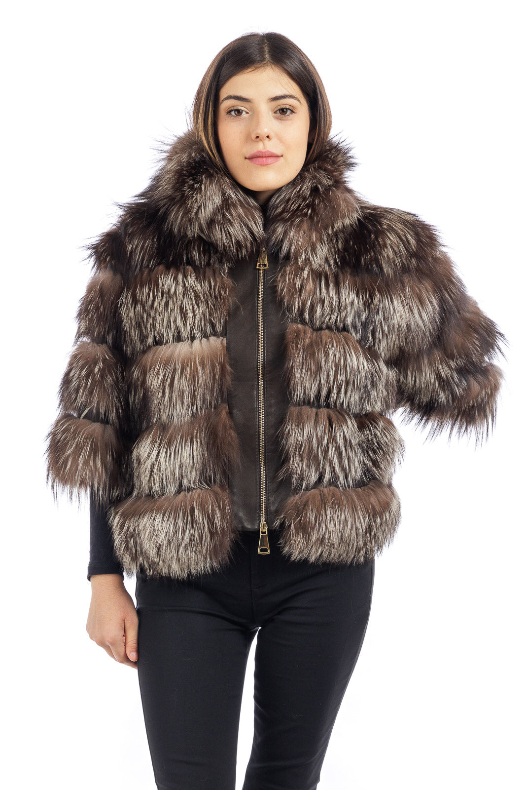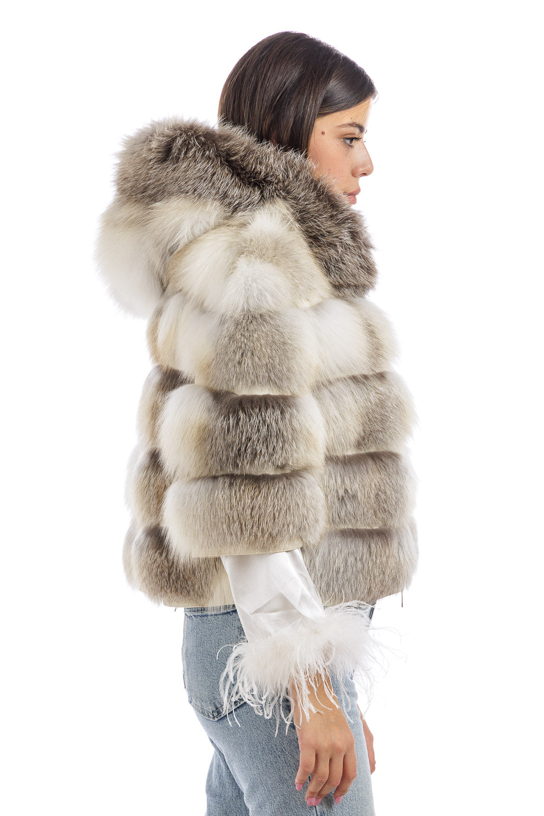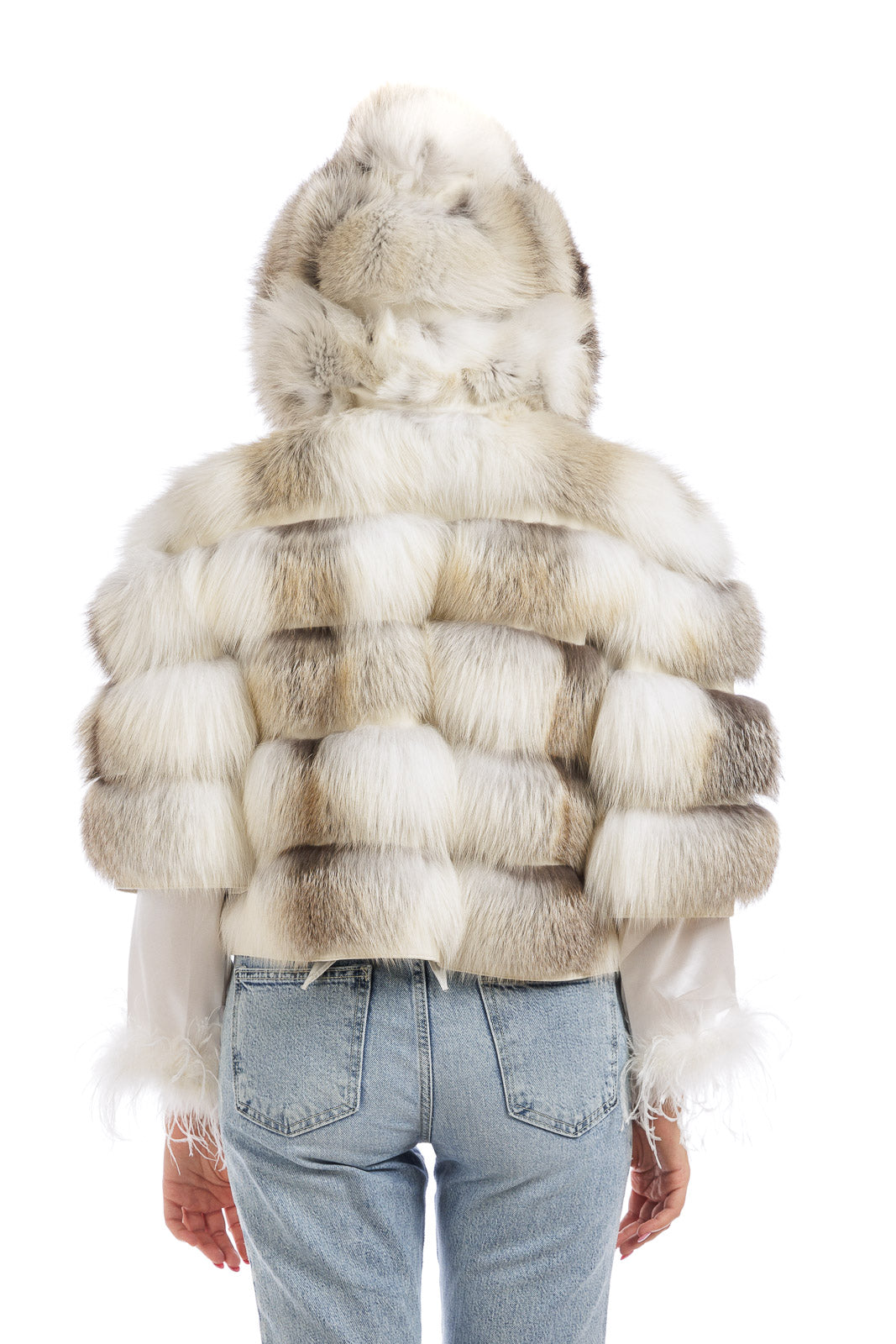 Giubbotto in pelliccia di volpe argentata con cappuccio e manica tre quarti