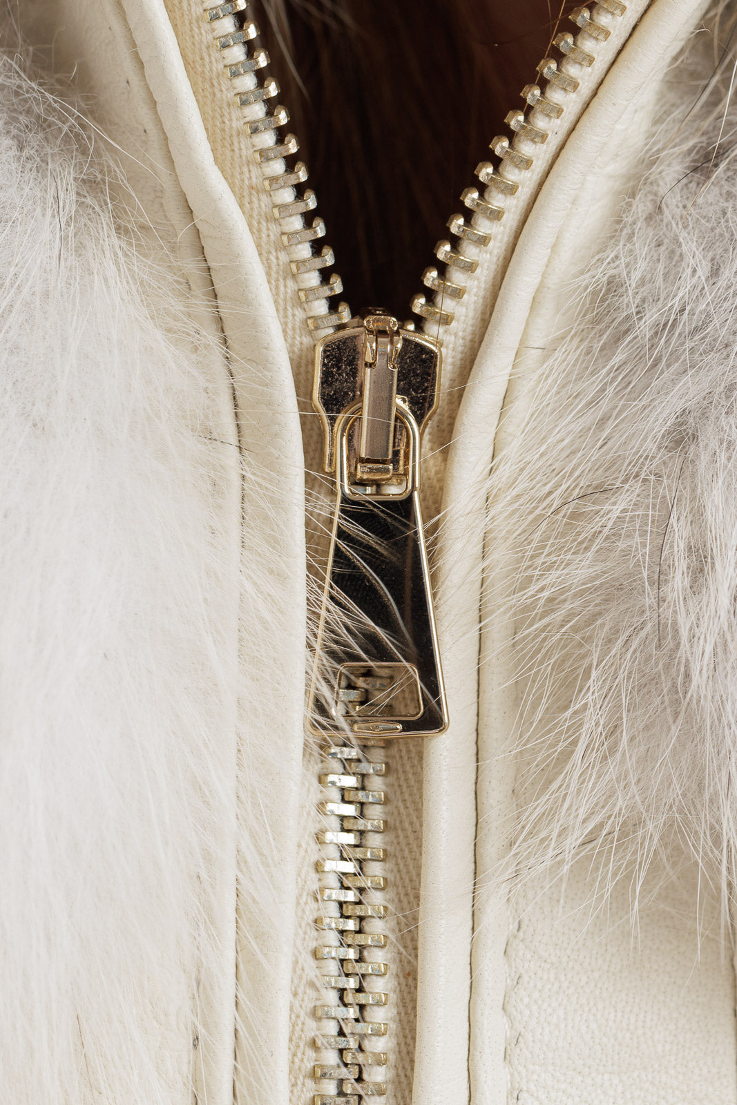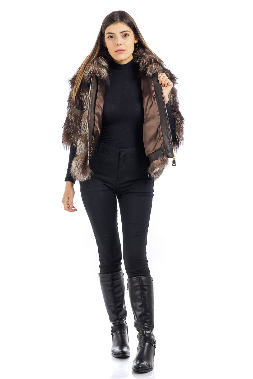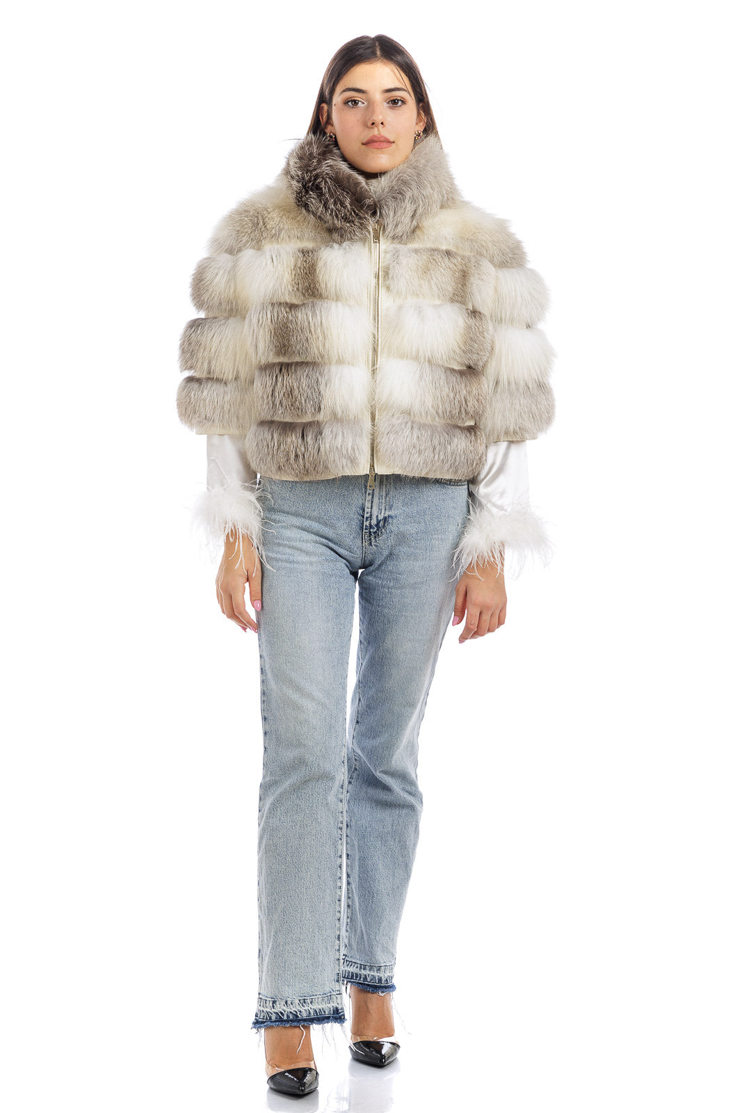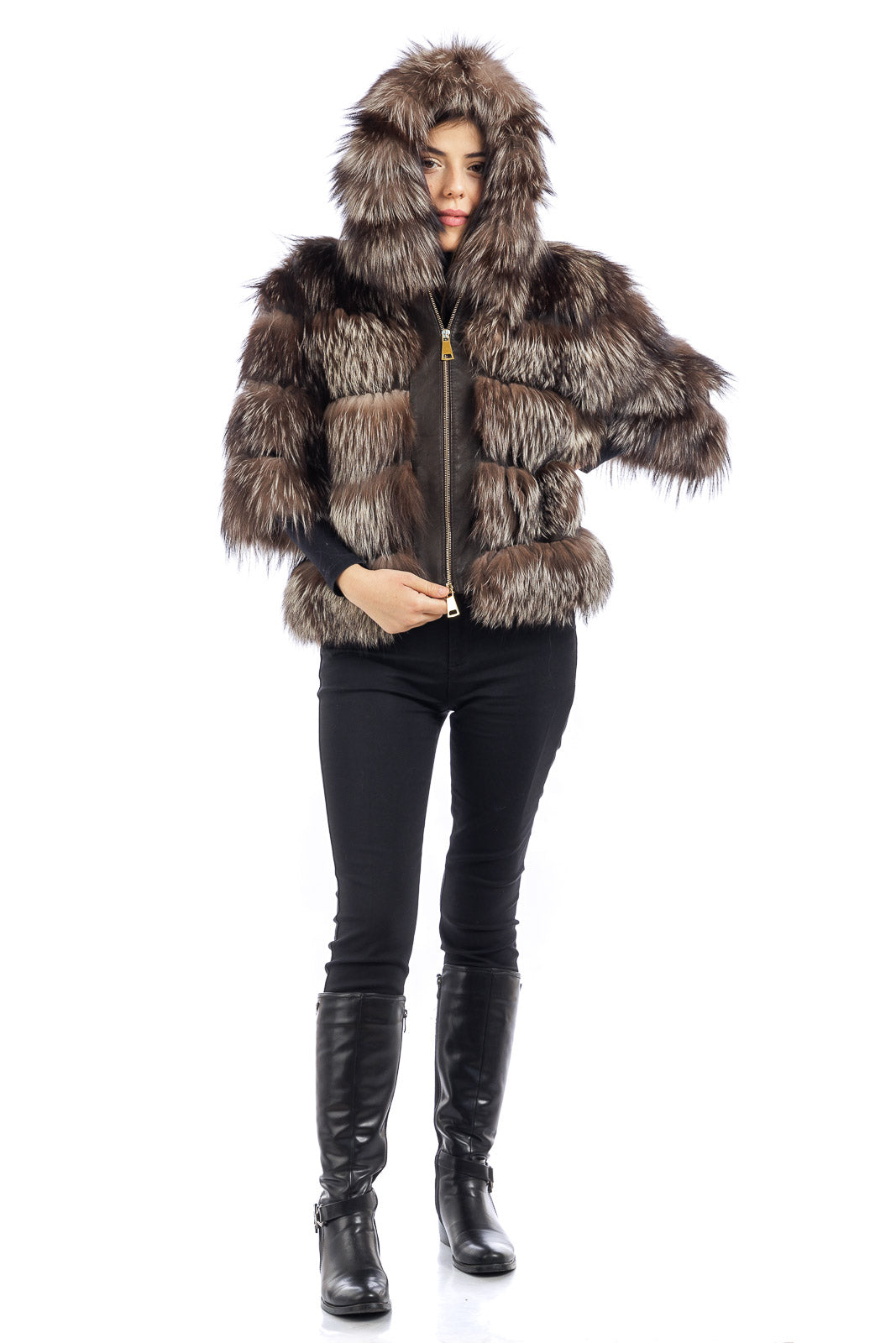Giubbotto in pelliccia di volpe argentata con cappuccio e manica tre quarti