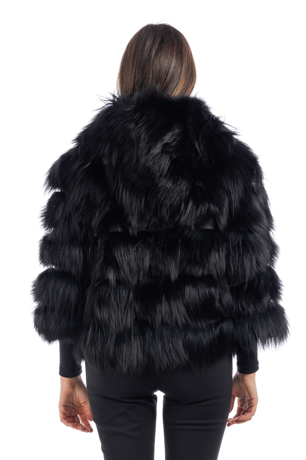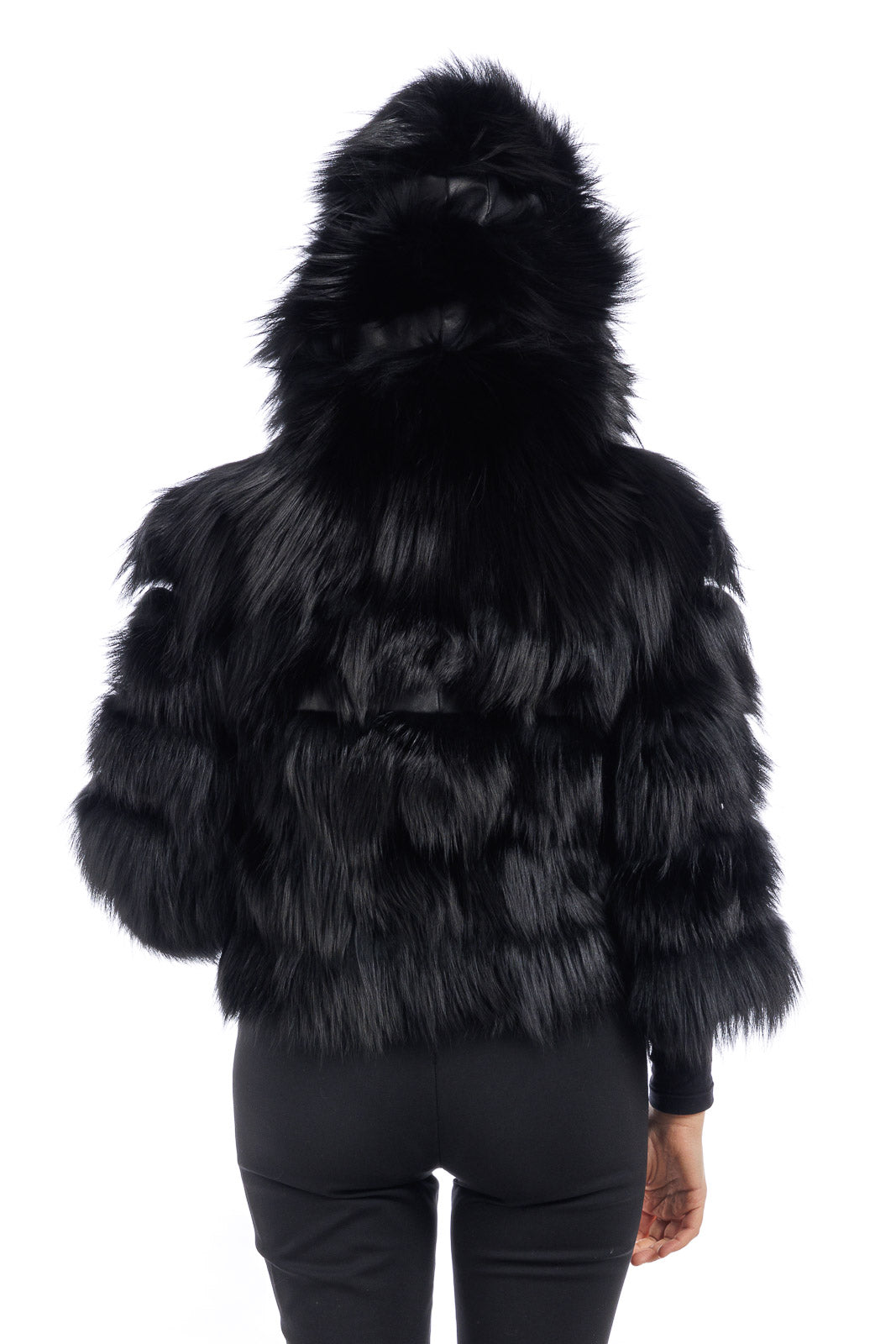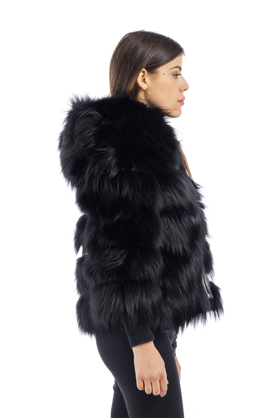 Giubbotto in pelliccia di volpe nero con cappuccio e manica tre quarti