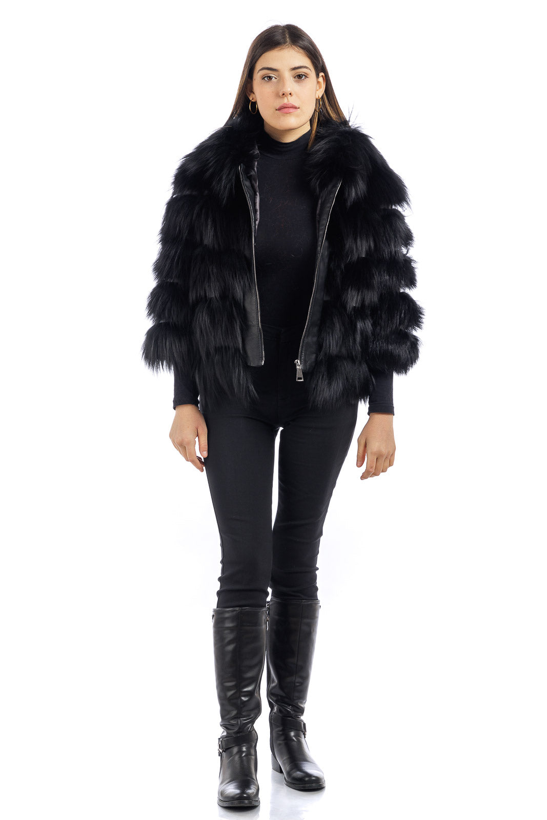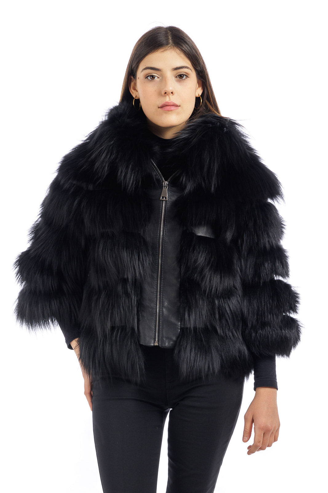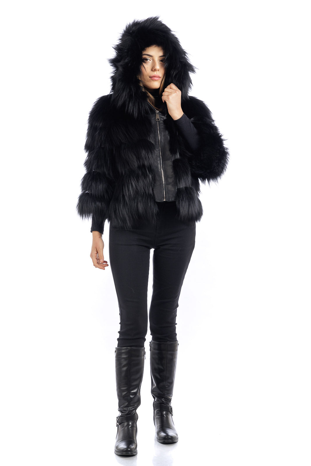 Giubbotto in pelliccia di volpe nero con cappuccio e manica tre quarti