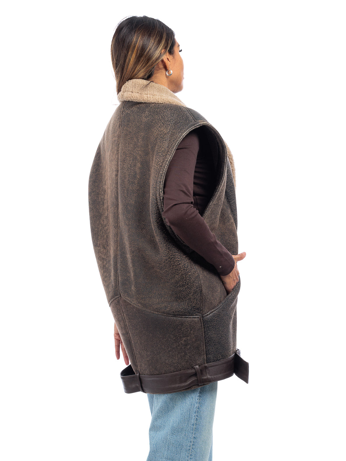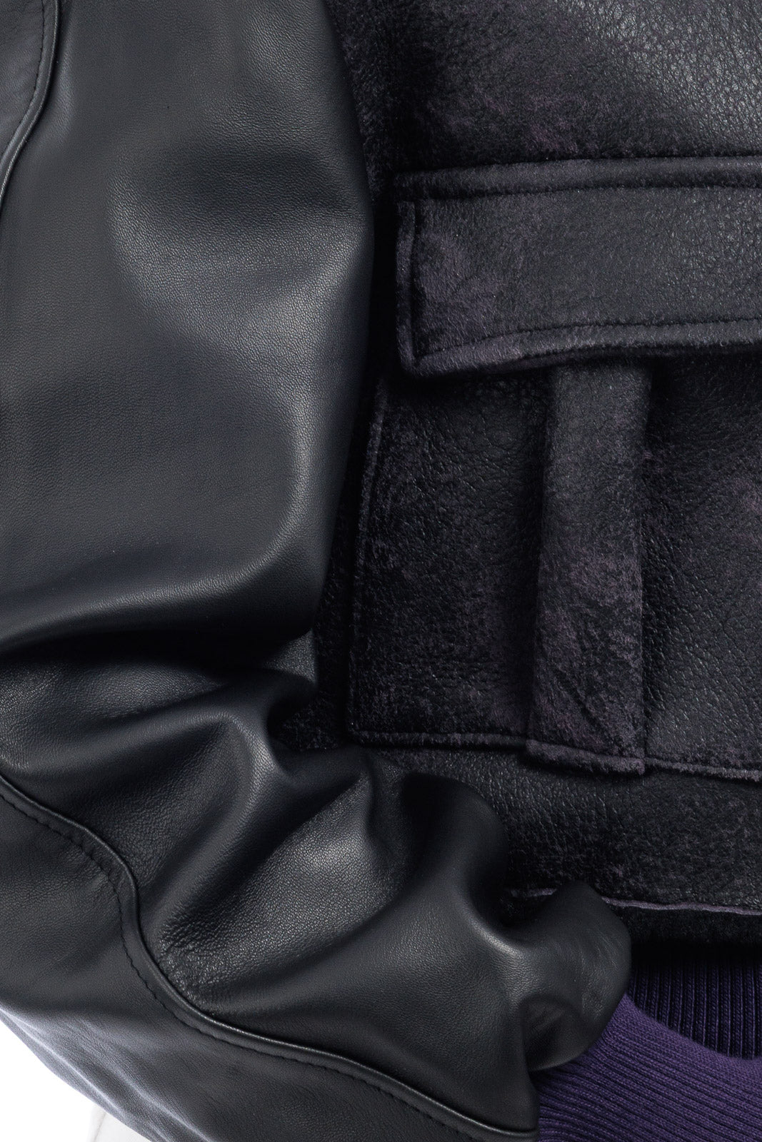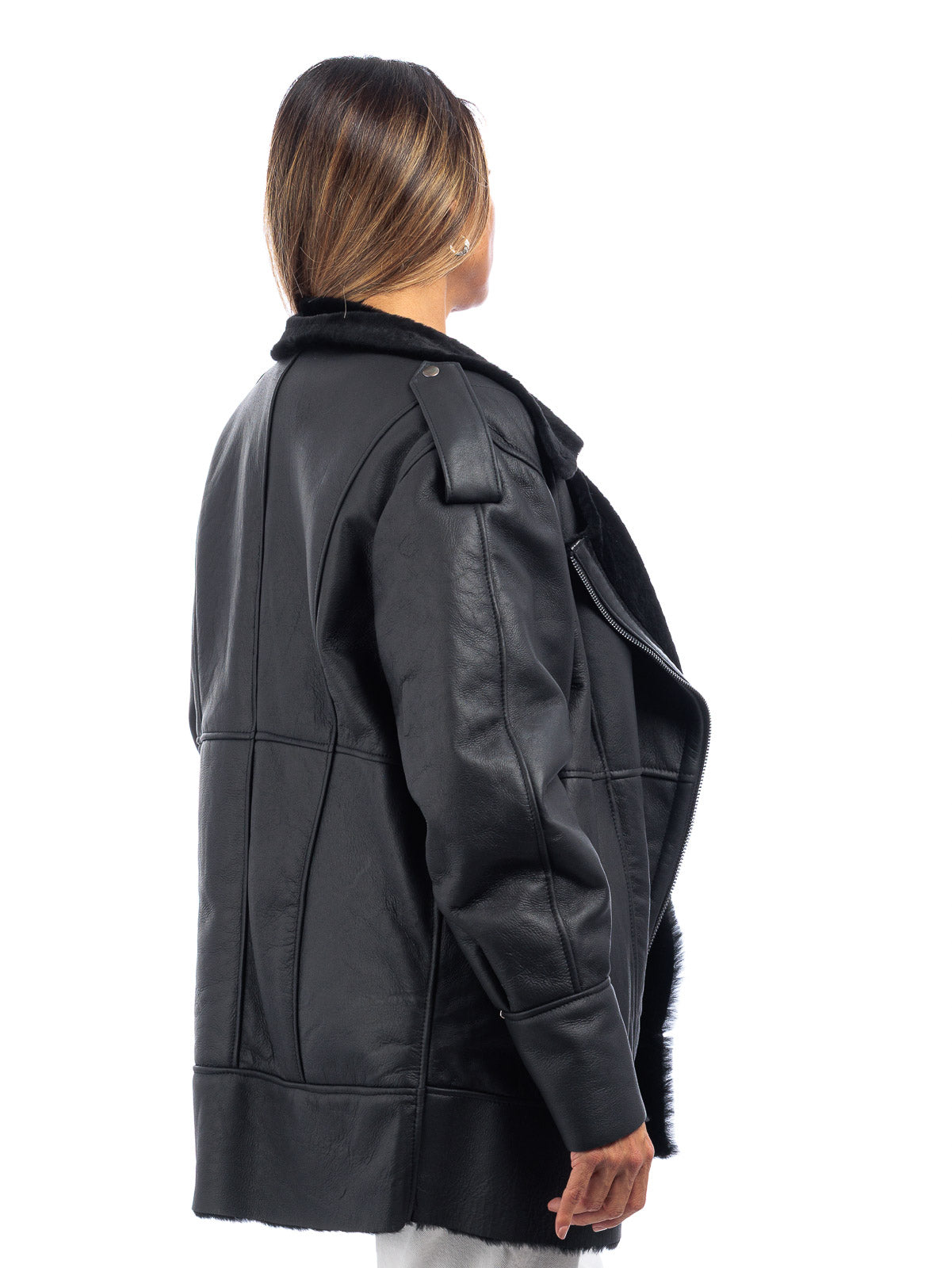 Giacca in montone viola da donna con zip e maniche in pelle - linea OVER