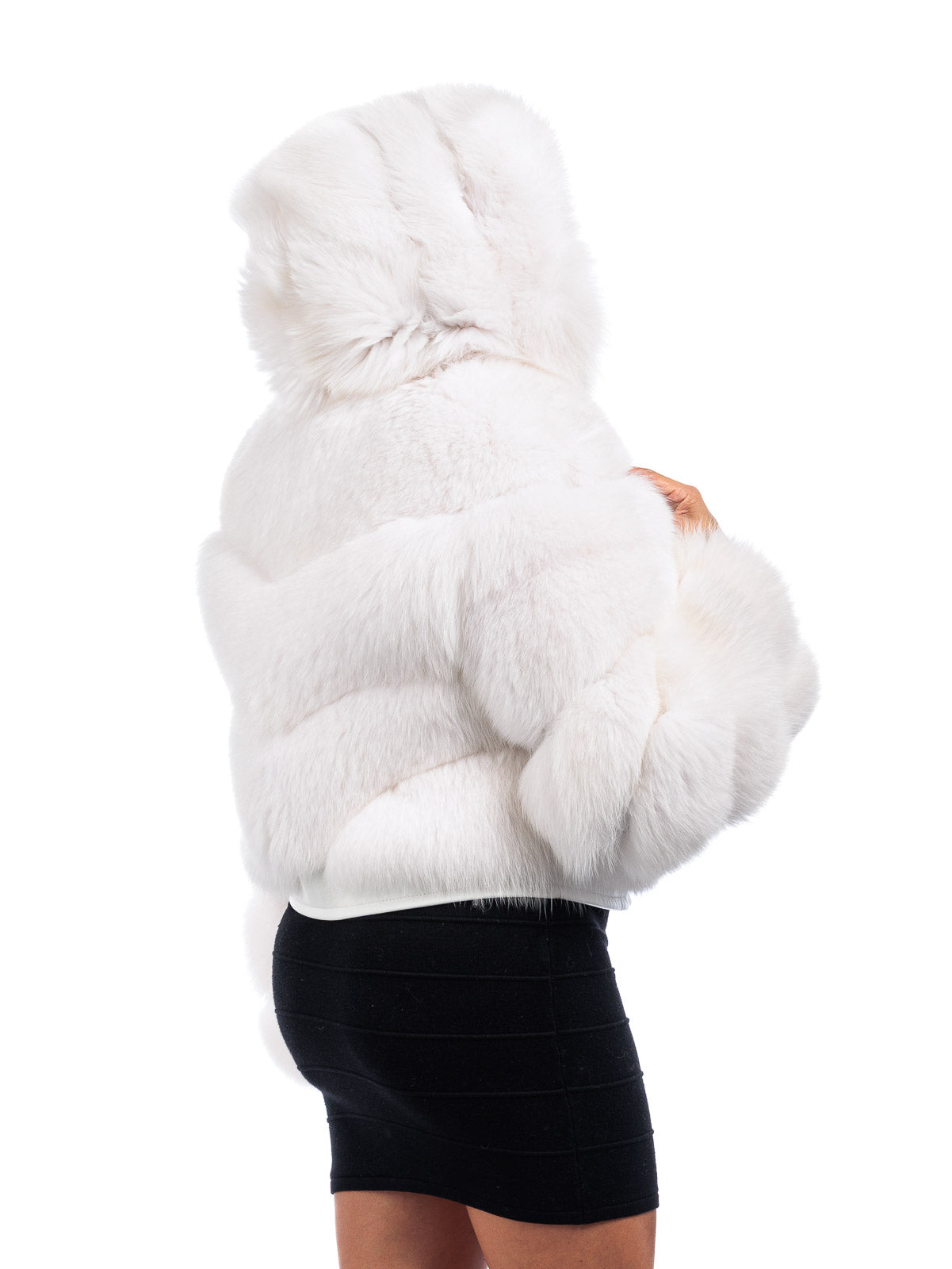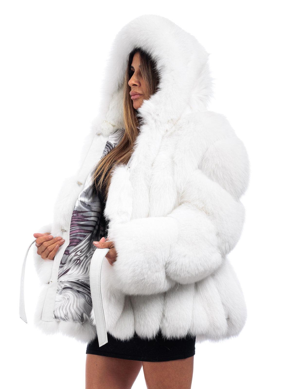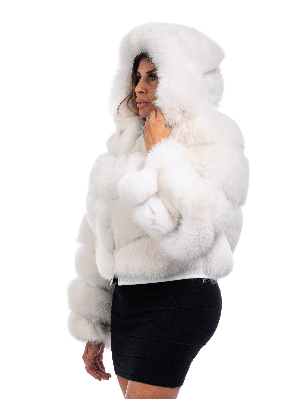 Giubbotto in pelliccia di volpe bianca corto con cappuccio