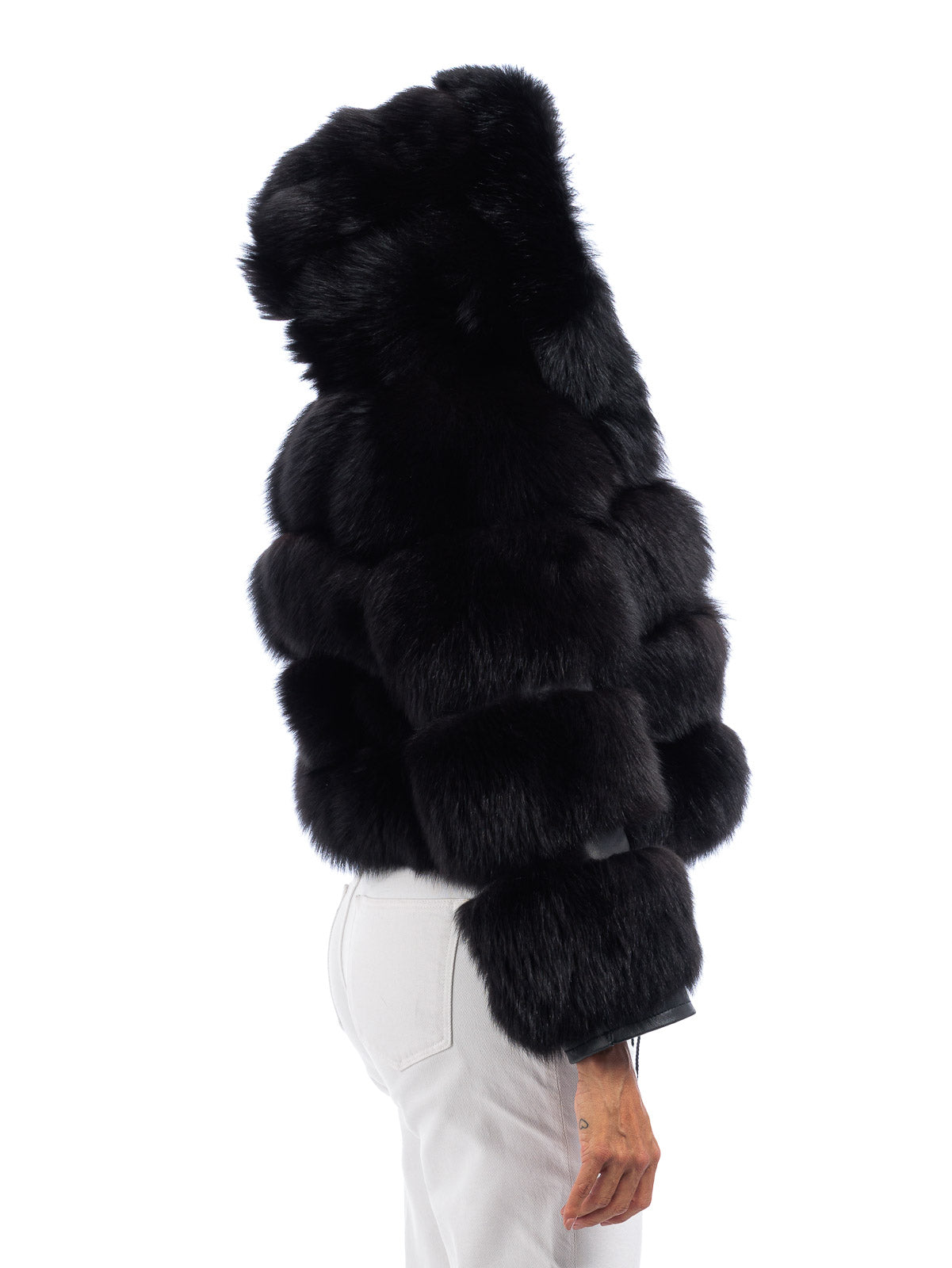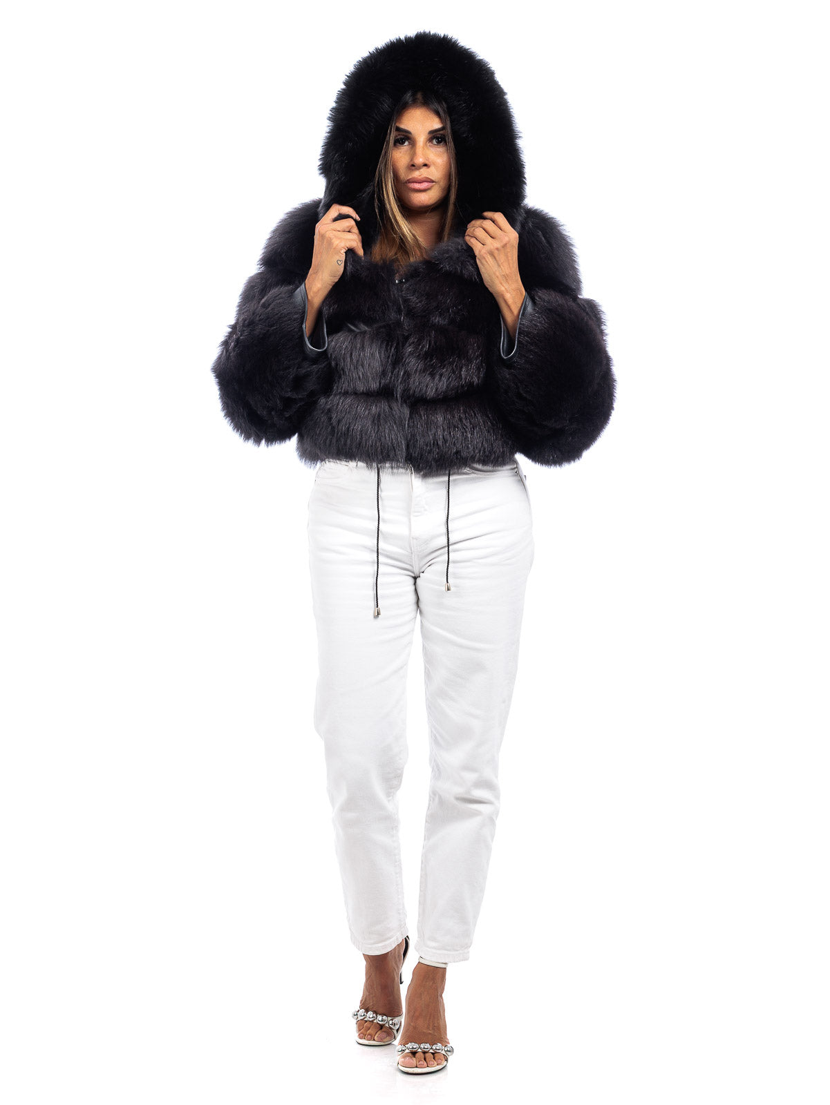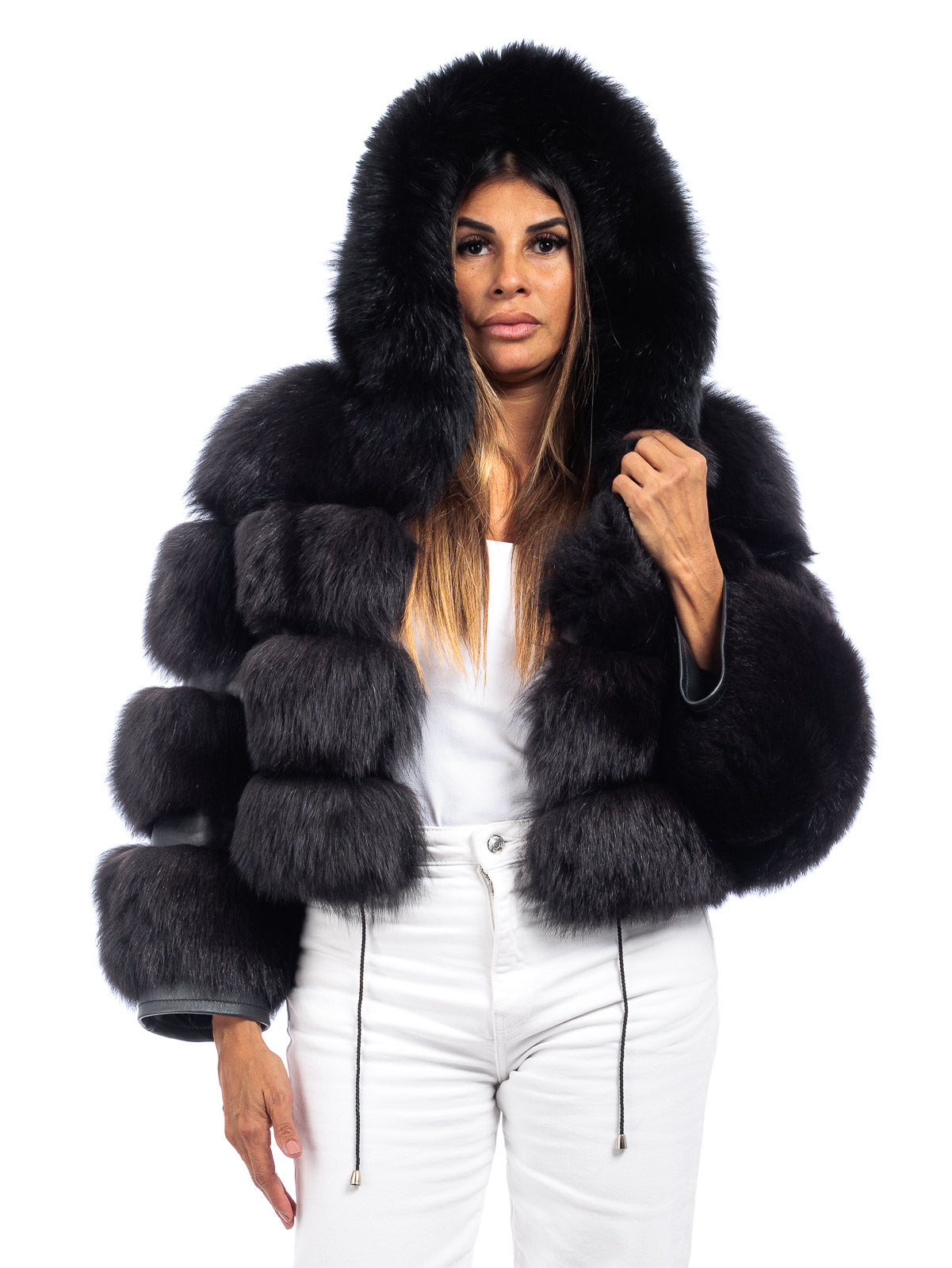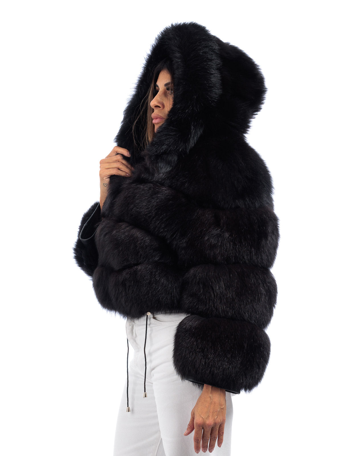Giubbotto in pelliccia di volpe nera corto con cappuccio