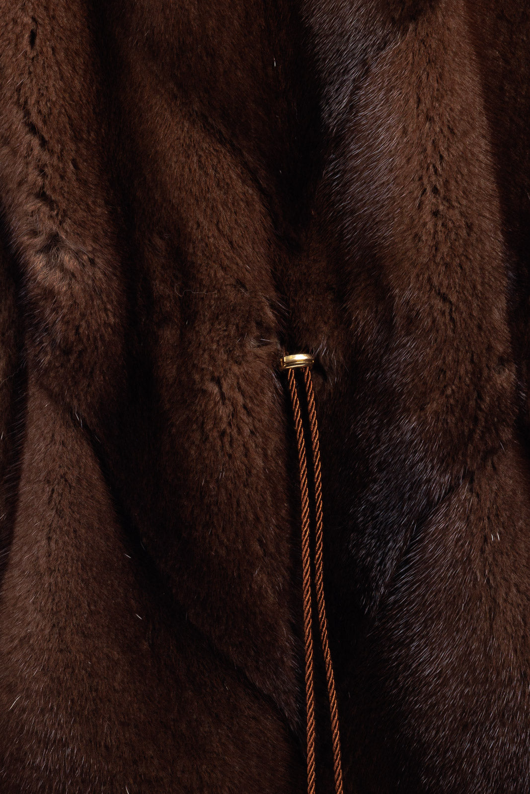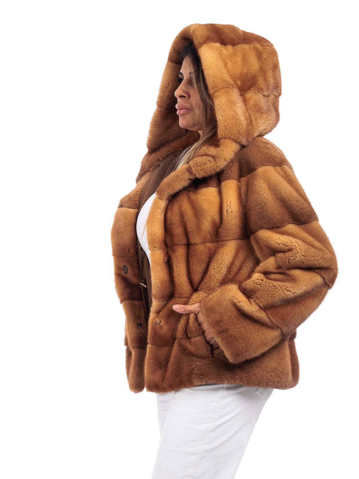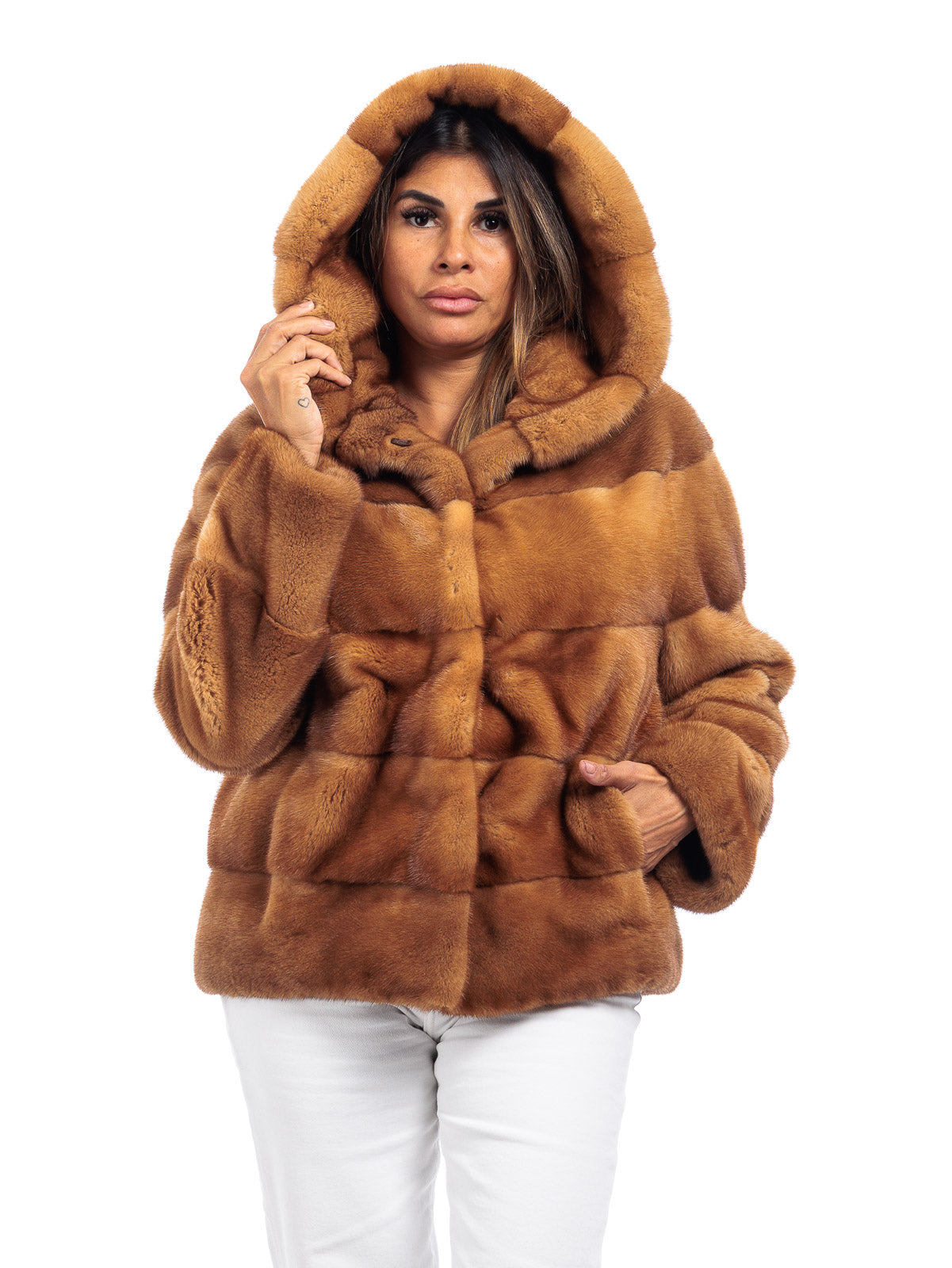 Giacca lunga di pelliccia di visone miele con cappuccio