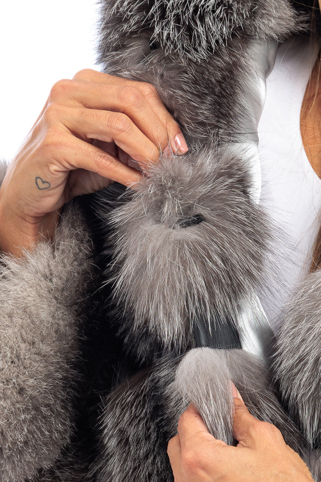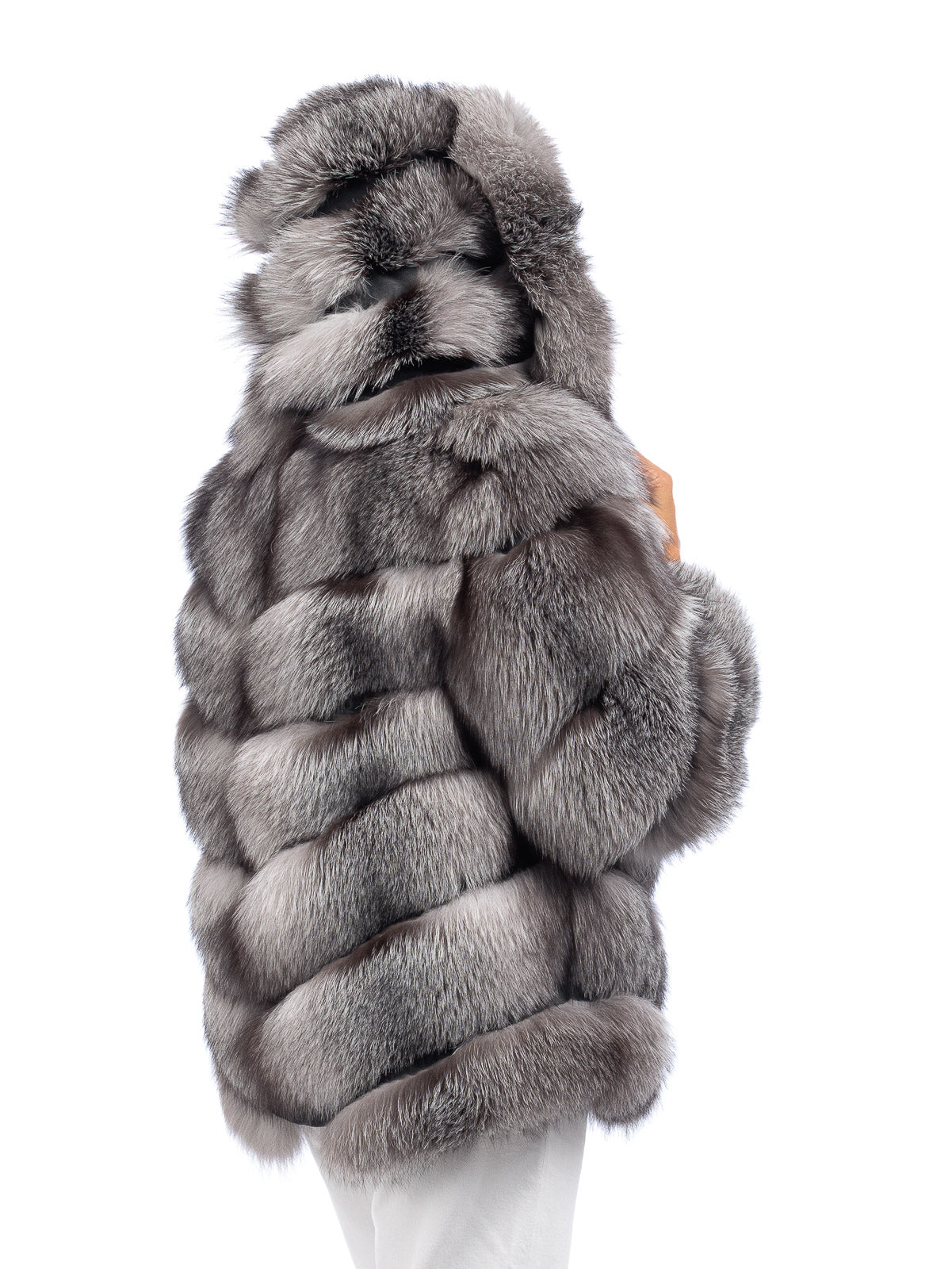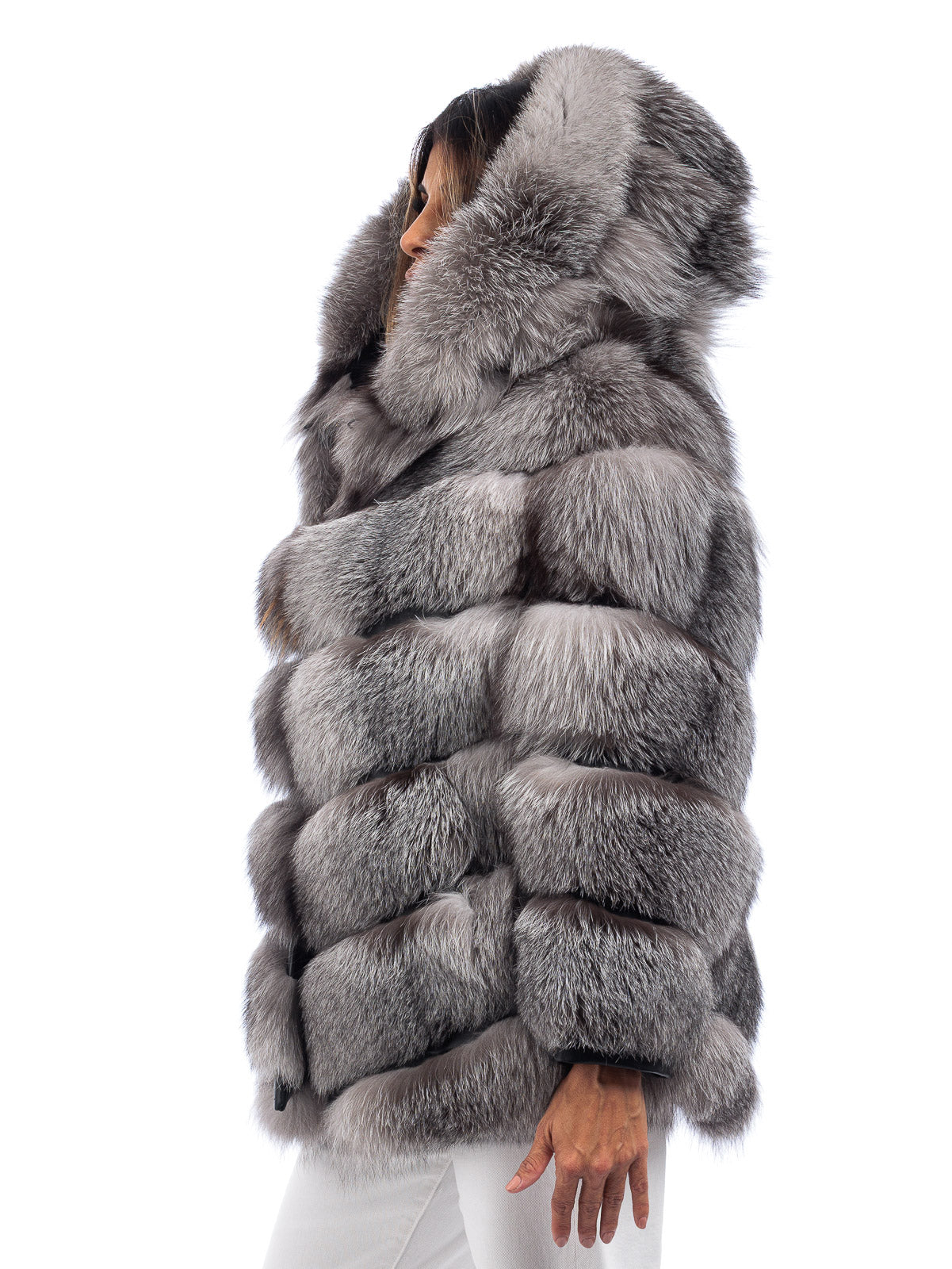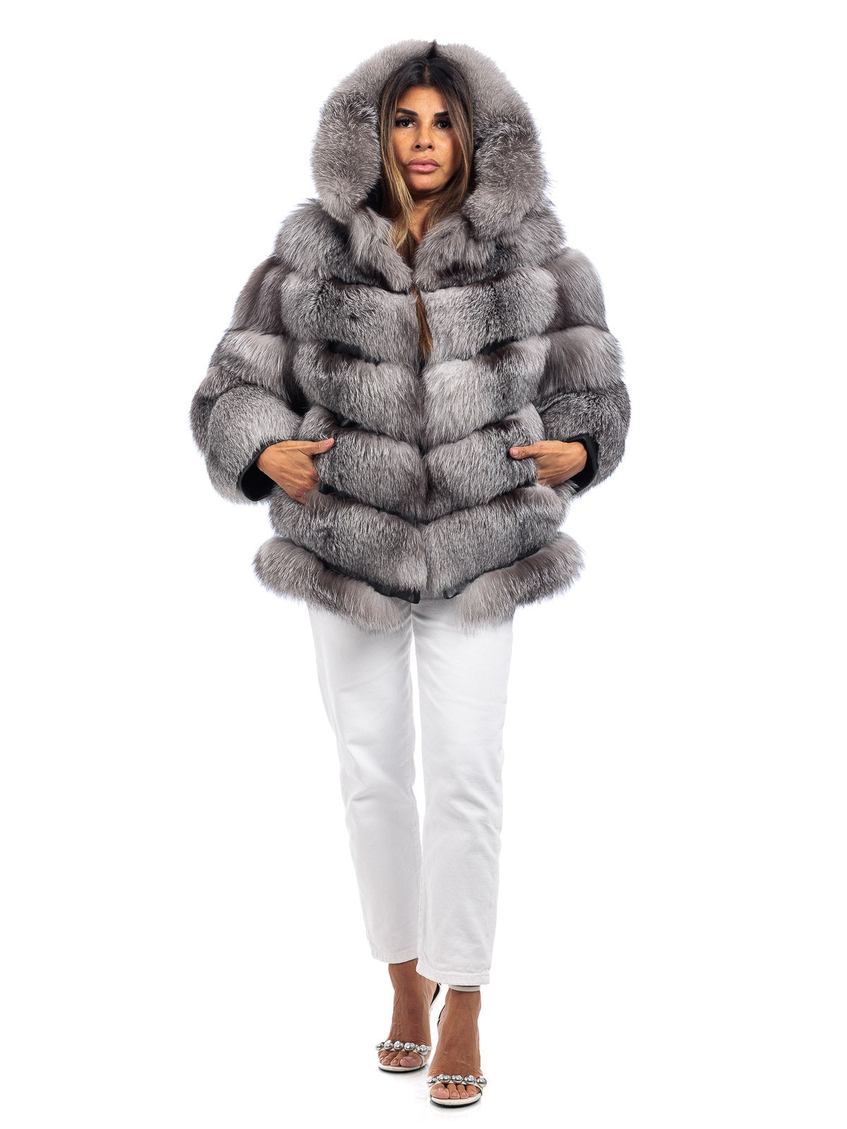 Giubbotto in pelliccia di volpe con cappuccio e manica tre quarti