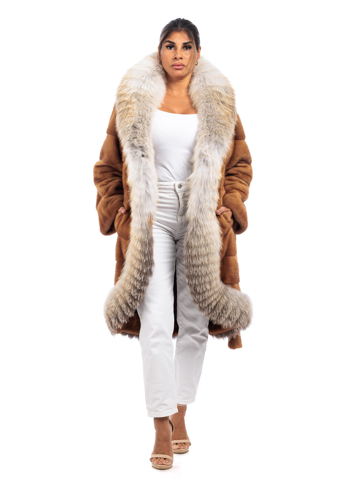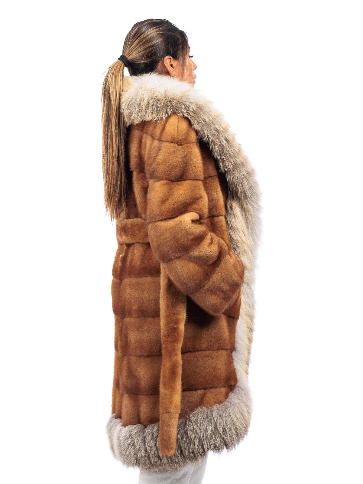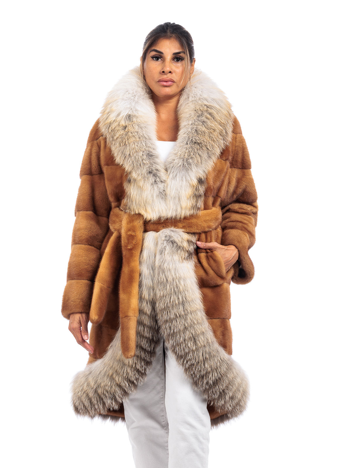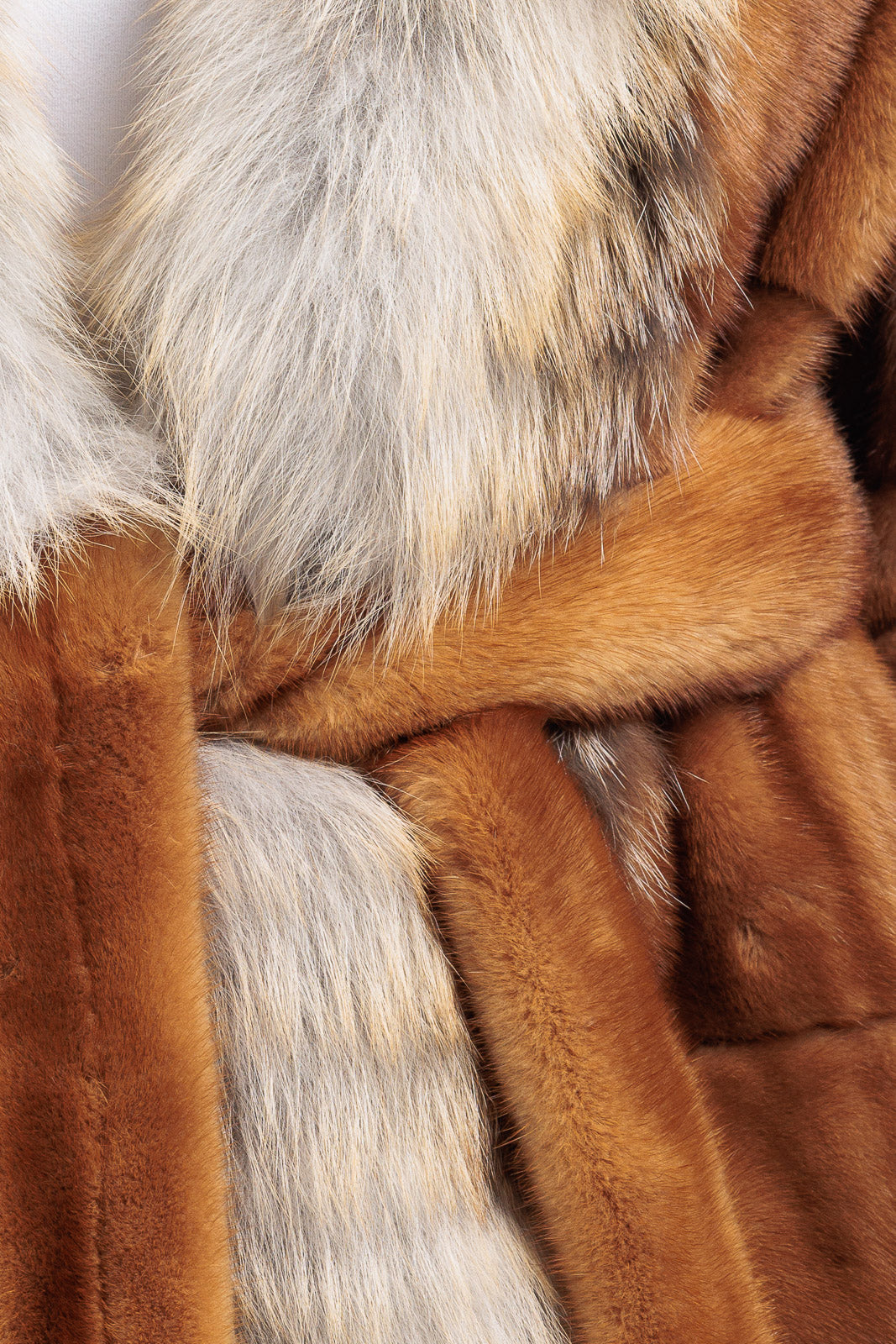 Vestaglia in pelliccia di visone miele con bordo in volpe