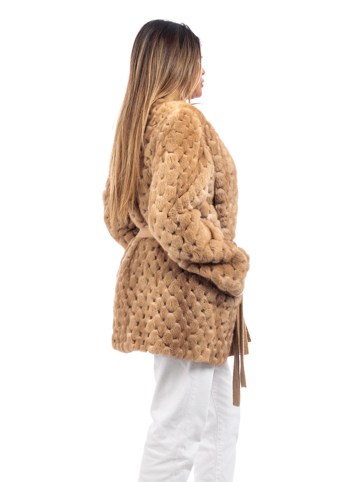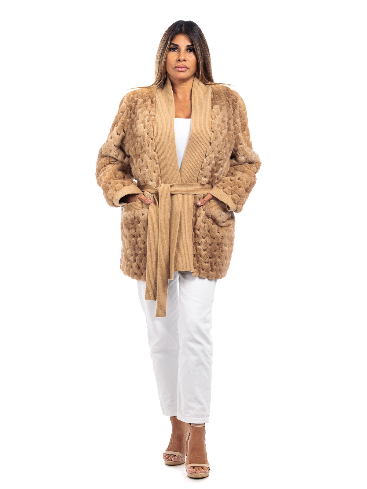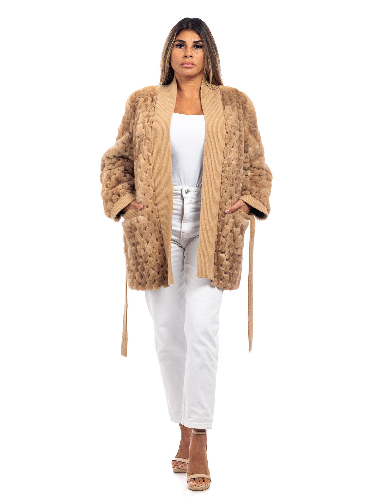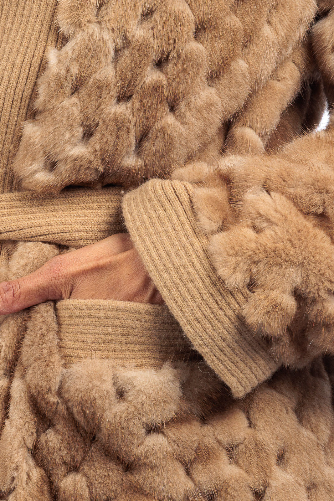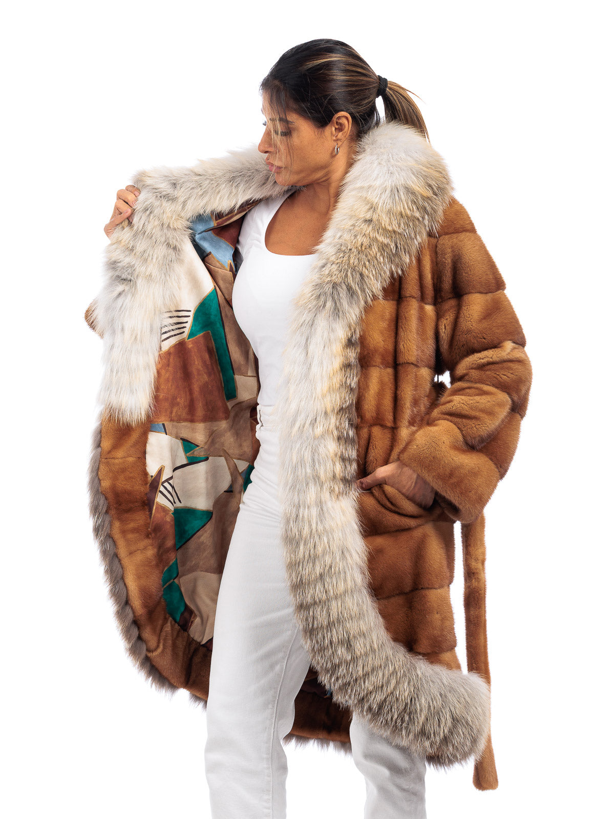 Vestaglia in pelliccia di visone miele con bordo in volpe