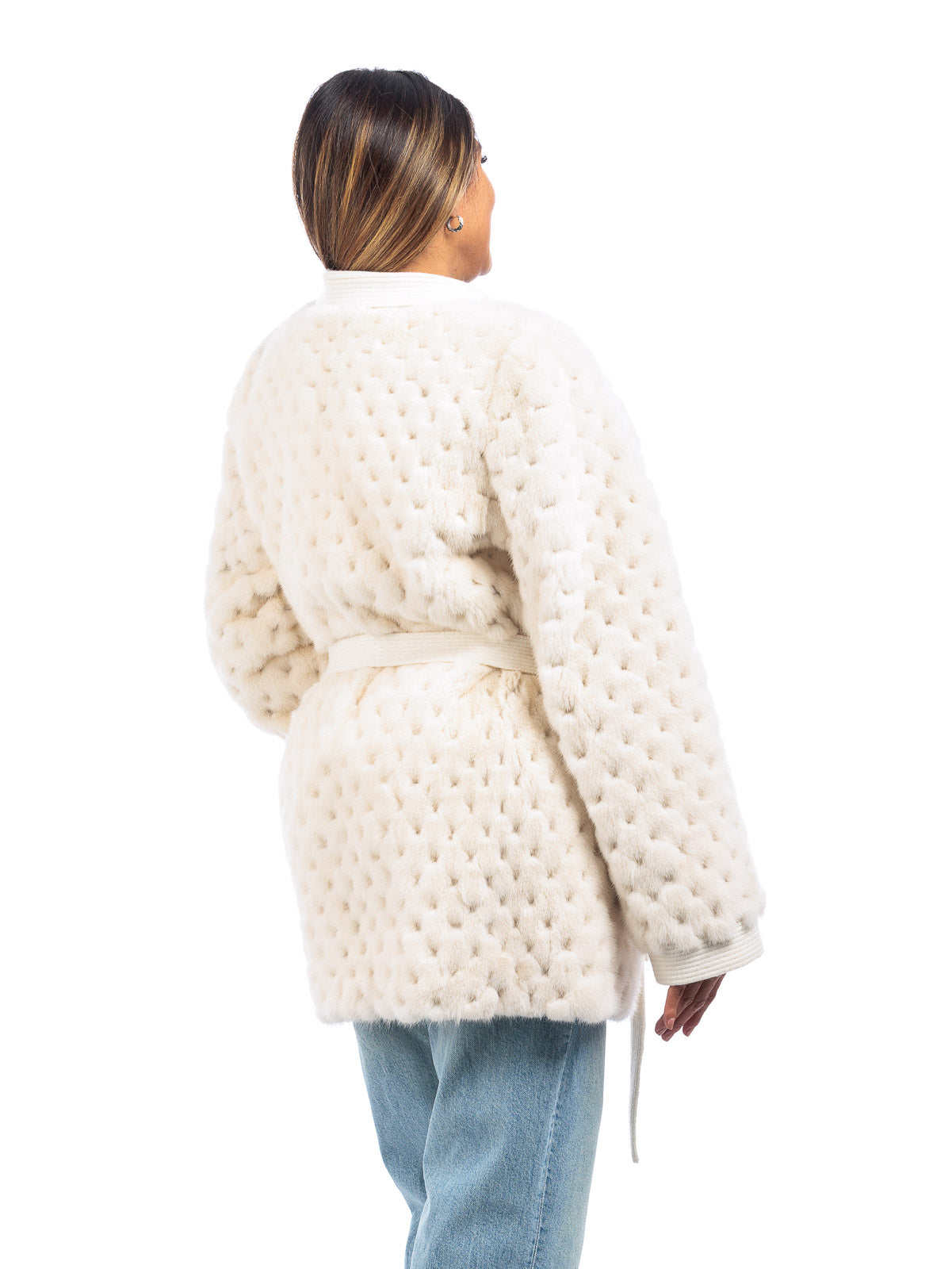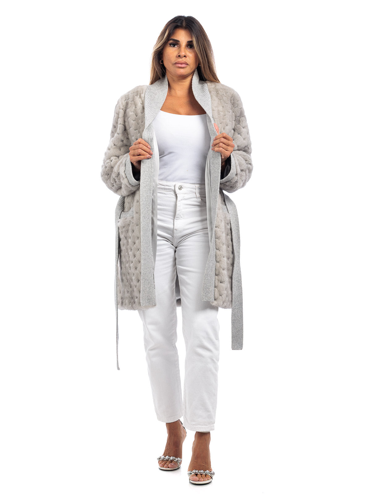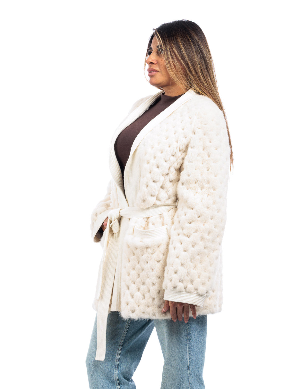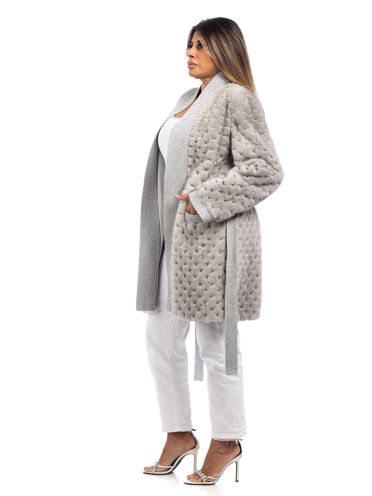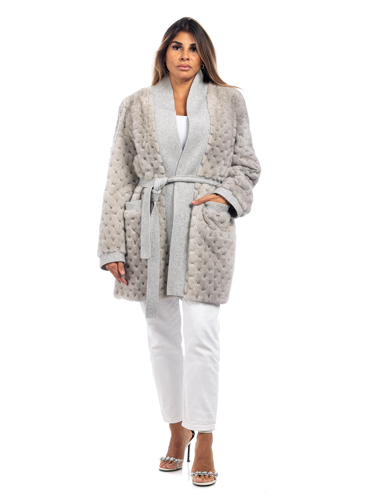 Vestaglia in pelliccia di visone miele con bordo in volpe