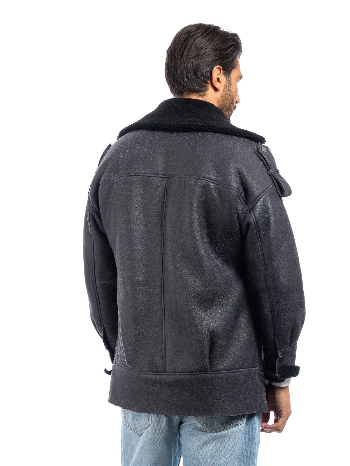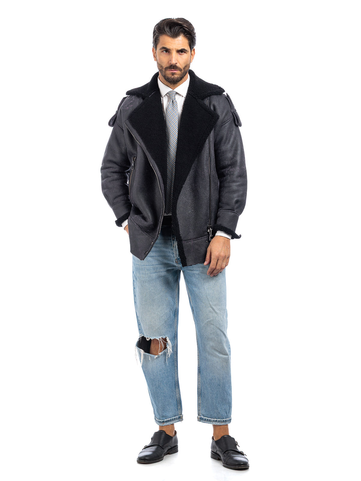 Chiodo nero interamente in montone merinos con zip - linea OVER